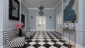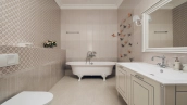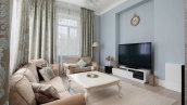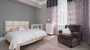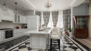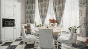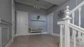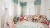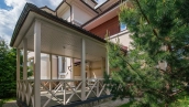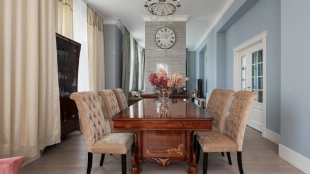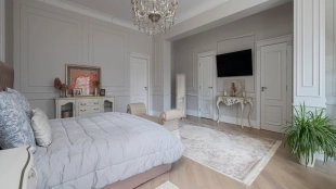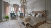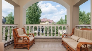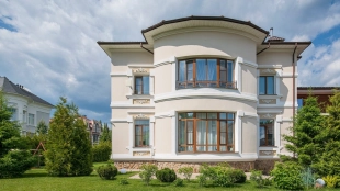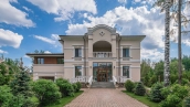 Загородный дом площадью 690 м² построен на просторном полевом участке 22 сотки. Фасад здания облицован штукатуркой бежево-розового цвета, декорирован светлыми балясинами, наличниками и резными элементами. Интерьер с высокими потолками выдержан в классическом стиле с преобладанием пастельных оттенков. В резиденции разместили 5 спален, гостиную, каминную, кухню-столовую и каминный зал. Предусмотрены отдельностоящие баня 160 м² и гараж на 2 машины с квартирой для персонала. На участке выполнен ландшафтный дизайн, вымощены дорожки, высажены кустарники и хвойные деревья, обустроена зона барбекю на уличной веранде.