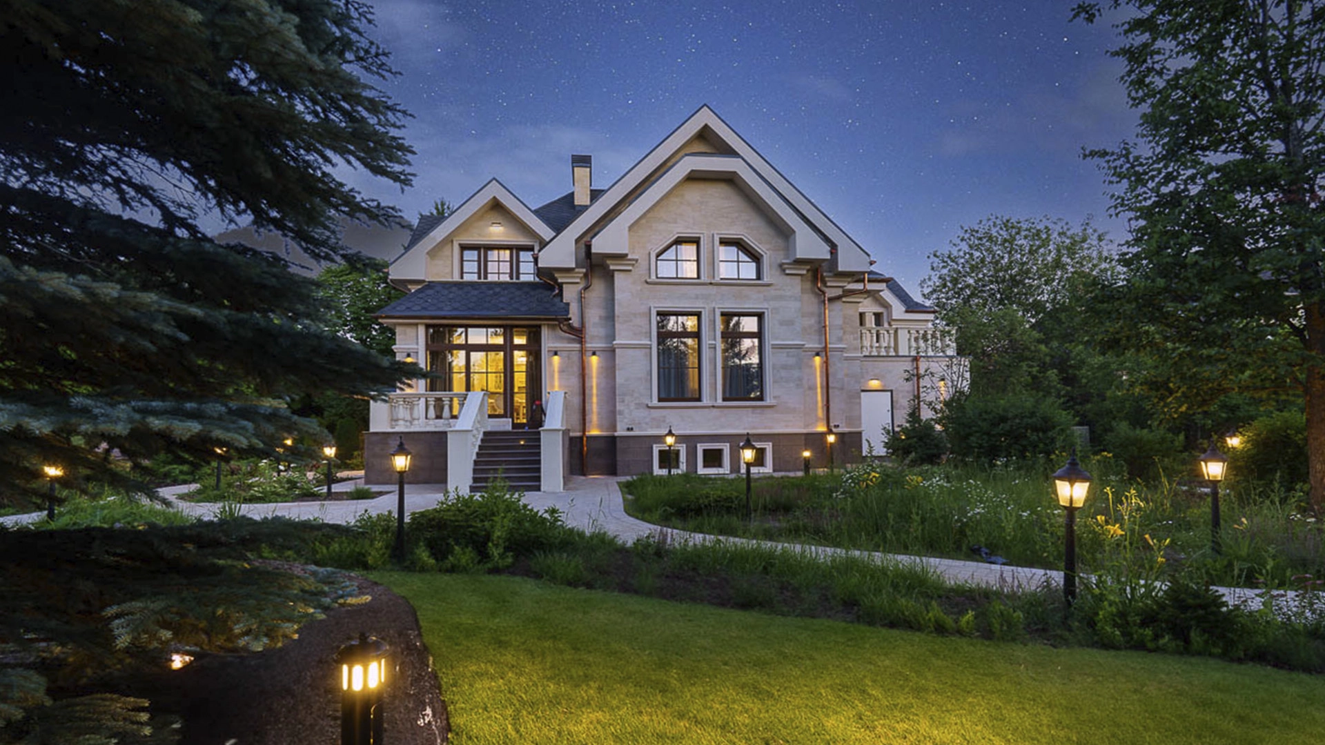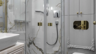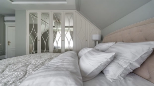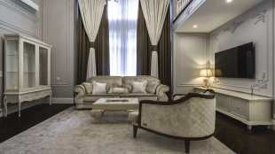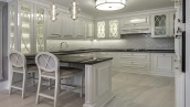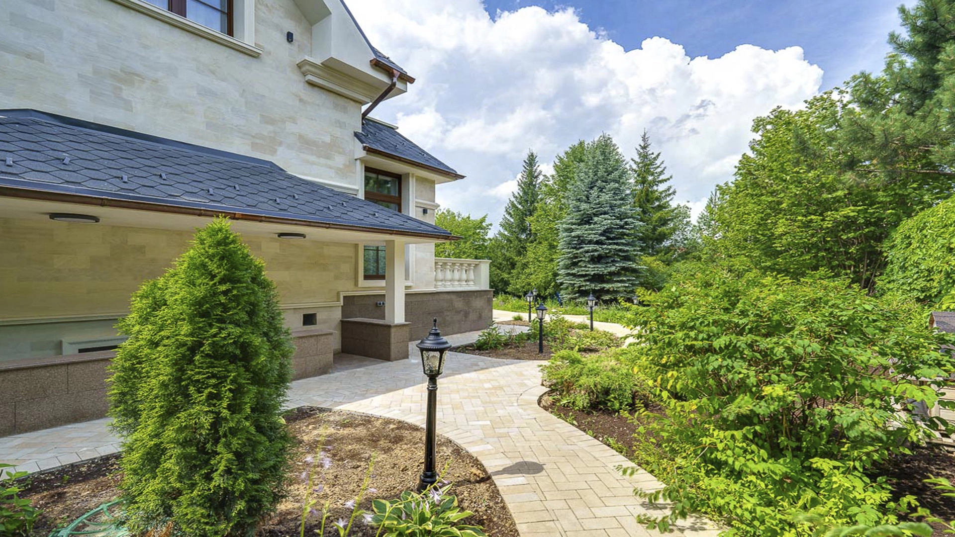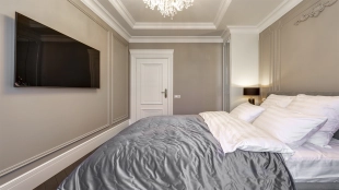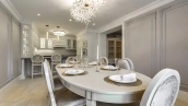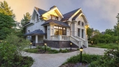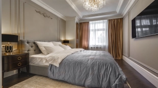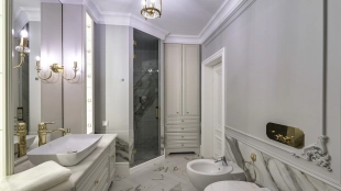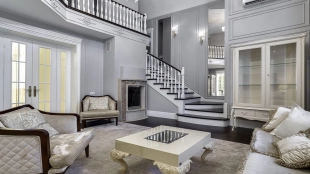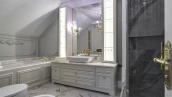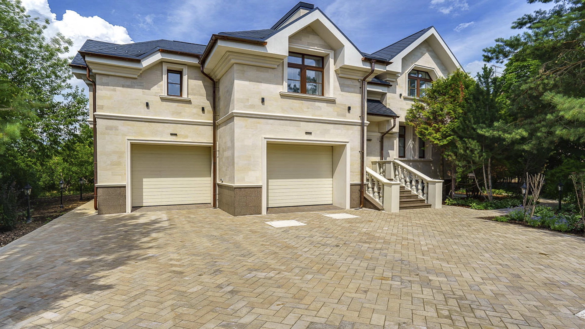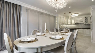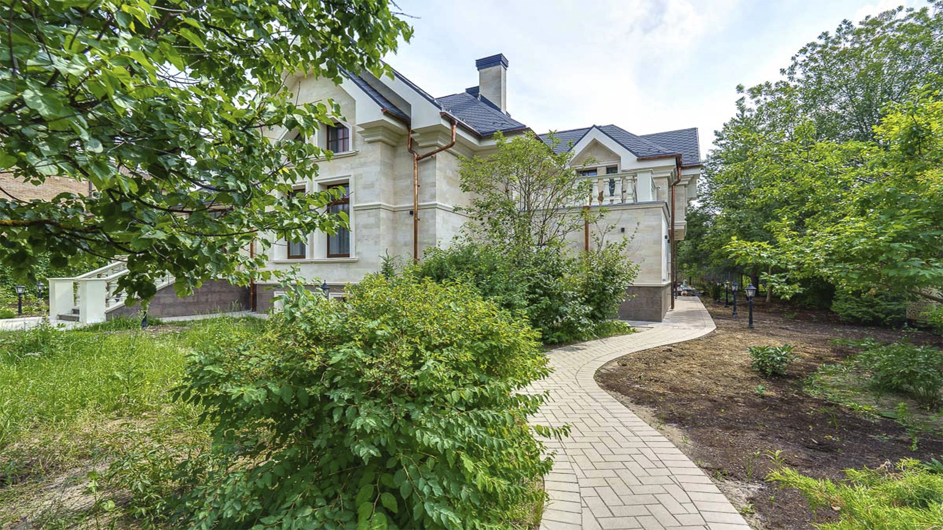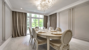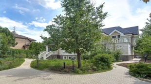 Новый загородный дом площадью 360 м² расположен на прилесном участке 14,7 соток. Фасад выполнен в современном стиле и облицован натуральным камнем. Светлый интерьер с элементами классики оформлен при помощи высококачественных материалов, таких как мрамор и паркетная доска из натурального дуба.