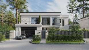 Загородный дом площадью 520 м² по проекту Dream построен на участке 13,1 сотки у леса. Фасад здания с панорамным остеклением выполнен в современном стиле, облицован молочным камнем и декорирован подсветкой. Коттедж без отделки подходит для реализации индивидуальный дизайн-проект, отвечающий каждой потребности. Внутри спланировали несколько спален, гостиную, кухню, гараж и террасу, где можно обустроить зону барбекю. Рядом расположен отдельностоящий гараж на 3 машины с квартирой для персонала на втором этаже общей площадью 118 м². На участке выполнен ландшафтный дизайн, засеян газон и вымощены дорожки.