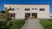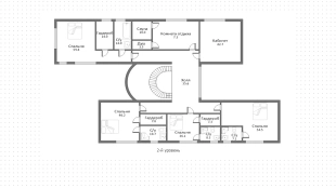 В двухэтажном особняке два крыла, соединенных холлом и парадной лестницей. Планировка включает просторную гостиную, 4 спальни, кабинет и SPA-зону с комнатой отдыха и сауной. Также в контуре дома предусмотрен гараж площадью 35,9 м². Рядом с основным зданием под навесом оборудован открытый бассейн. На участке засеян газон, растут деревья, придомовая территория вымощена брусчаткой.