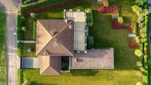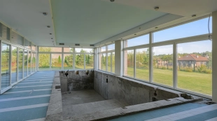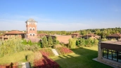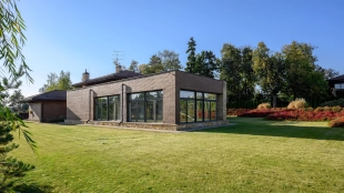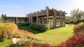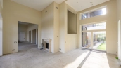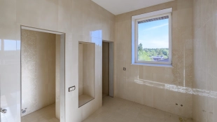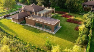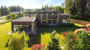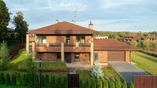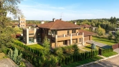 Загородный дом площадью 735 м² построен на участке 34 сотки в центре поселка. Современный фасад облицован клинкерным кирпичом терракотового и светло-бежевого оттенков. Благодаря высоким потолкам и панорамному остеклению пространство наполнено естественным светом и теплом. Коттедж без отделки позволяет реализовать индивидуальный дизайн-проект.