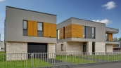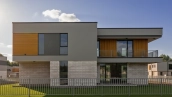Загородный дом площадью 363 м² построен на полевом участке 11,6 соток. Фасад выполнен в современном стиле и облицован белой штукатуркой, клинкерной плиткой и декорирован вставками под дерево. Коттедж представлен без отделки, что позволяет реализовать индивидуальный дизайн-проект. Участок с газоном окружен изгородью.