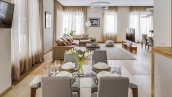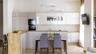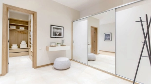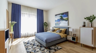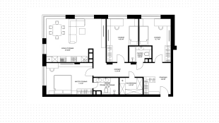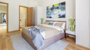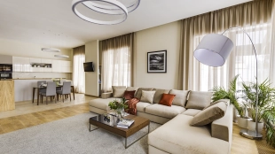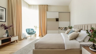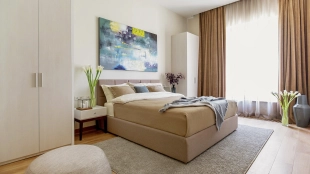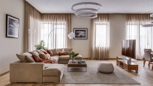 Квартира площадью 106 м² расположена на четвертом этаже шестиэтажного дома. В отделке современного интерьера использованы светлые и теплые оттенки в сочетании с фактурой дерева, создающие атмосферу уюта. Планировка квартиры включает мастер-спальню с санузлом, 2 спальни и кухню-гостиную.