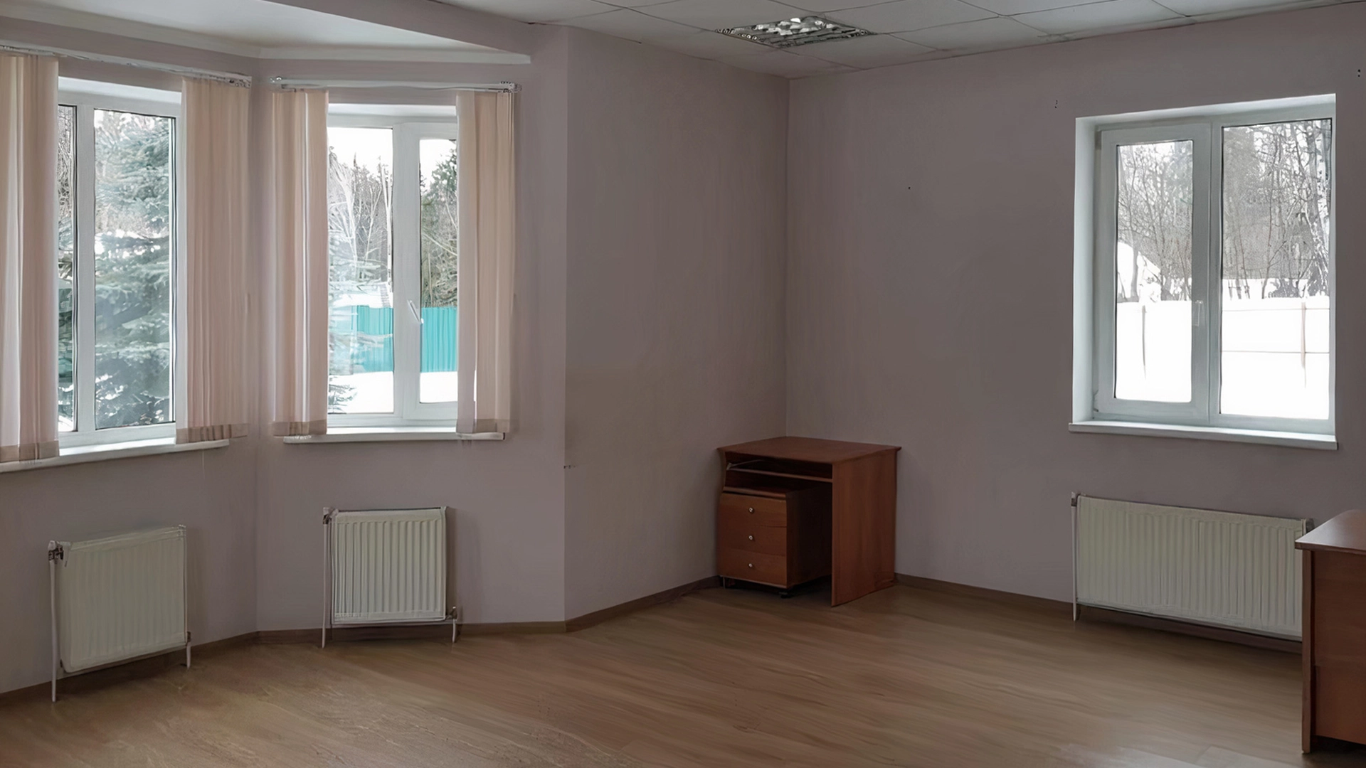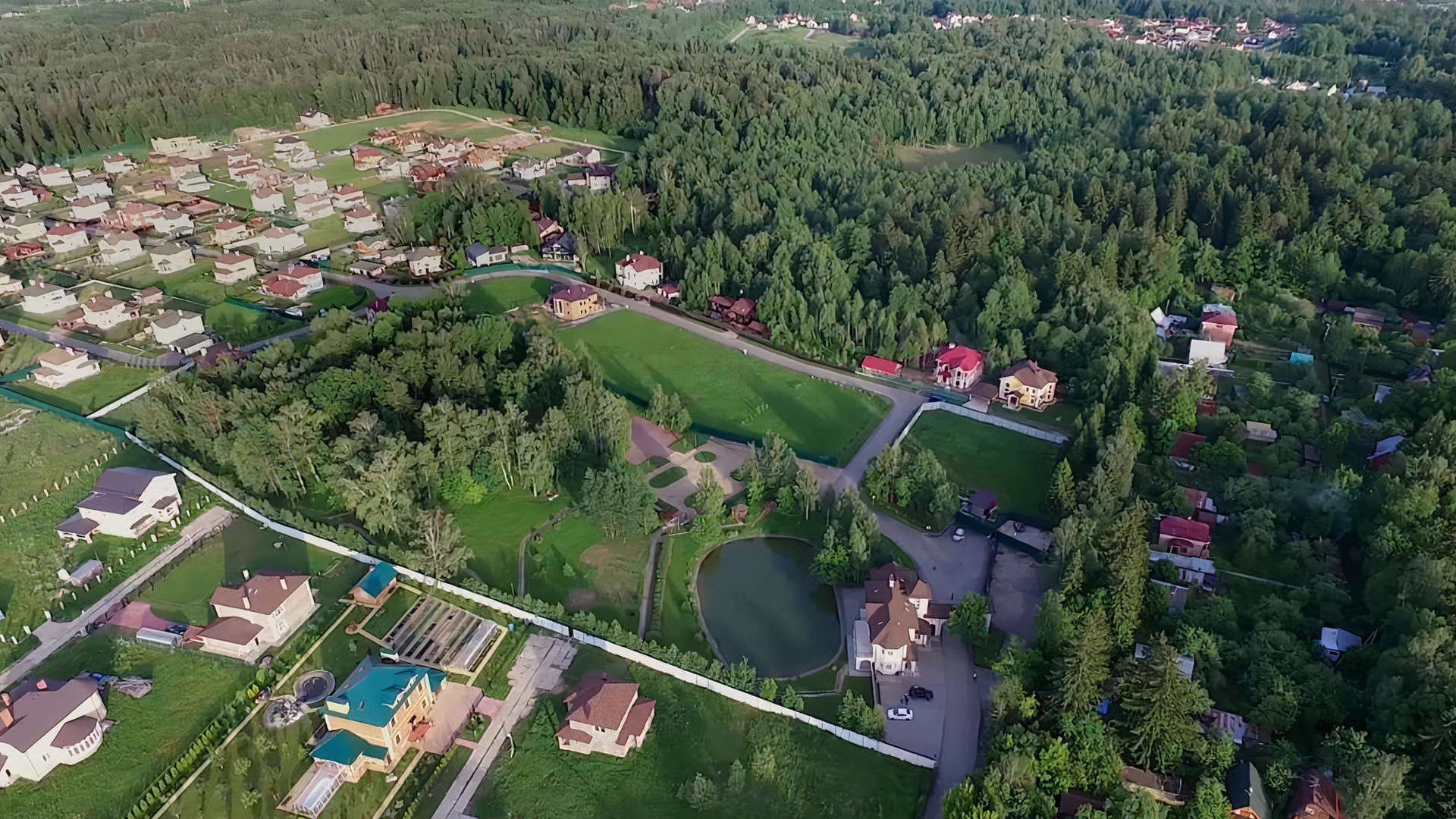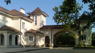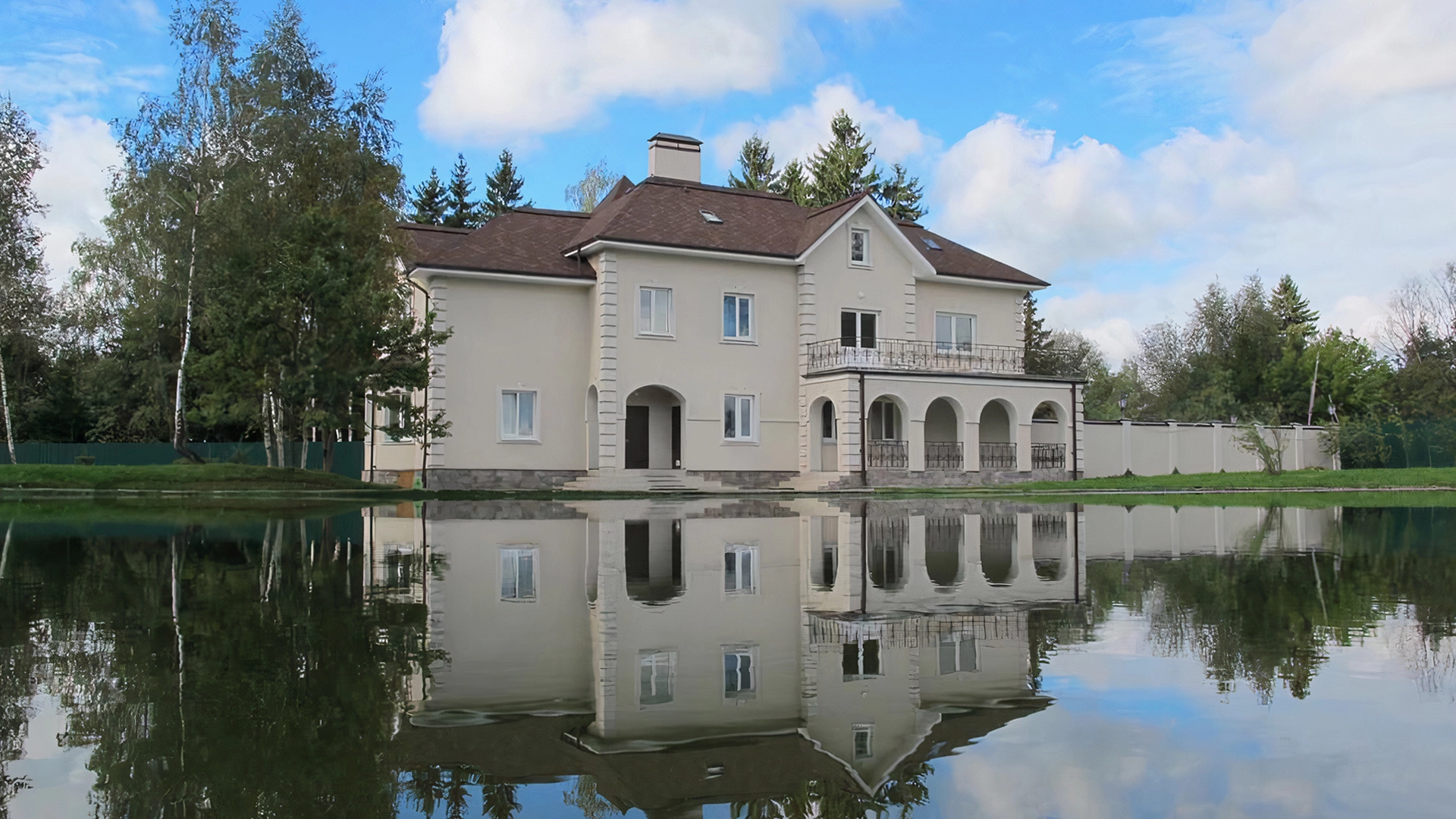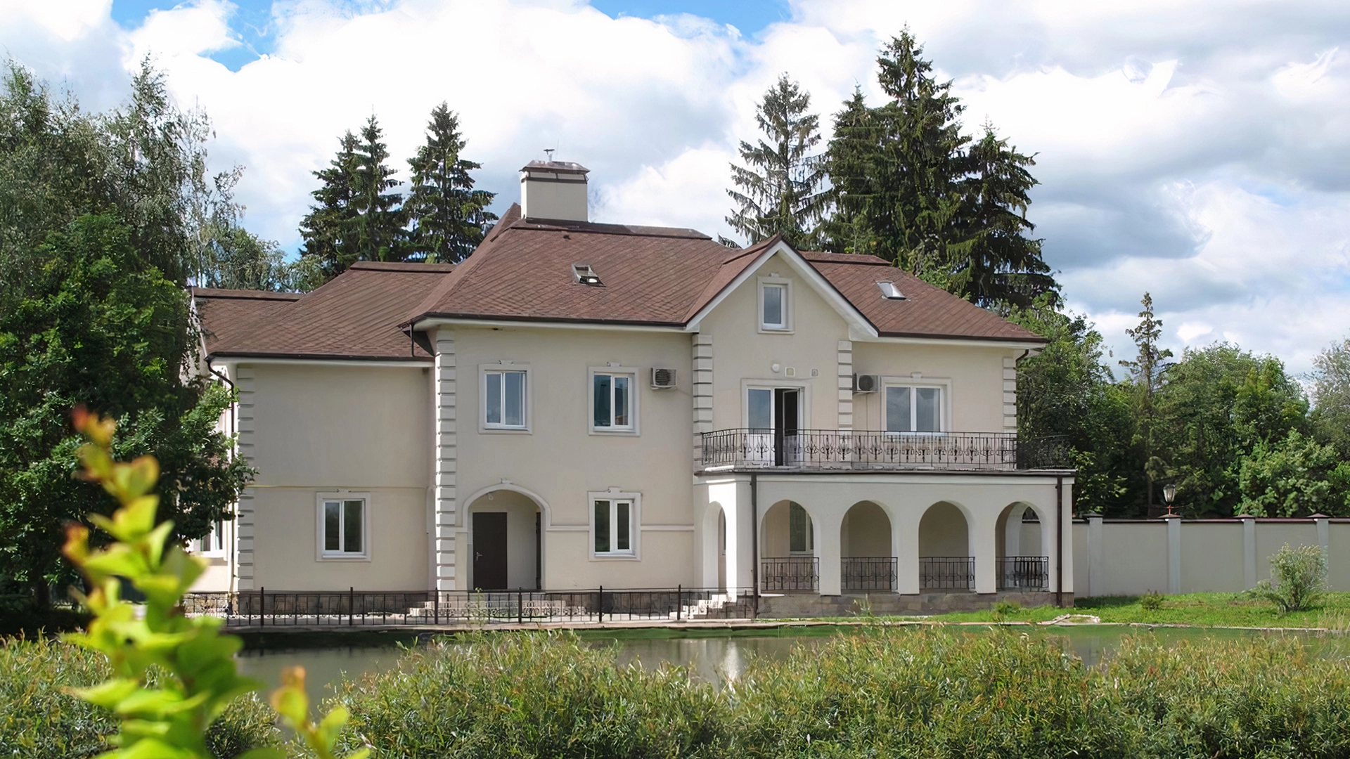 Загородный дом площадью 423 м² построен на просторном прилесном участке 51 сотка с собственным озером. Фасад с изящными столбами и арками облицован бежевой штукатуркой, декорирован белыми элементами и искусственным камнем. Внутри выполнена офисная отделка в теплых оттенках. В резиденции можно разместить до 6 спален, кухню, гостиную и комнату для персонала с отдельным входом. На участке с ландшафтным дизайном вымощена площадка перед домом и засеян газон.