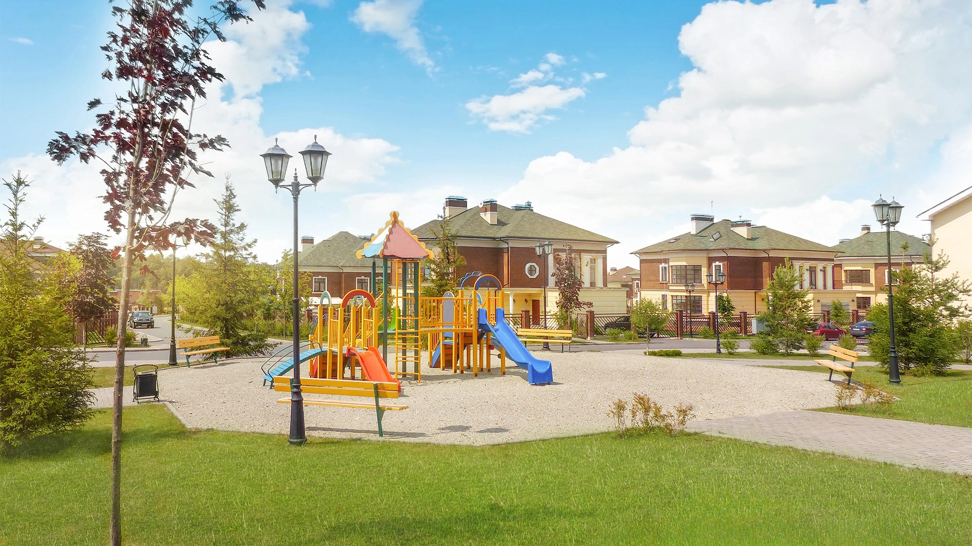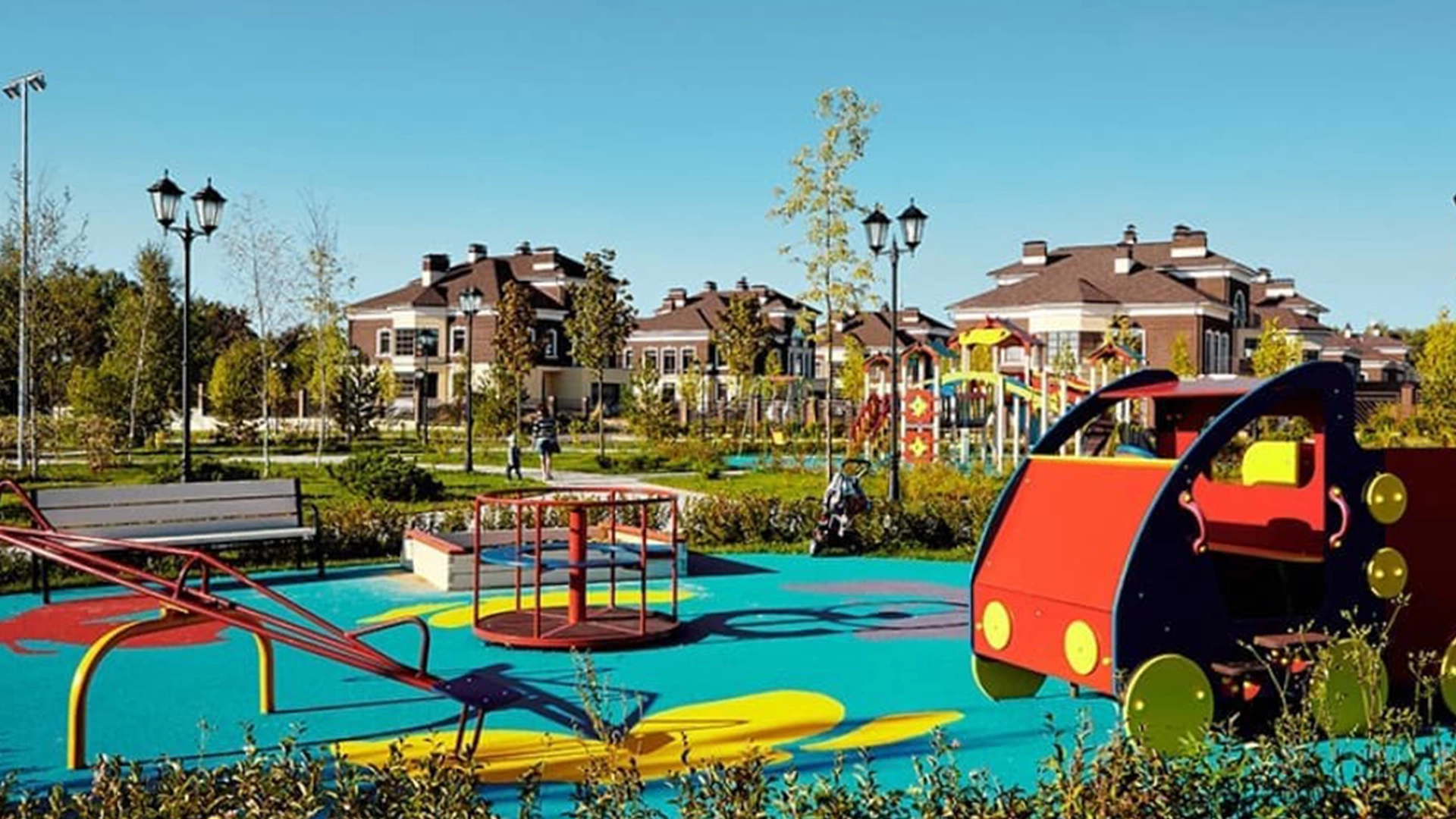 На территории посёлка есть охраняемый КПП, гостевая парковка, дороги с освещением, детская площадка, спортивная зона и прогулочные аллеи.