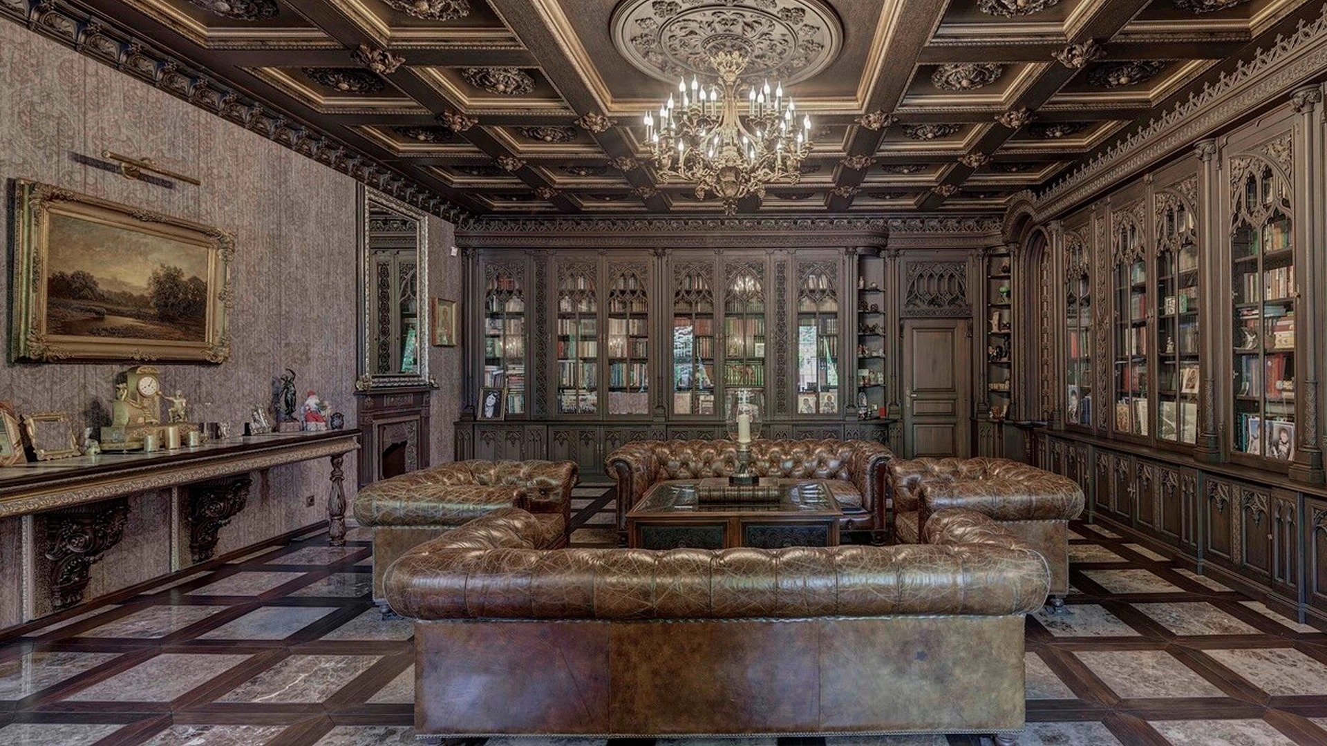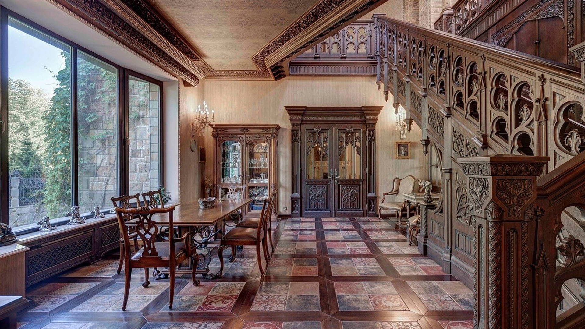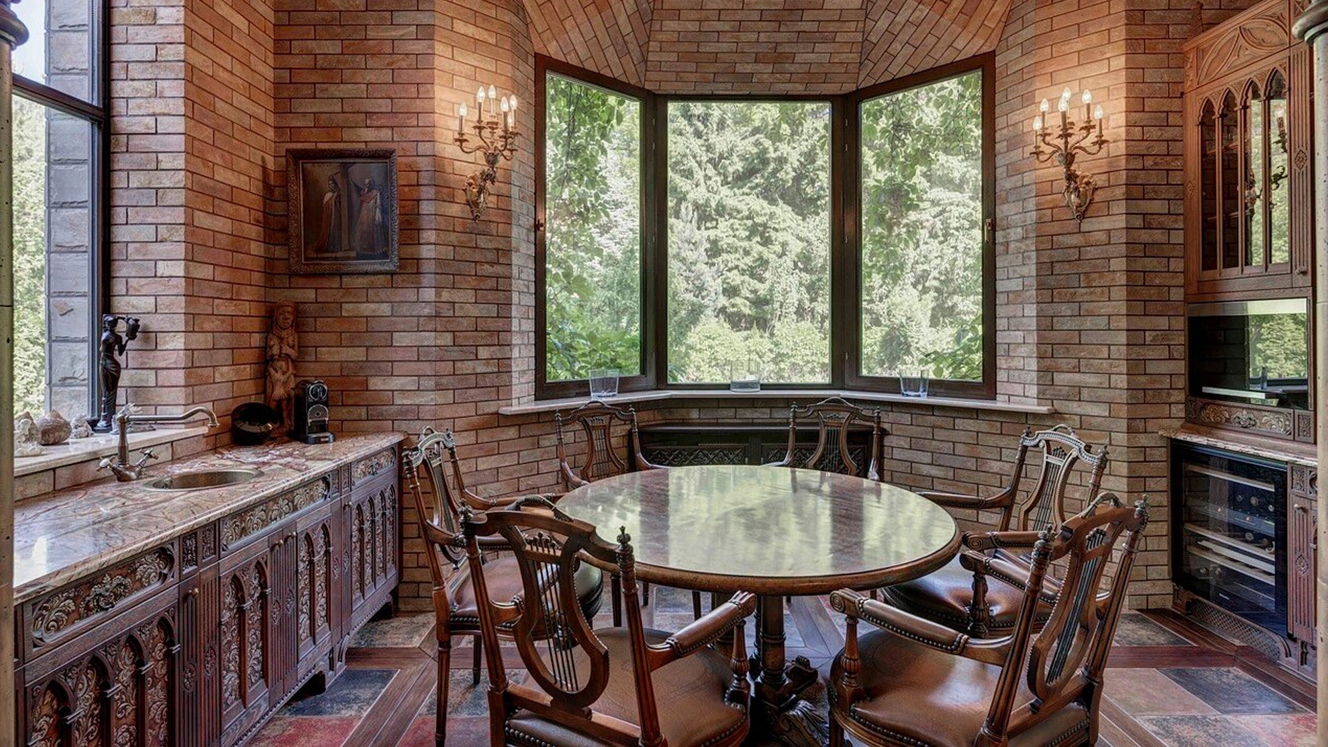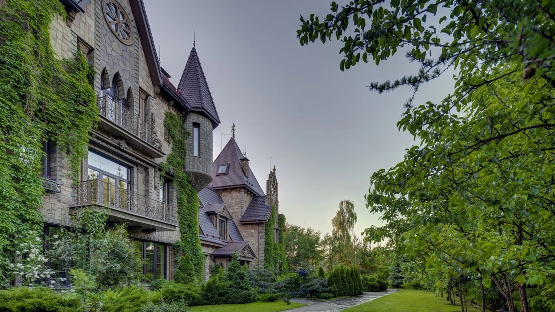 Премиальная загородная резиденция в стиле готического замка расположена на лесном участке 80 соток. Дом раскинулся на площади 2 500 м² — внутри выполнена эксклюзивная отделка с использованием натурального мрамора и дерева ценных пород. Резная деревянная мебель выполнена на заказ во Франции, Италии, Англии и США. В доме спланировано 5 спален с санузлами и гардеробными, просторные гостевые зоны, чистовая кухня, каминный зал, зимний сад, спа-зона с 20-метровым бассейном и тренажерный зал на мансардном этаже.