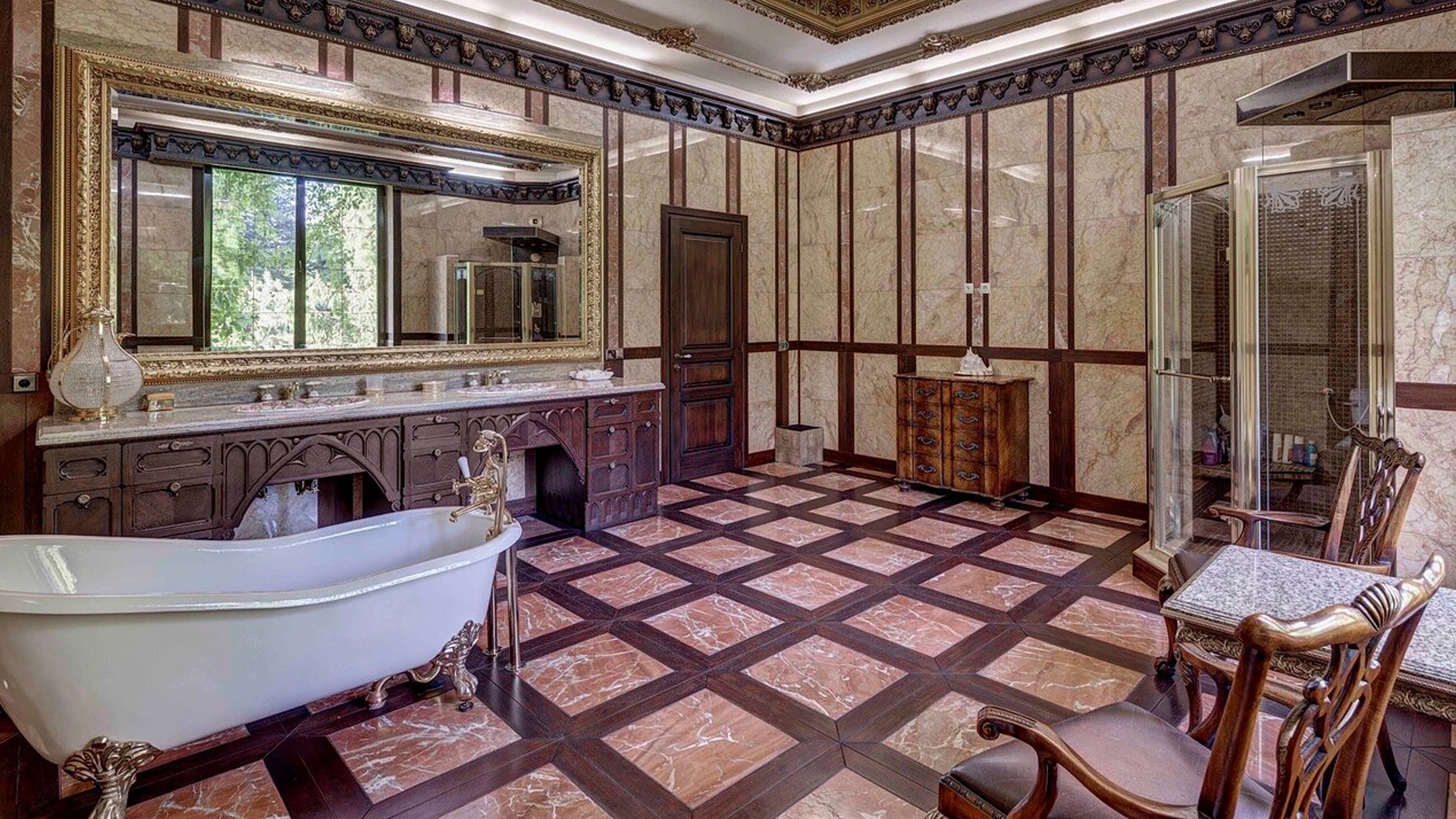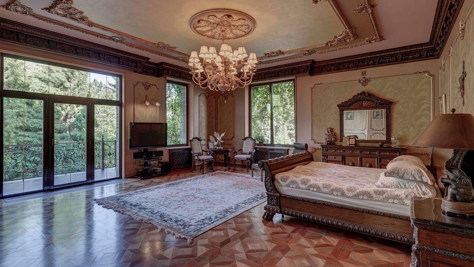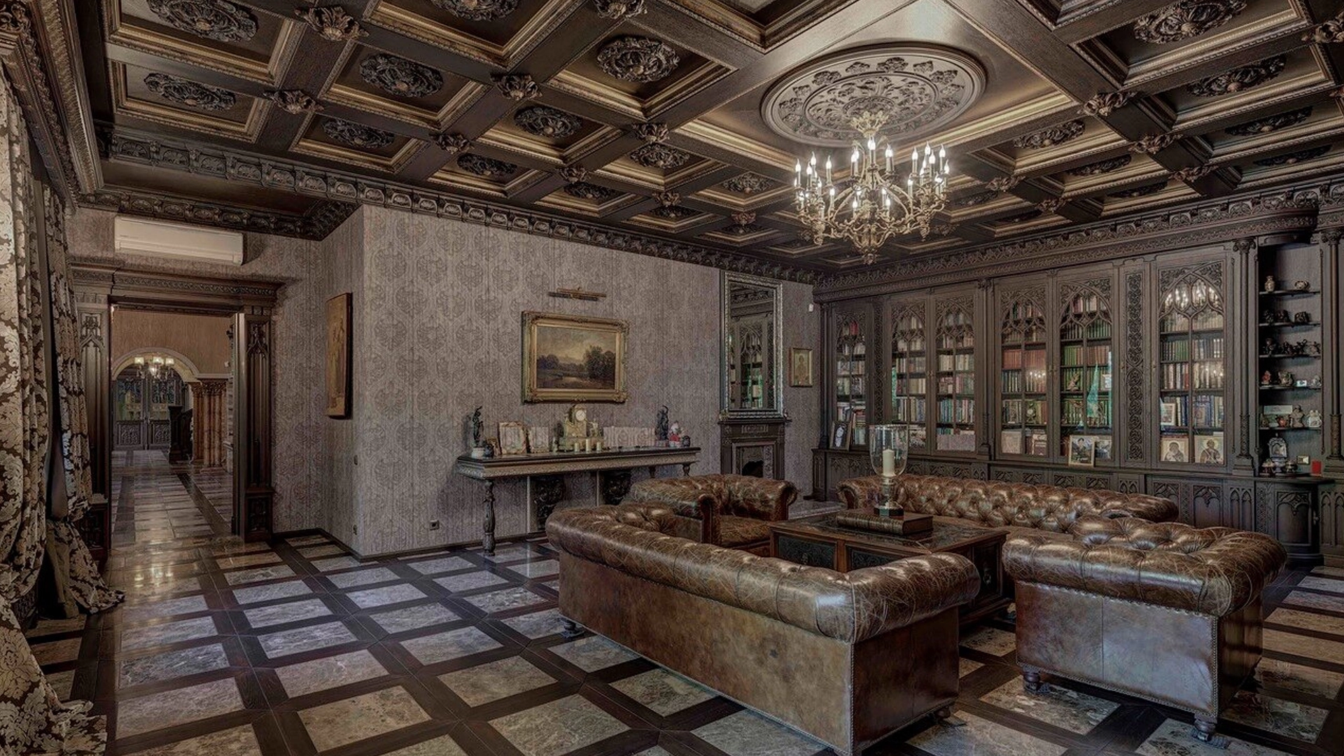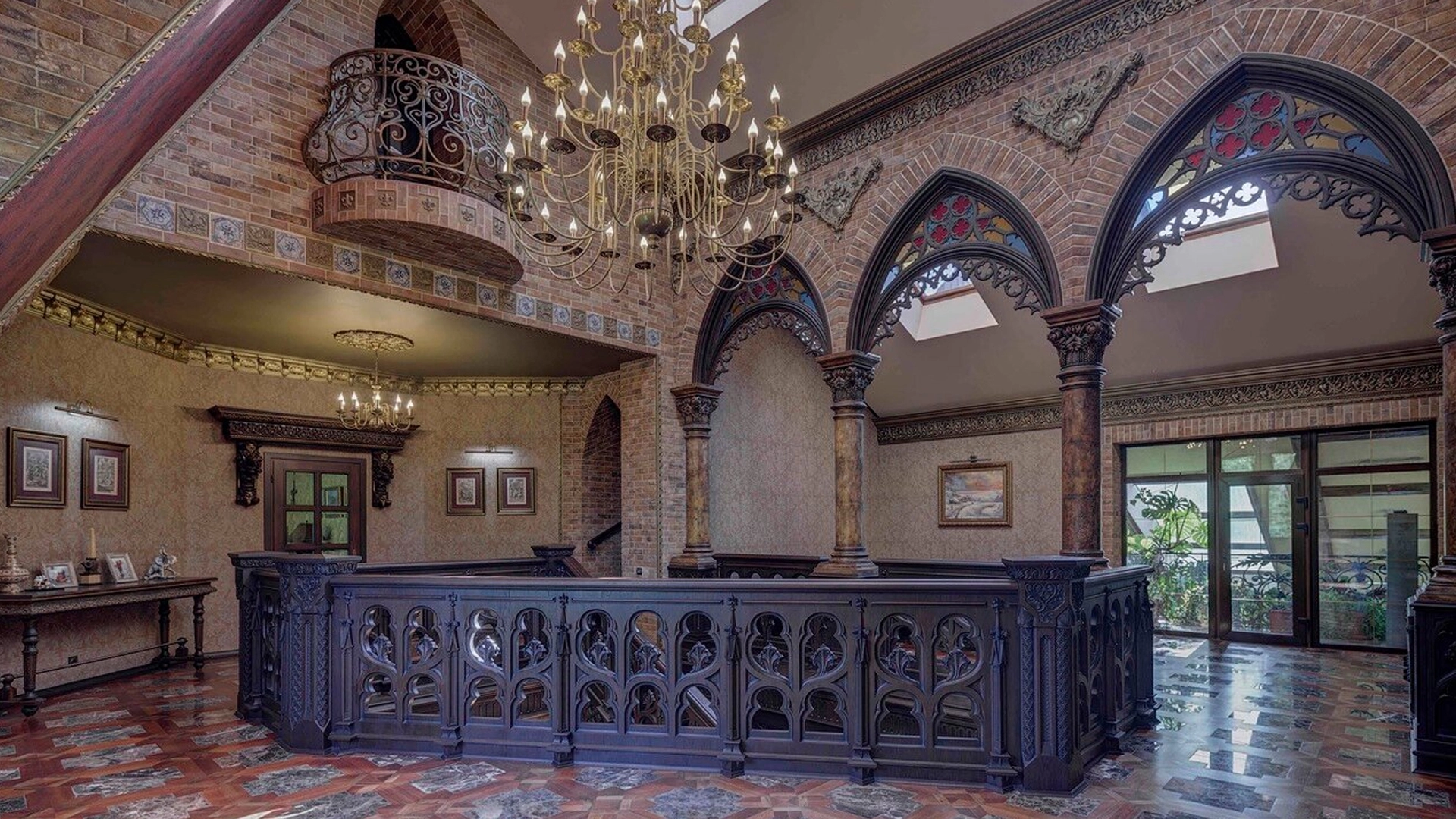 Премиальная загородная резиденция в стиле готического замка расположена на лесном участке 80 соток. Дом раскинулся на площади 2 500 м² — внутри выполнена эксклюзивная отделка с использованием натурального мрамора и дерева ценных пород. Резная деревянная мебель выполнена на заказ во Франции, Италии, Англии и США. В доме спланировано 5 спален с санузлами и гардеробными, просторные гостевые зоны, чистовая кухня, каминный зал, зимний сад, спа-зона с 20-метровым бассейном и тренажерный зал на мансардном этаже.