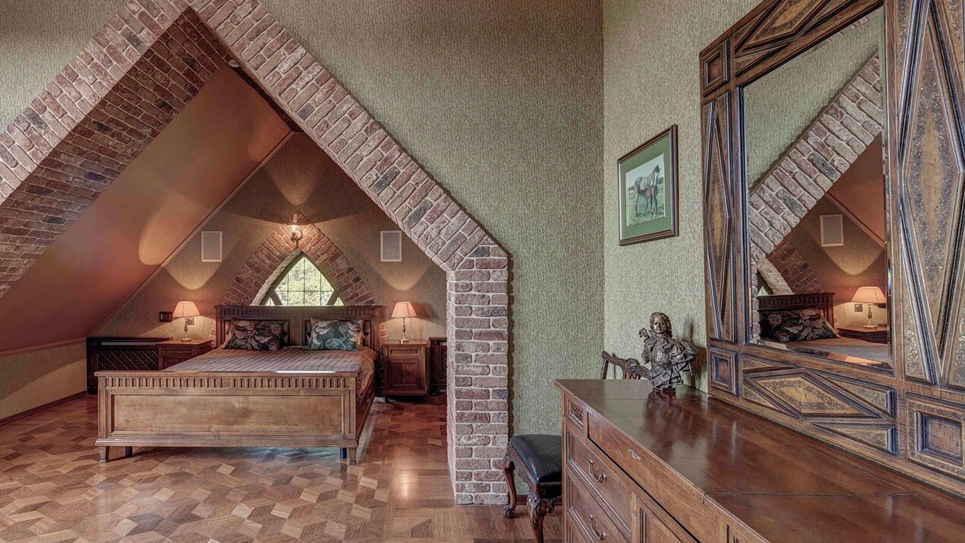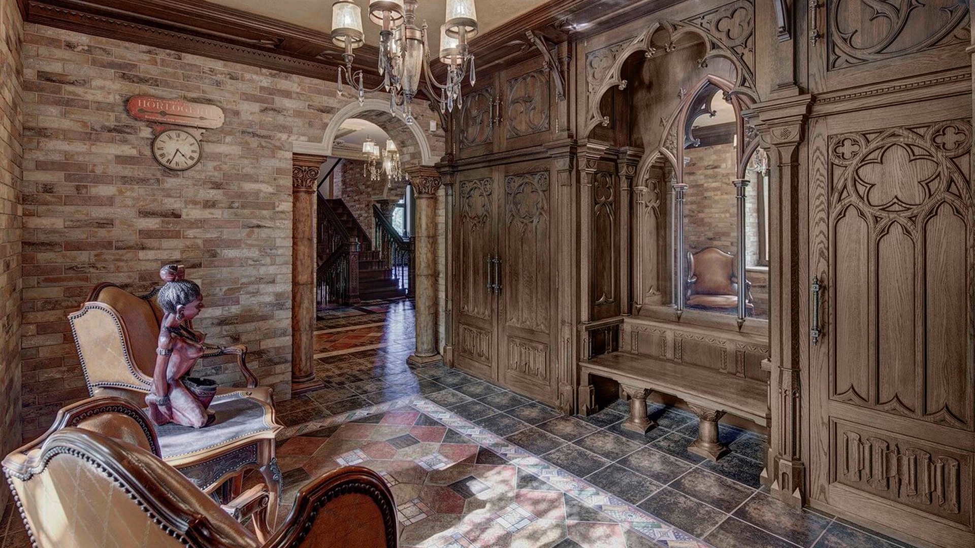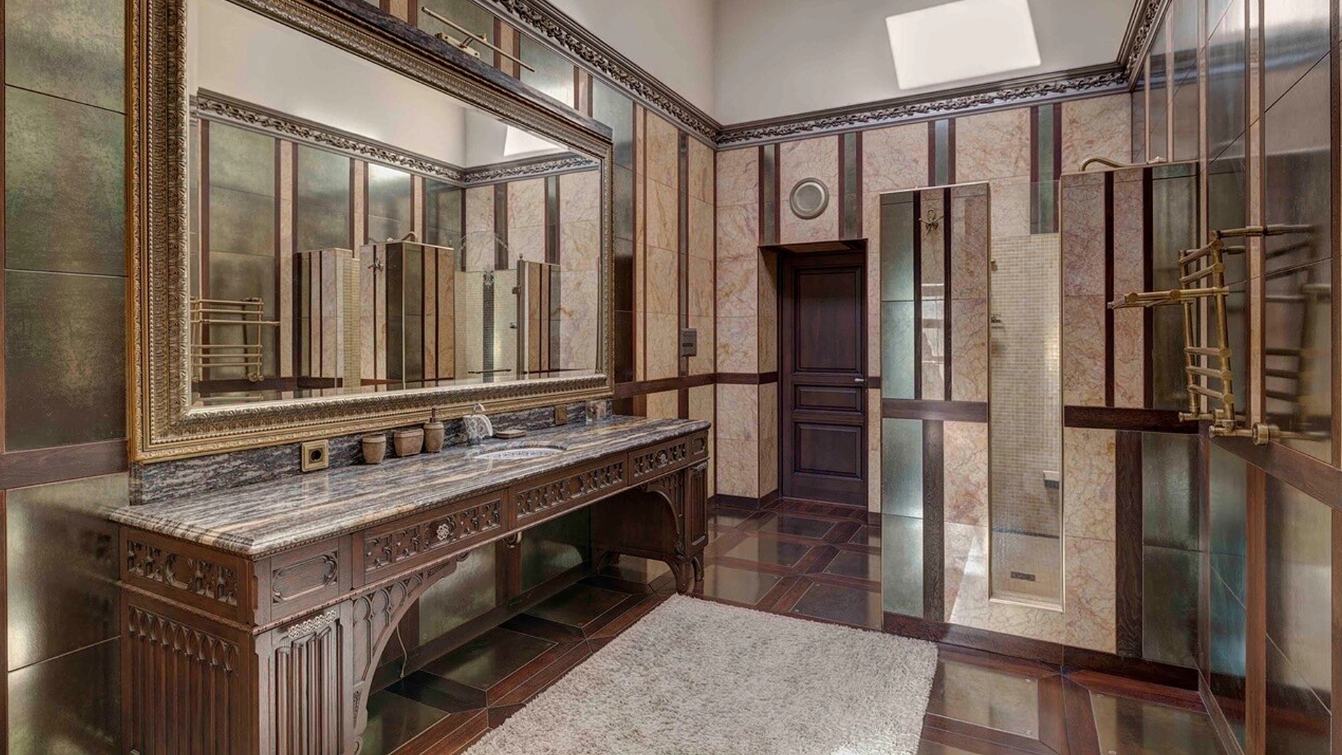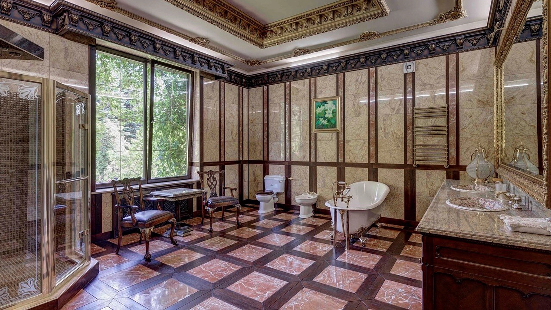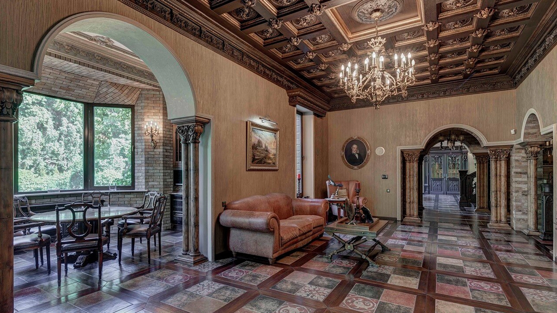 Премиальная загородная резиденция в стиле готического замка расположена на лесном участке 80 соток. Дом раскинулся на площади 2 500 м² — внутри выполнена эксклюзивная отделка с использованием натурального мрамора и дерева ценных пород. Резная деревянная мебель выполнена на заказ во Франции, Италии, Англии и США. В доме спланировано 5 спален с санузлами и гардеробными, просторные гостевые зоны, чистовая кухня, каминный зал, зимний сад, спа-зона с 20-метровым бассейном и тренажерный зал на мансардном этаже.