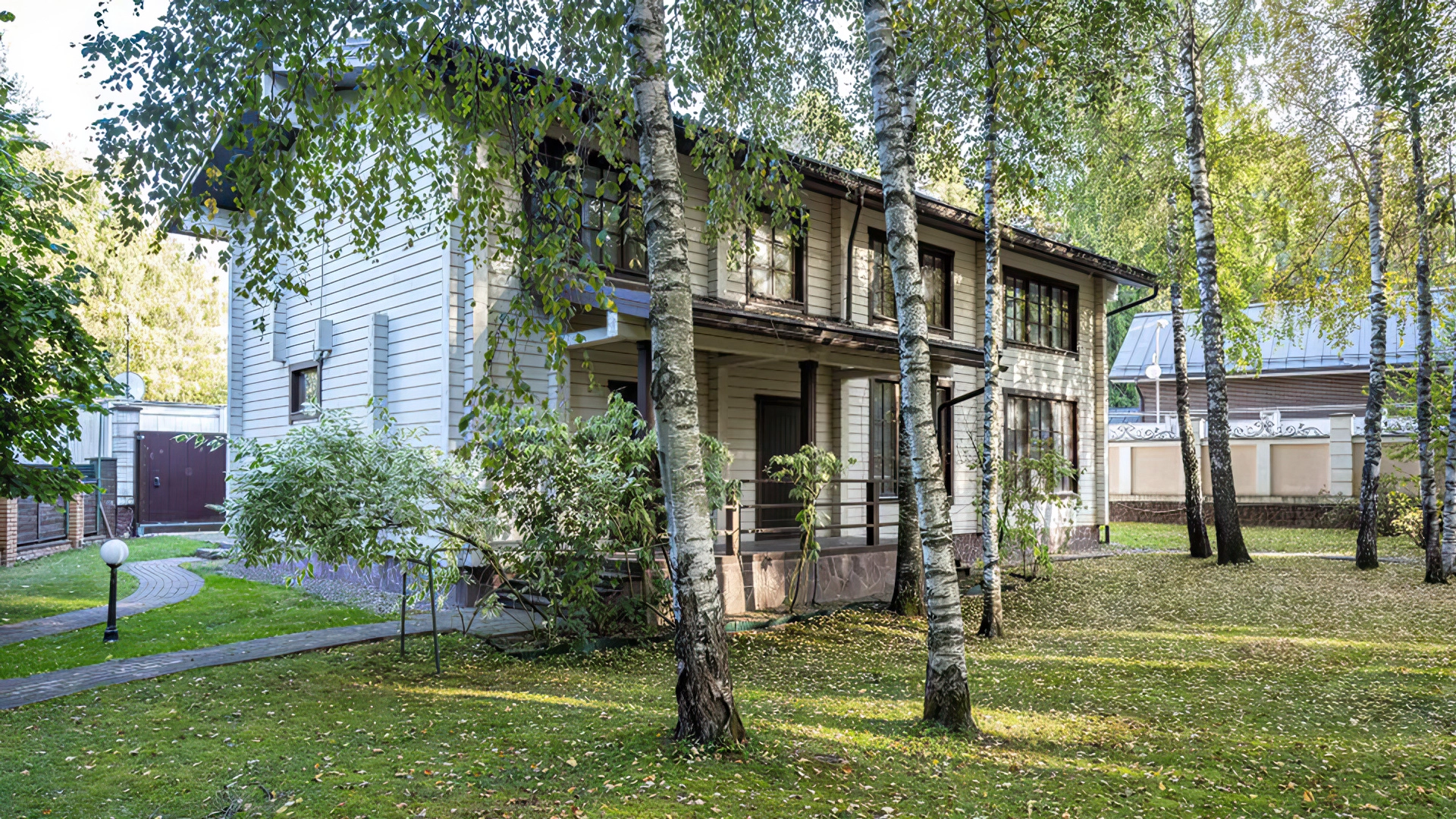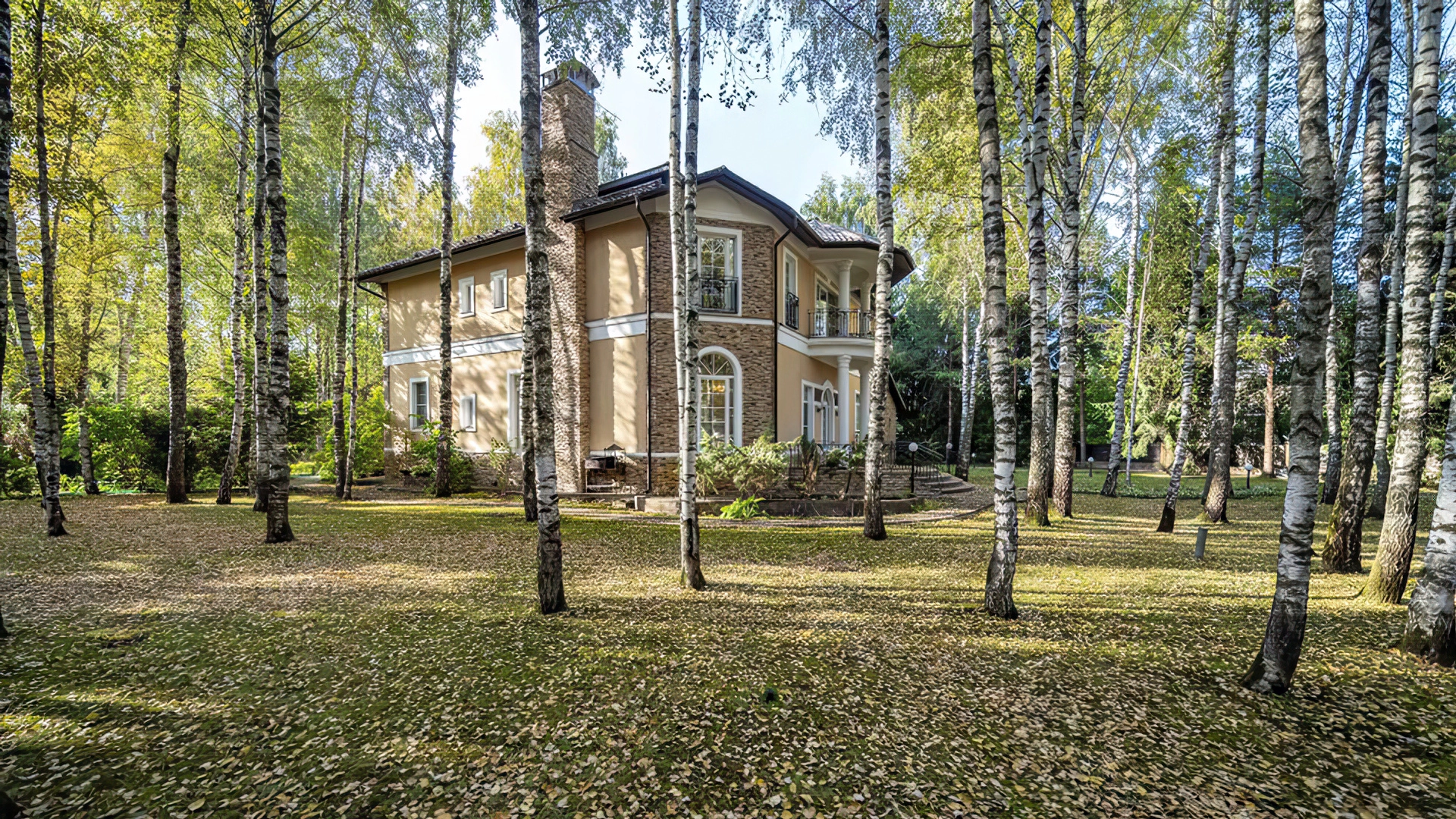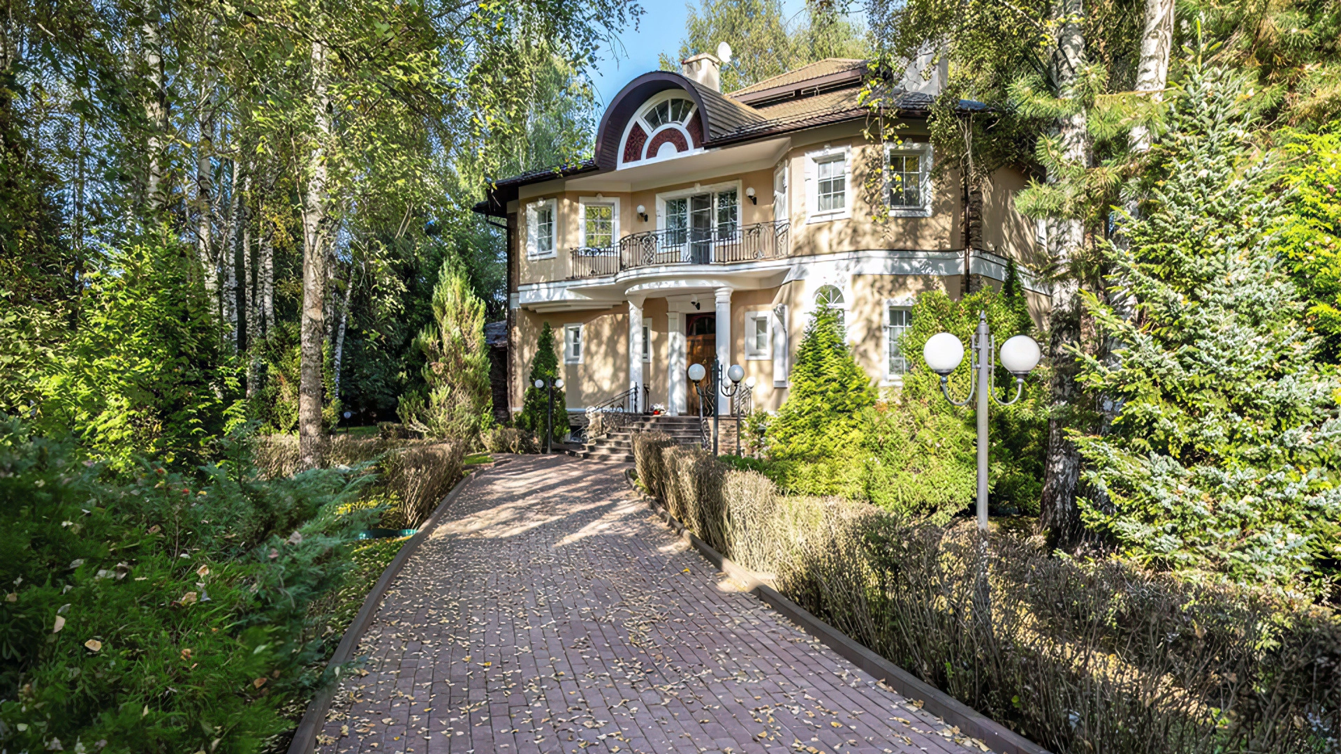 Уютная резиденция в неоклассическом стиле на участке 43 сотки с молодыми березами и ландшафтным дизайном. Светло-бежевый фасад дома облицован камнем, украшен колоннами и фигурным кованым парапетом. Интерьер выполнен в классическом стиле в бежевых тонах — кухню и санузлы оборудовали техникой, оформили мрамором, гранитом и ценными породами дерева. Гостиную с камином и спальни обставили массивной резной деревянной мебелью.