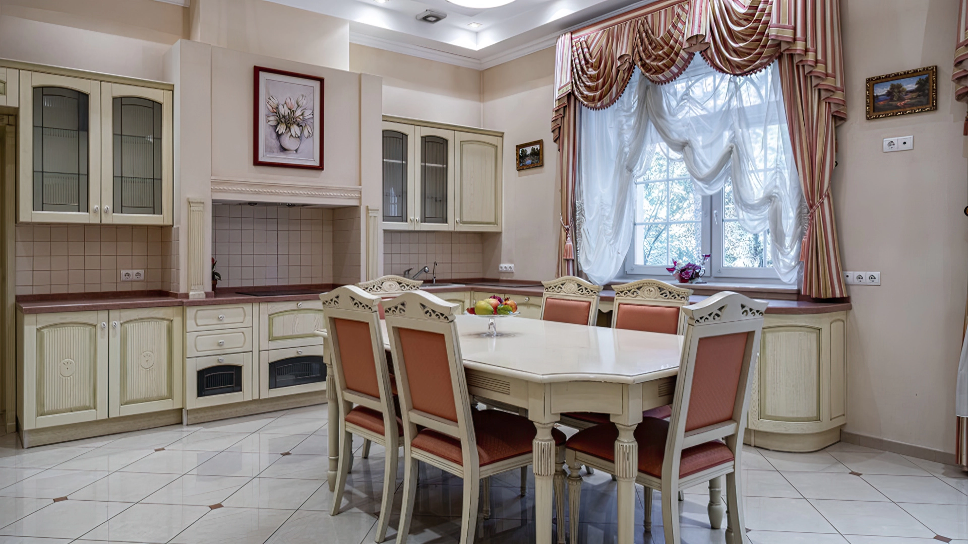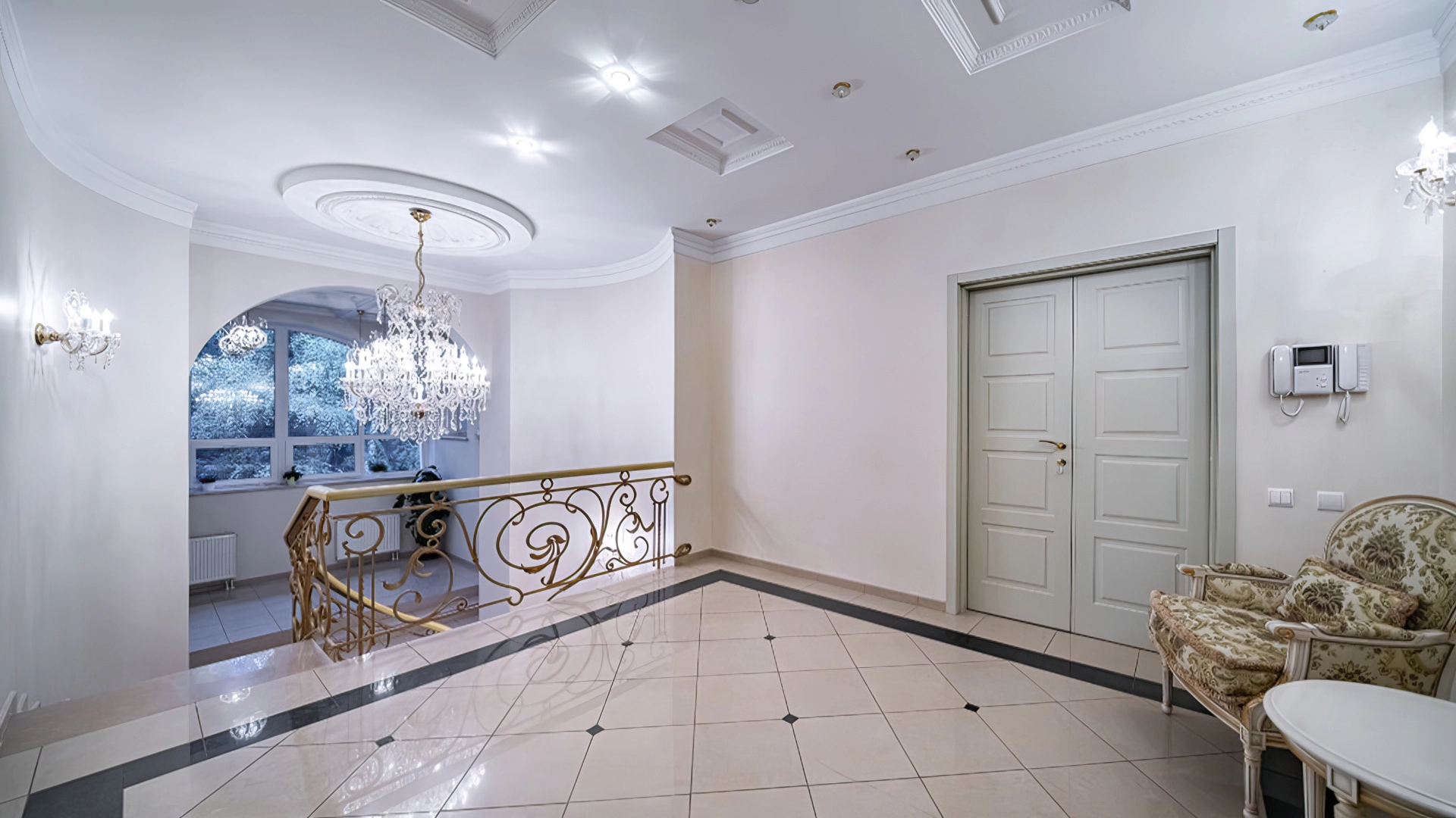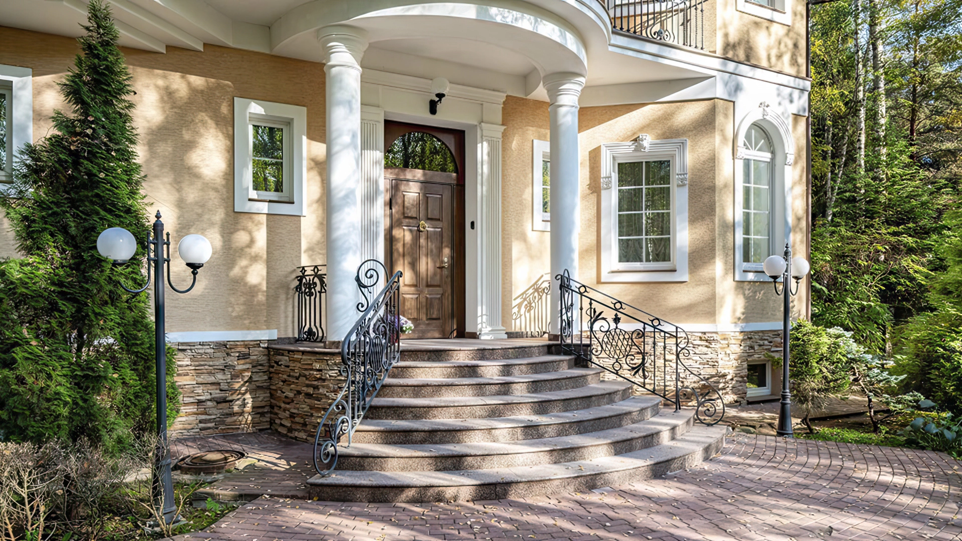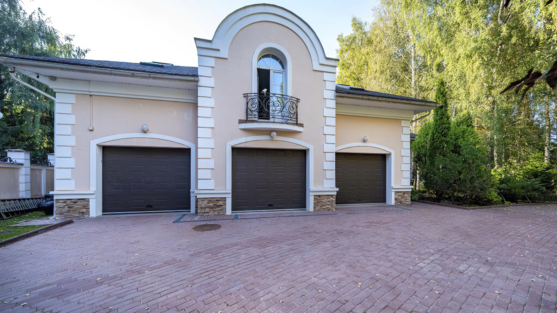 Уютная резиденция в неоклассическом стиле на участке 43 сотки с молодыми березами и ландшафтным дизайном. Светло-бежевый фасад дома облицован камнем, украшен колоннами и фигурным кованым парапетом. Интерьер выполнен в классическом стиле в бежевых тонах — кухню и санузлы оборудовали техникой, оформили мрамором, гранитом и ценными породами дерева. Гостиную с камином и спальни обставили массивной резной деревянной мебелью.