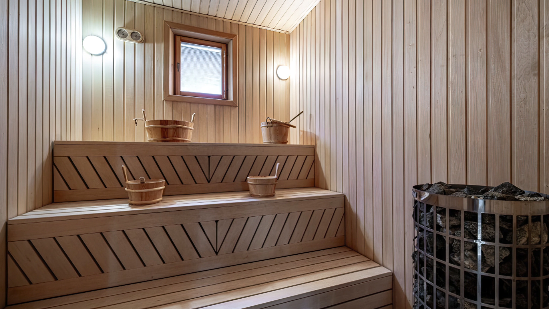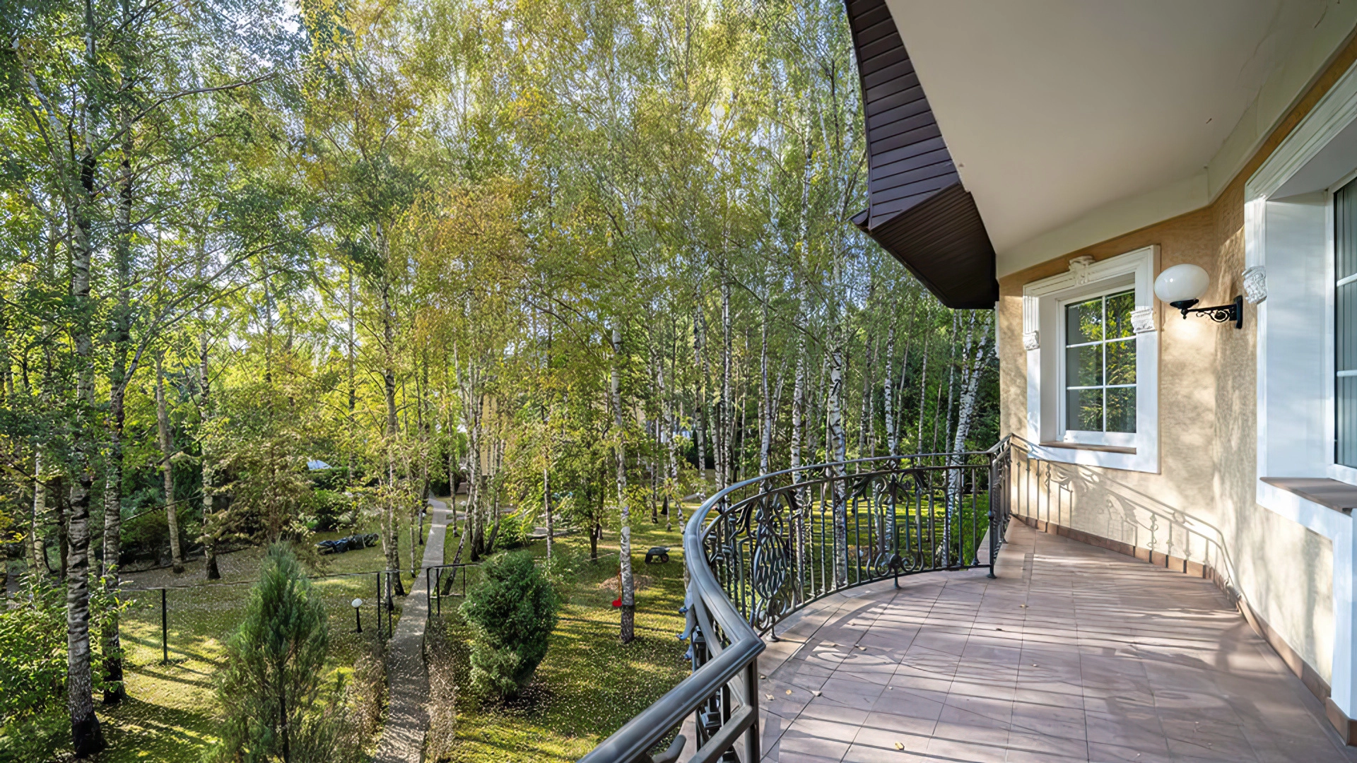 На участке у дома дорожки вымостили брусчаткой, провели освещение и установили систему автополива, постелили газон. В тени берез и плодовых деревьев построили ротонду для отдыха и гостевой дом 300 м² из клееного бруса — на первом этаже гараж для машины и кухня с гостиной. На втором — спальня и спортзал.