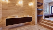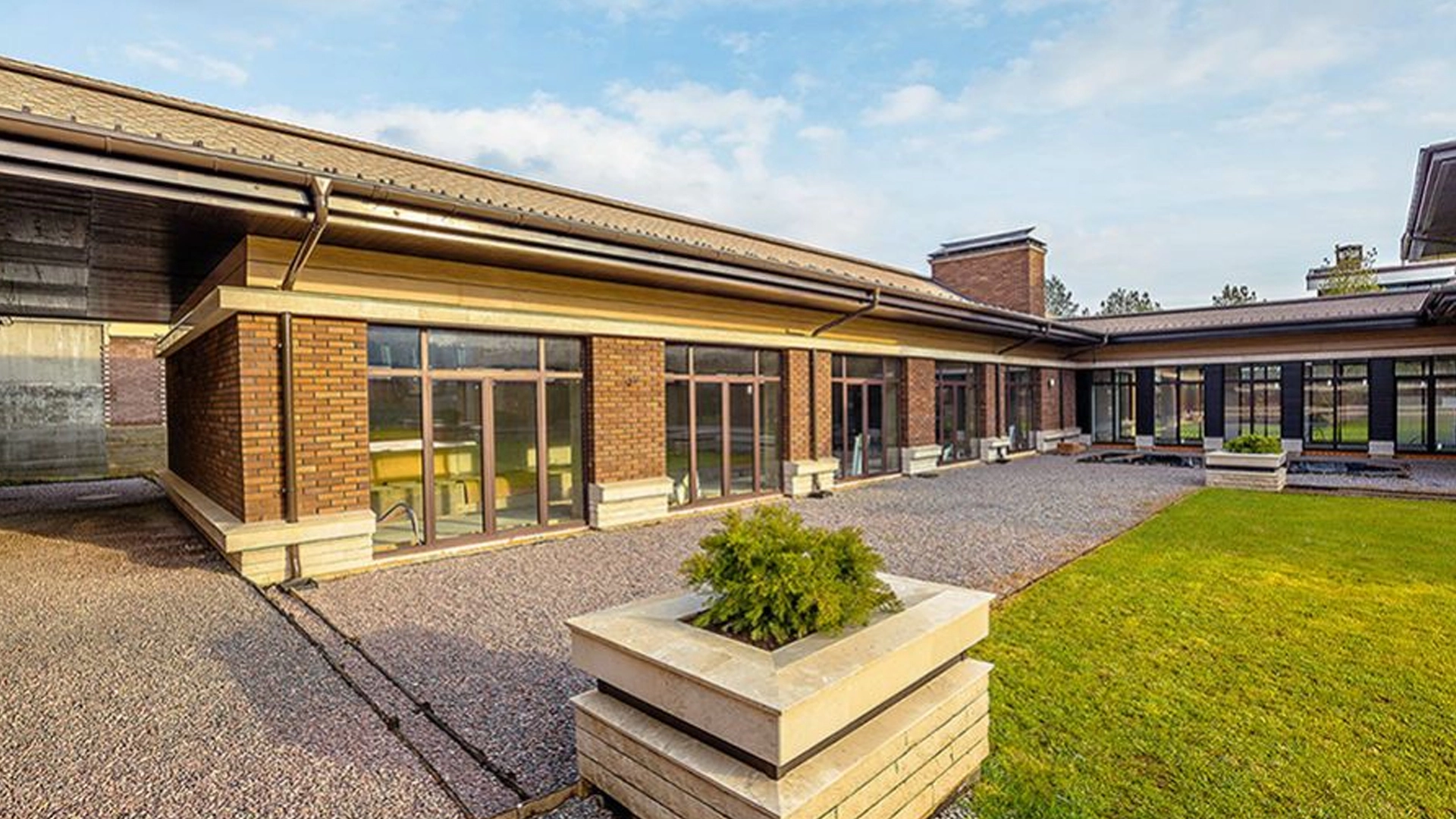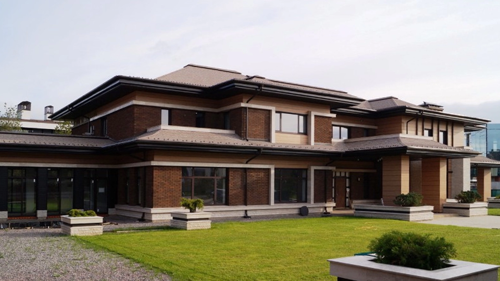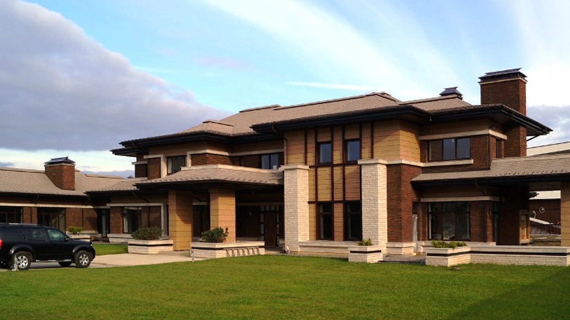 Загородное поместье с бассейном и 6-ю спальнями распложено около пруда, на участке 55 соток. Дом площадью 1866 построен в стиле американского архитектора ХХ века Френка Ллойда Райта — фасад в натуральных цветах с широким карнизом хорошо отлично вливается в природное окружение.