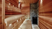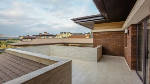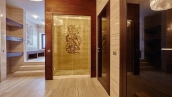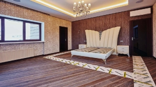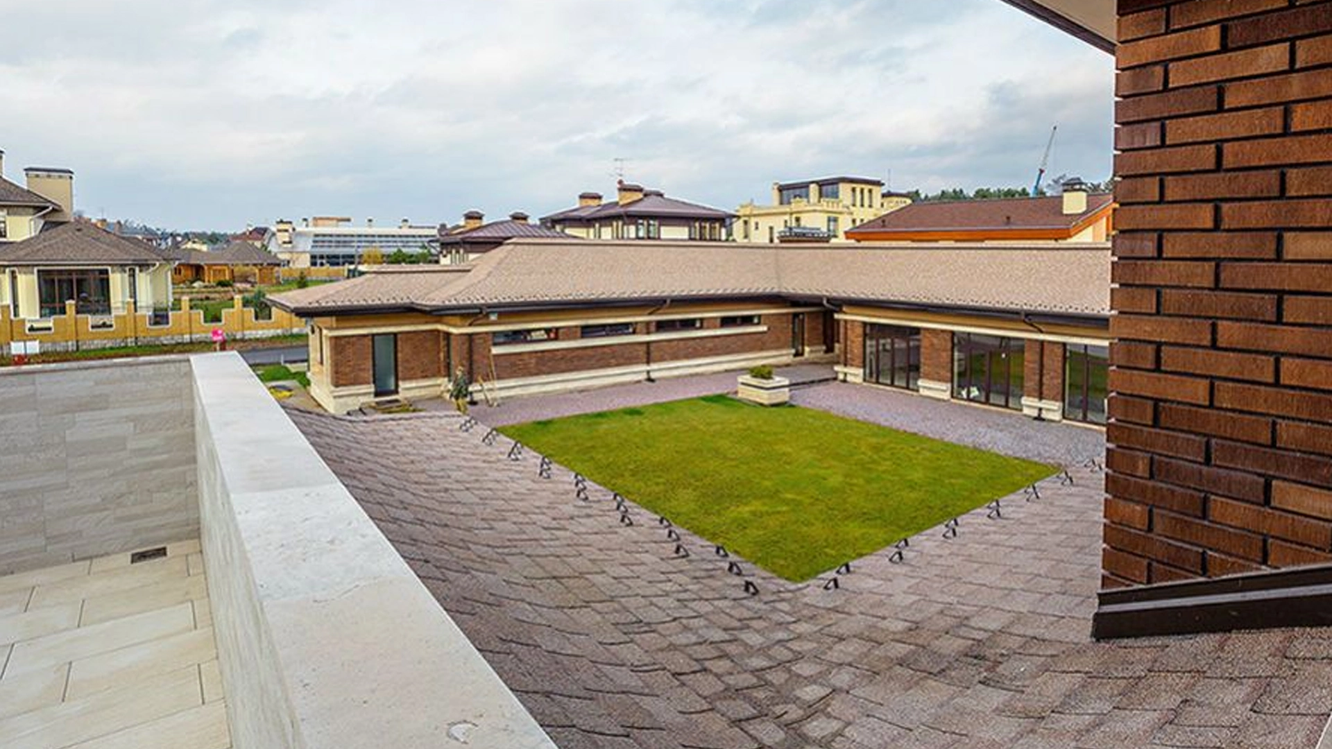 На первом этаже дома расположена зона отдыха с бассейном и турецкой баней. На втором этаже 5 спален с санузлами и несколькими гардеробными. Интерьер выполнен в неоклассическом стиле в теплых тонах, дополнен дизайнерской мебелью. На участке постелен газон, проведена подсветка, дорожки вымощены плиткой и деревом. В дом встроен гараж для 3 машин с квартирой для персонала.