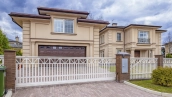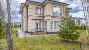 Загородный дом площадью 427 м² построен на полевом участке 21 соток. Фасад здания выполнен в неоклассическом стиле с симметричными и строгими линиями. Его облицовка из светлой декоративной штукатурки подчёркивает элегантность форм. Экстерьер украшен колоннами, пилястрами, рустами, наличниками и кованными ограждениями. Входная зона оформлена массивной деревянной дверью и широкими тёмными ступенями, которые контрастируют с основным цветом здания и завершают его архитектурную композицию.