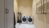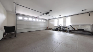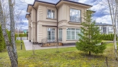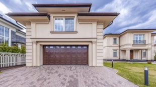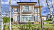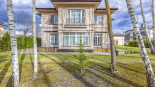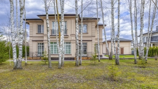 Планировкой предусмотрены 4 спальни, гостиная, кухня-столовая и кабинет. Дополнительно на территории возведен гараж на 2 машины с квартирой для персонала на 2-м уровне. Участок с березами благоустроен — засеян газон, высажены туи и декоративные кустарники, проложены аккуратные дорожки и организовано уличное освещение. Здесь можно обустроить приватные зоны отдыха, беседку с барбекю и детскую площадку.