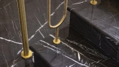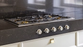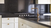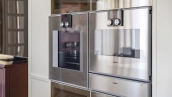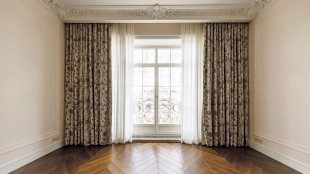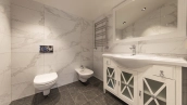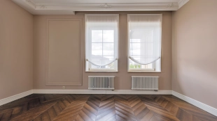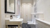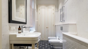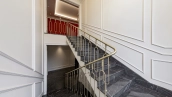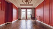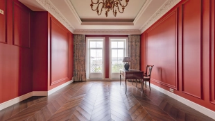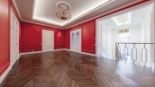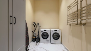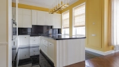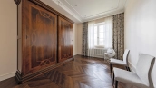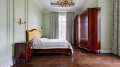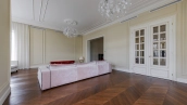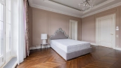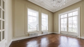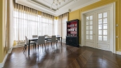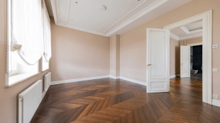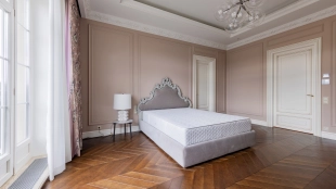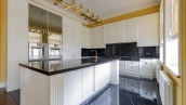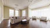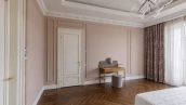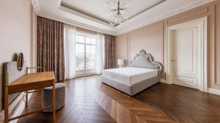Внутри реализован дизайнерский ремонт по эксклюзивному проекту, сочетая элементы классики и эклектики. Цветовая гамма включает мягкие сливочные, песочные и нежно-розовые тона, дополненные яркими акцентами для создания визуальной глубины. Особое внимание уделено деталям — сложные потолочные карнизы, лаконичные светильники, классические молдинги на стенах. Интерьеры частично укомплектованы мебелью от европейских производителей и техникой от брендов Gaggenau, Miele.