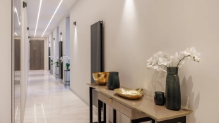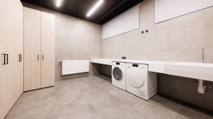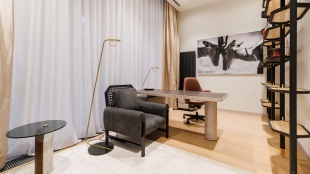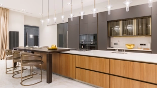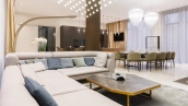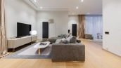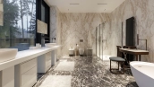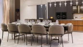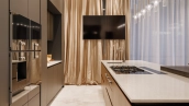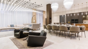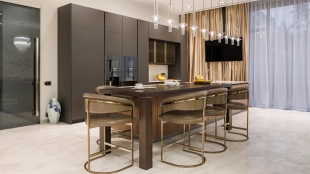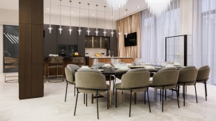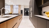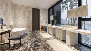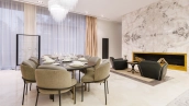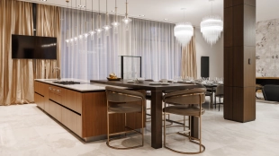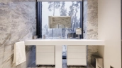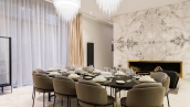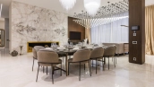 Загородная резиденция в стиле «минимализм» площадью 1350 м² расположена на просторном участке 110 соток. Темный фактурный фасад облицован клинкерной плиткой. В отделке современного интерьера использованы натуральный мрамор, керамогранит, дубовый паркет, двери RIMADESIO. В доме установлены мебель и декор ведущих мировых брендов — Porada, Minotti, Baxter, Rugiano, Ulivi, Ipe cavalla, Bosa, Fiam, Tom Dixon. Санузлы оборудованы сантехникой Duravit, Fir, Cea Design, Antonio Lupi, на кухне Siematic встроена бытовая техника GAGGENAU. В коттедже спроектированы 5 спален, просторная гостиная со вторым светом и камином, кабинет, кинотеатр, SPA-зона с бассейном и сауной, библиотека, винная комната. Предусмотрена спальня для персонала. На участке выполнен ландшафтный дизайн, вымощены дорожки из брусчатки ручной формовки.