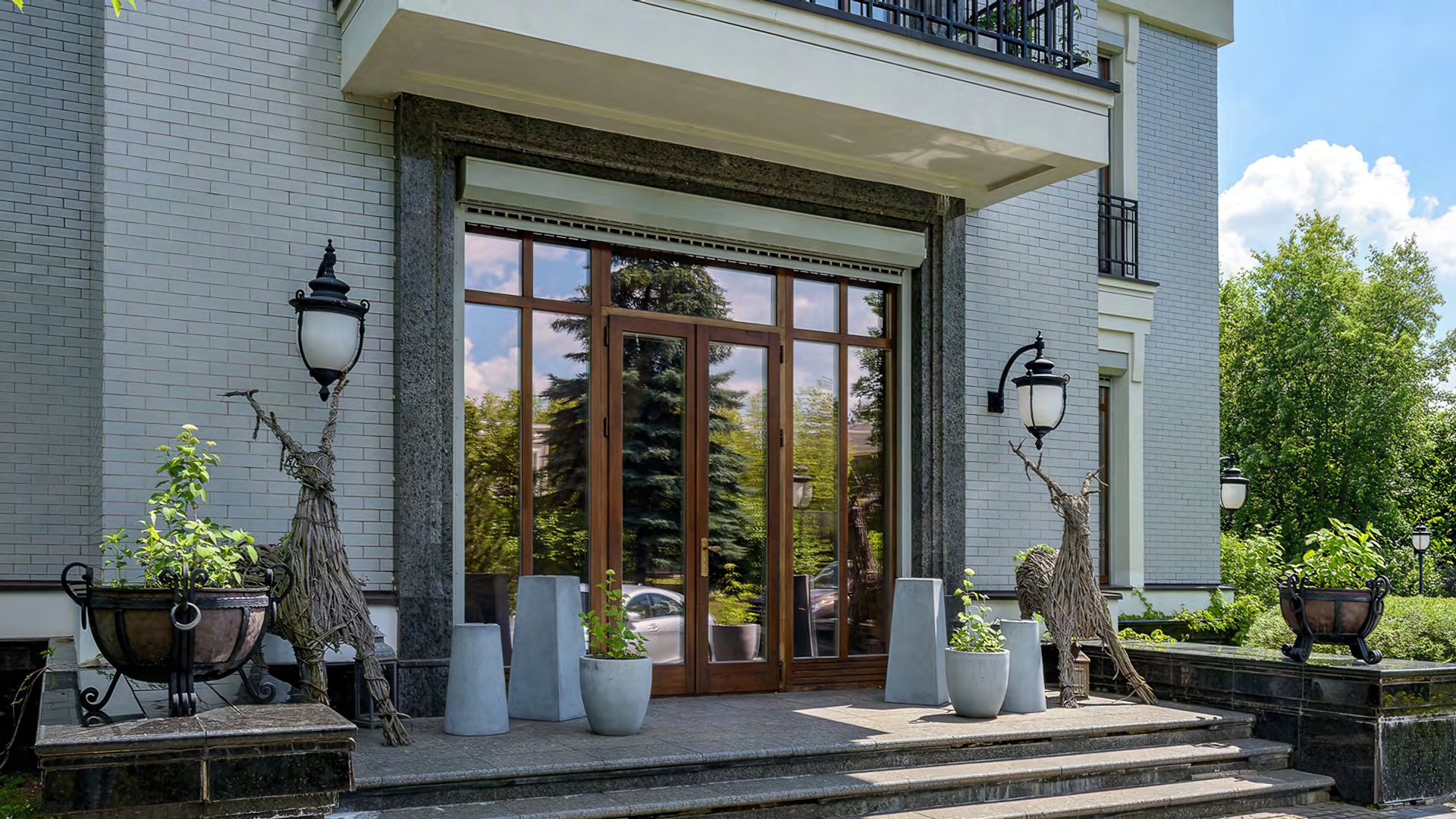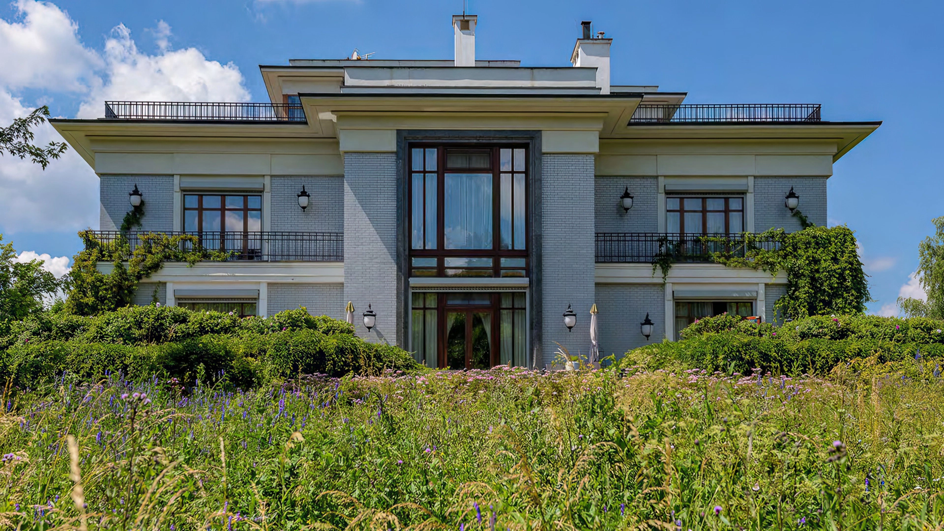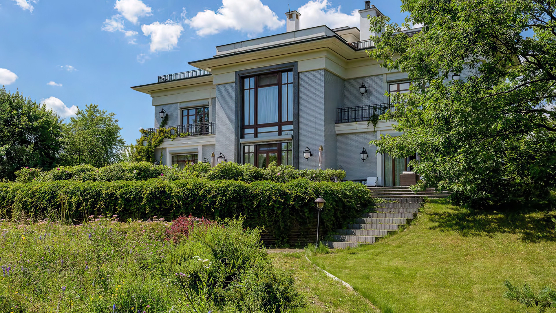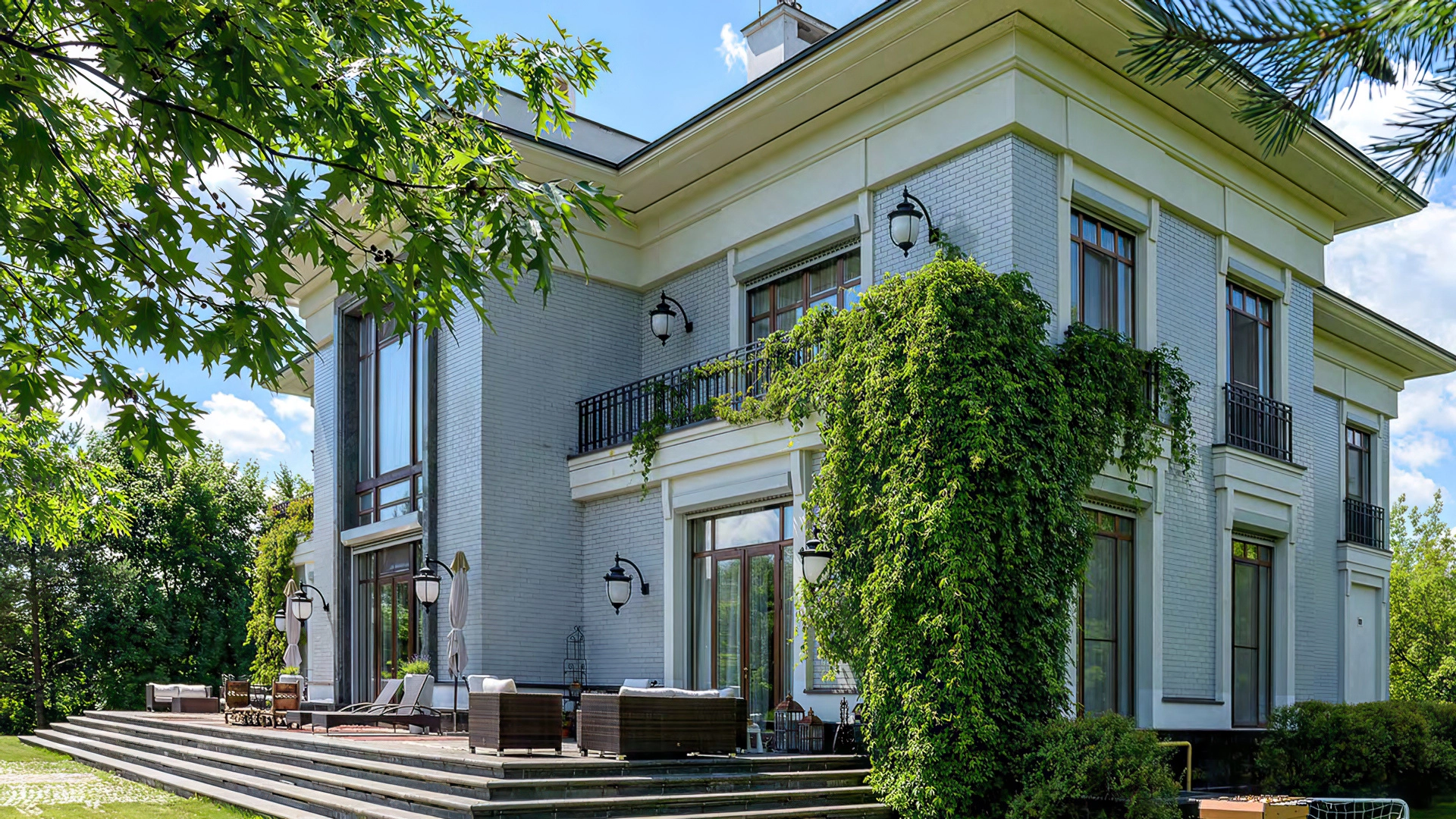 Загородная резиденция площадью 1675 м² расположена на участке 46 соток напротив Мещерского парка. Фасад здания в классическом стиле облицован серым кирпичом. Панорамные окна наполняют интерьеры светом, а кованые перила на балконах подчеркивают горизонтальные линии. Белые наличники и межэтажные карнизы добавляют симметрии и строгости. Живая зелень плавно обвивает стены, внося природную свежесть, а светильники гармонично завершают облик, обеспечивая вечернее освещение.