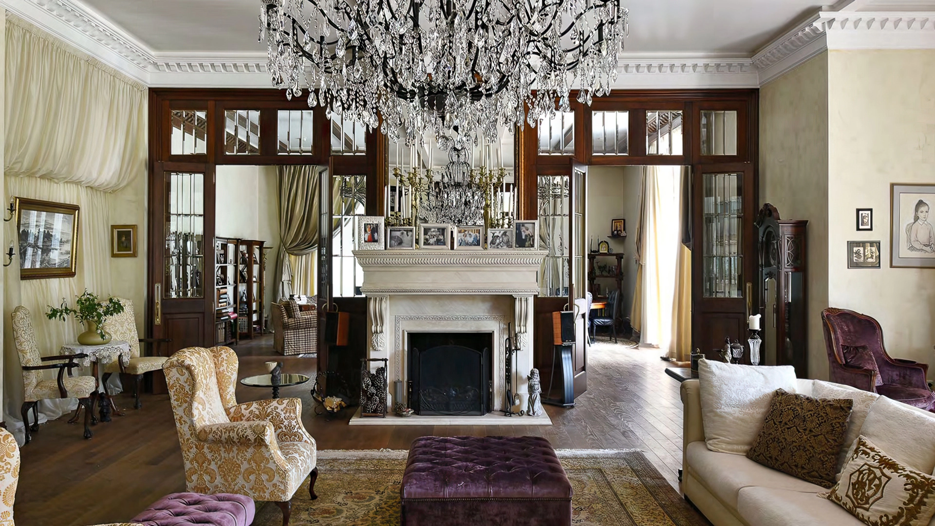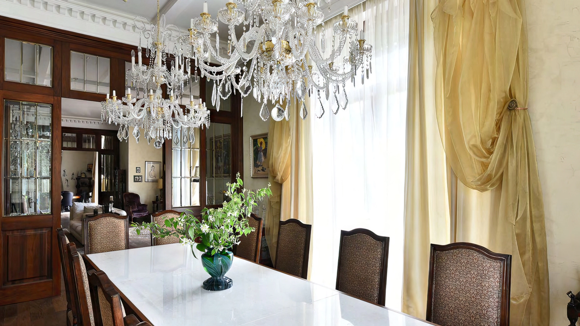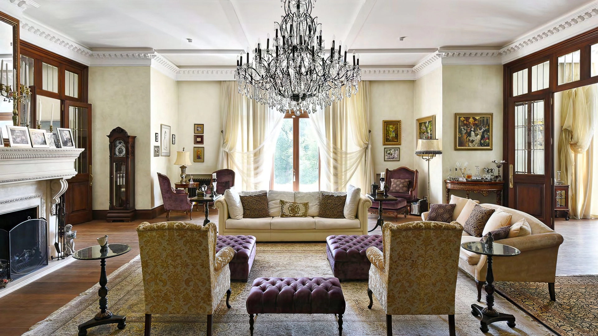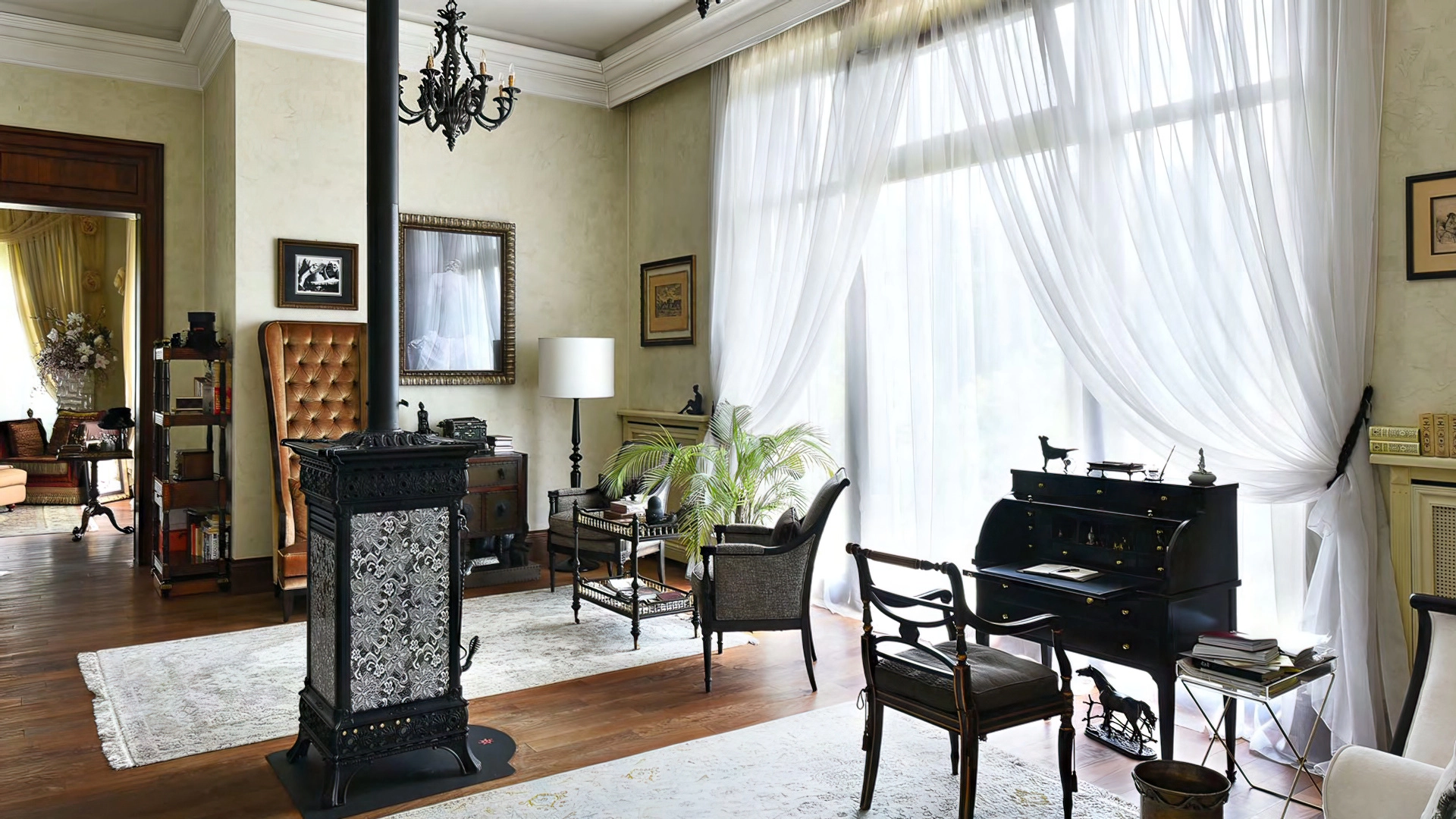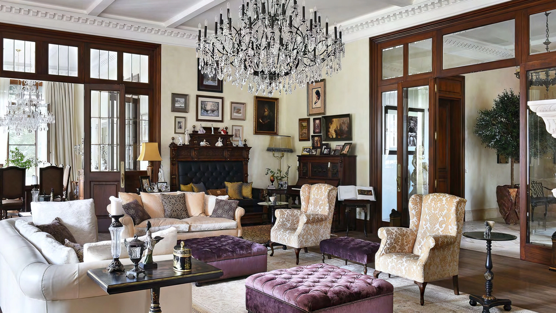 Дизайн интерьеров поддерживает единую концепцию дома через внимательность к деталям. Цветовая палитра в пастельных тонах контрастирует с глубокими оттенками мебели и текстиля. Основным материалом отделки служит натуральное дерево, подчеркивающее устойчивый и экологичный подход к пространству. Высокие потолки украшены декоративными карнизами и массивными люстрами, создающими игру света и теней. Каждый элемент декора тщательно подобран, способствуя целостности оформления и привнося художественный штрих.