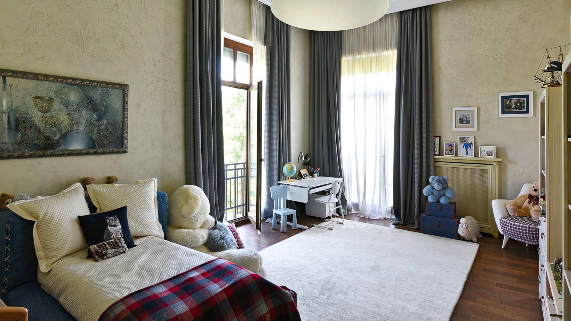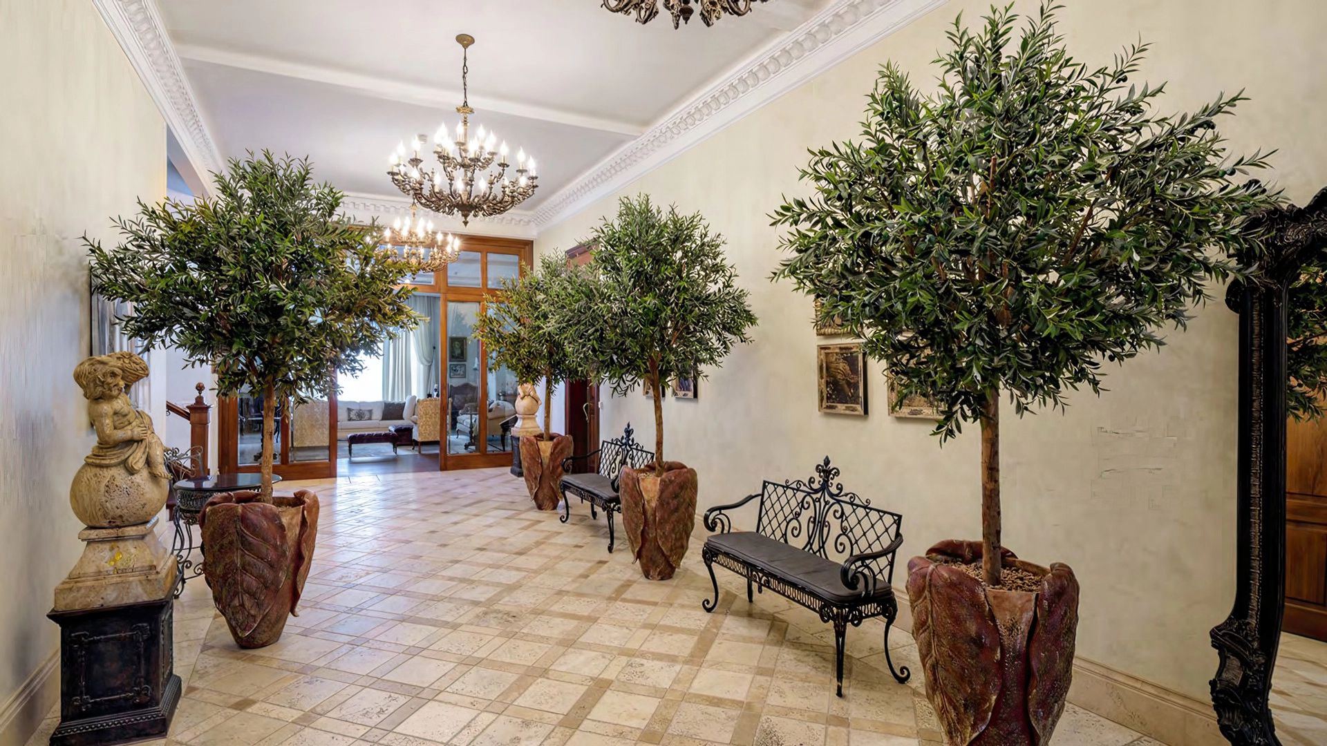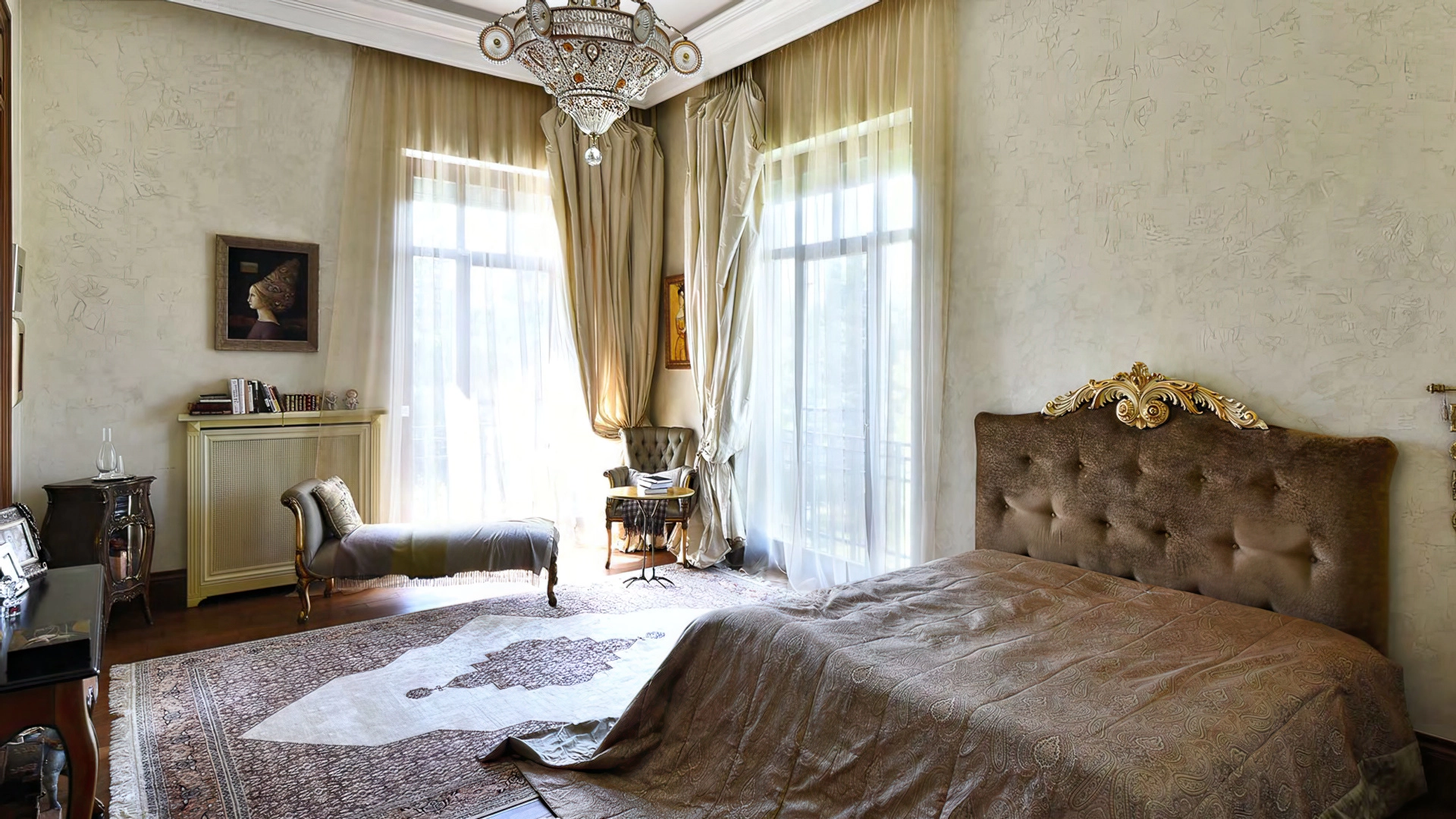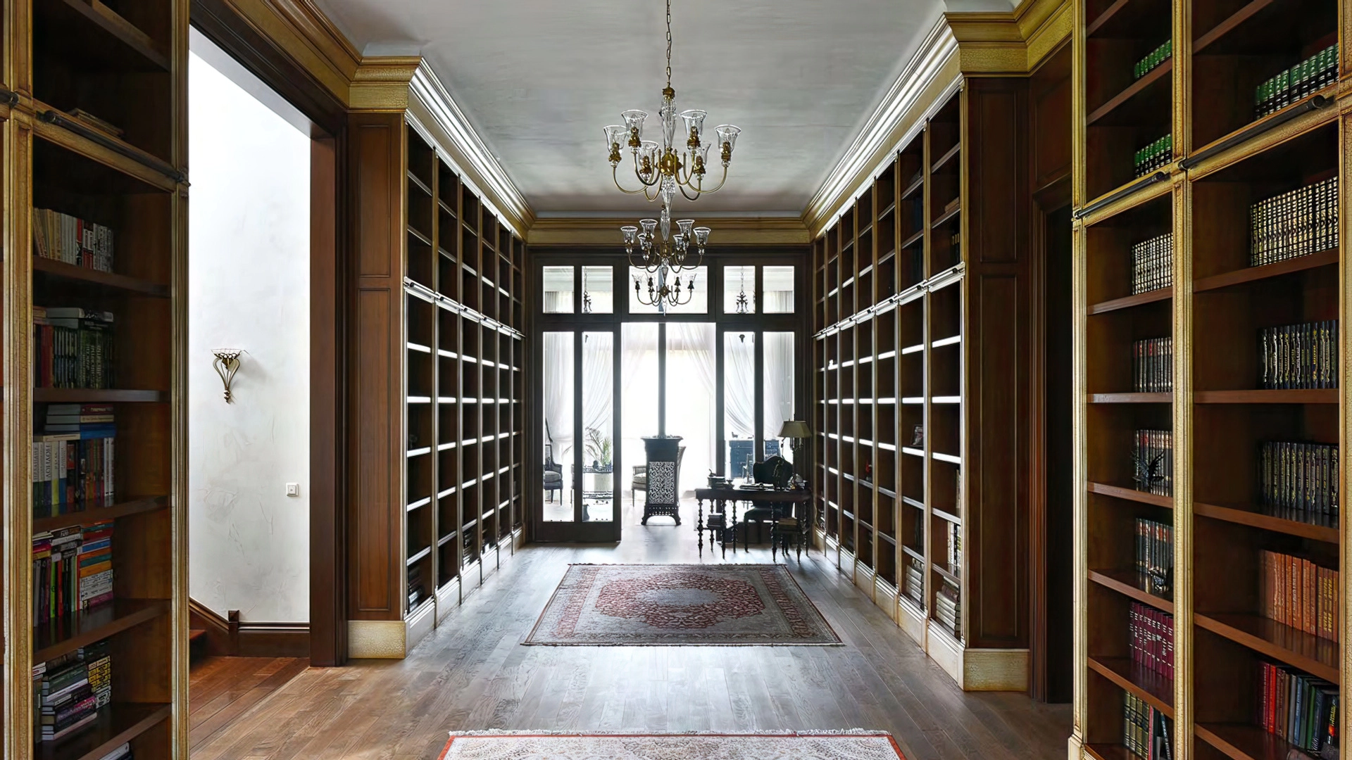Дизайн интерьеров поддерживает единую концепцию дома через внимательность к деталям. Цветовая палитра в пастельных тонах контрастирует с глубокими оттенками мебели и текстиля. Основным материалом отделки служит натуральное дерево, подчеркивающее устойчивый и экологичный подход к пространству. Высокие потолки украшены декоративными карнизами и массивными люстрами, создающими игру света и теней. Каждый элемент декора тщательно подобран, способствуя целостности оформления и привнося художественный штрих.