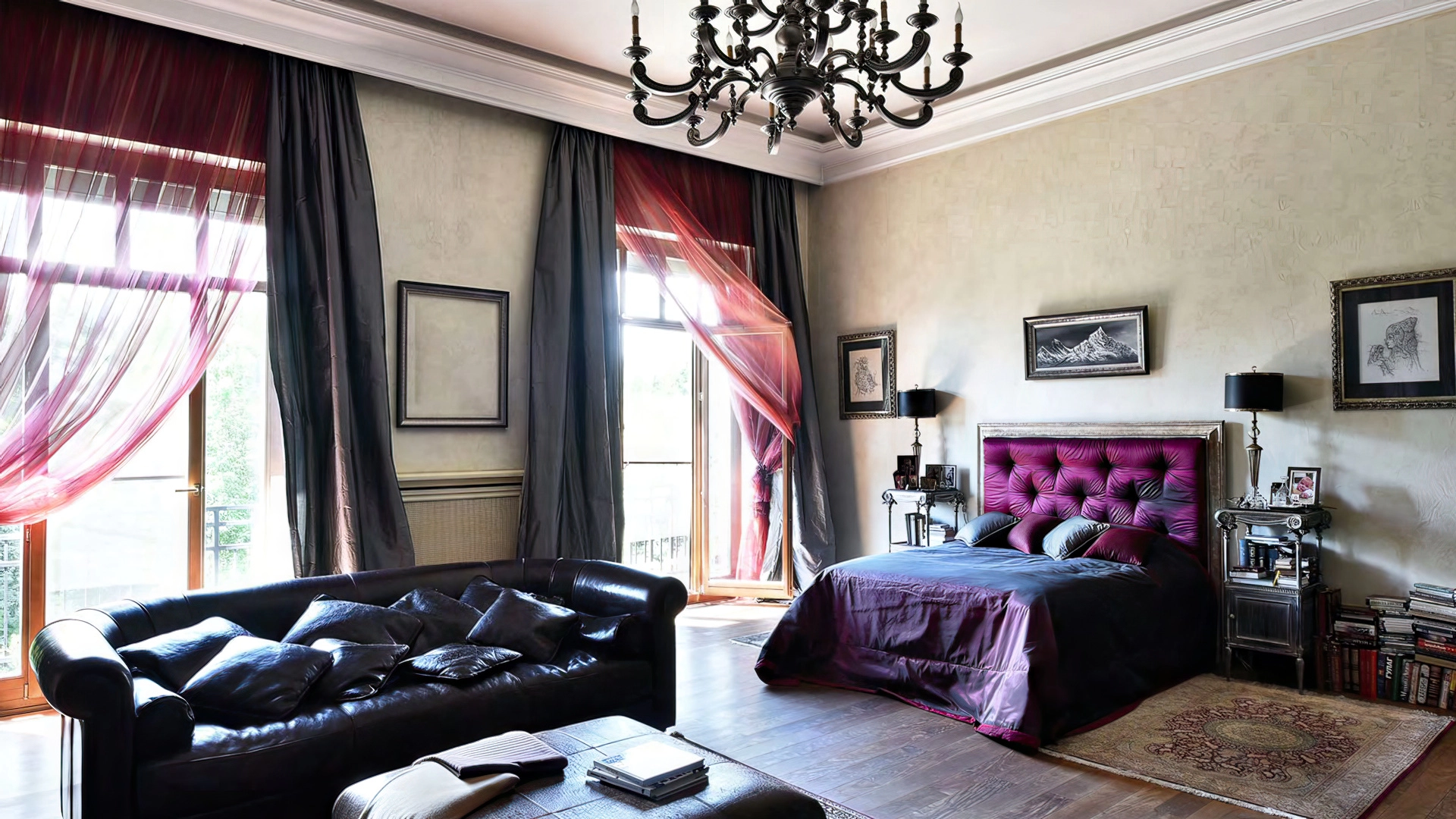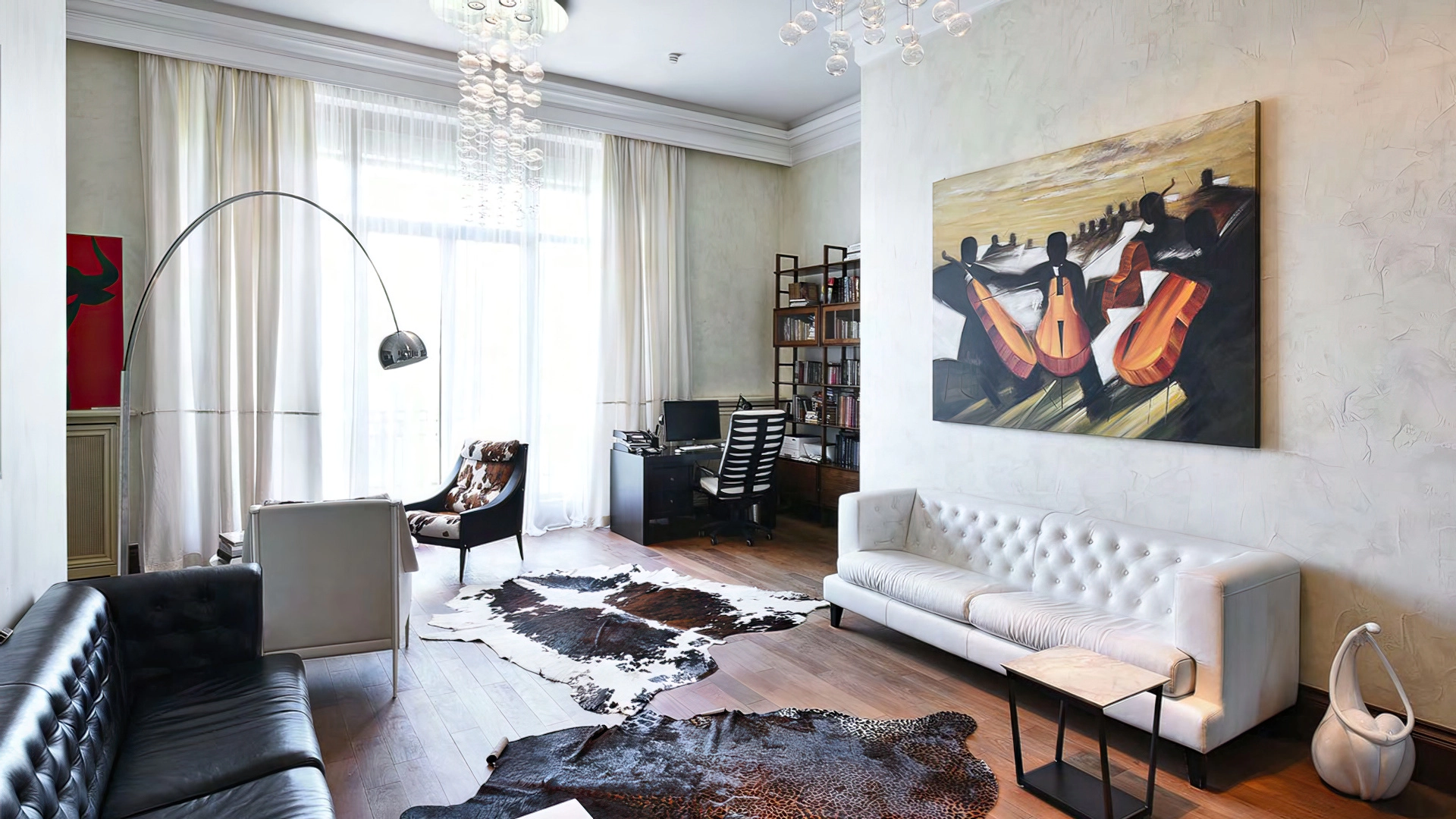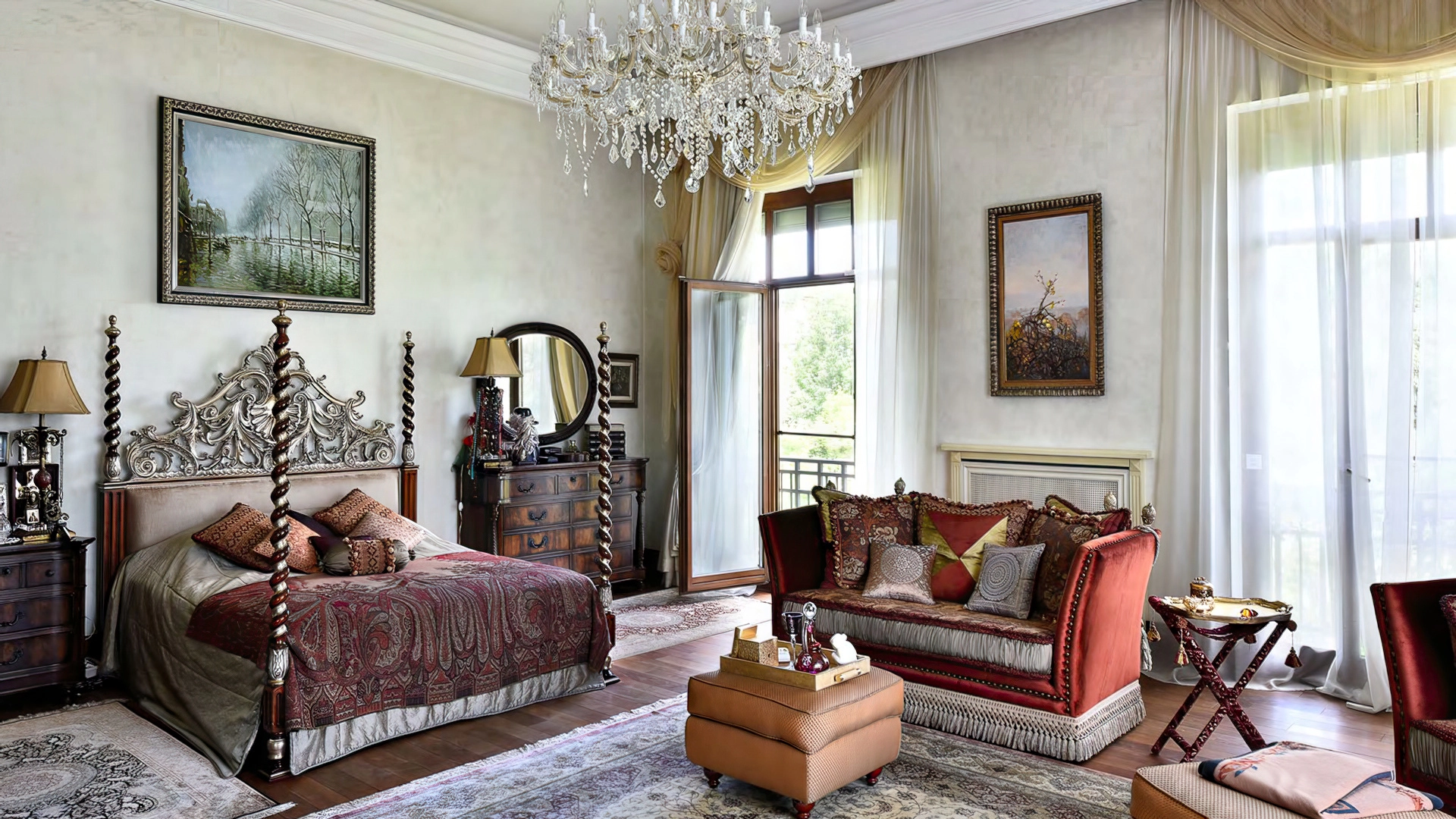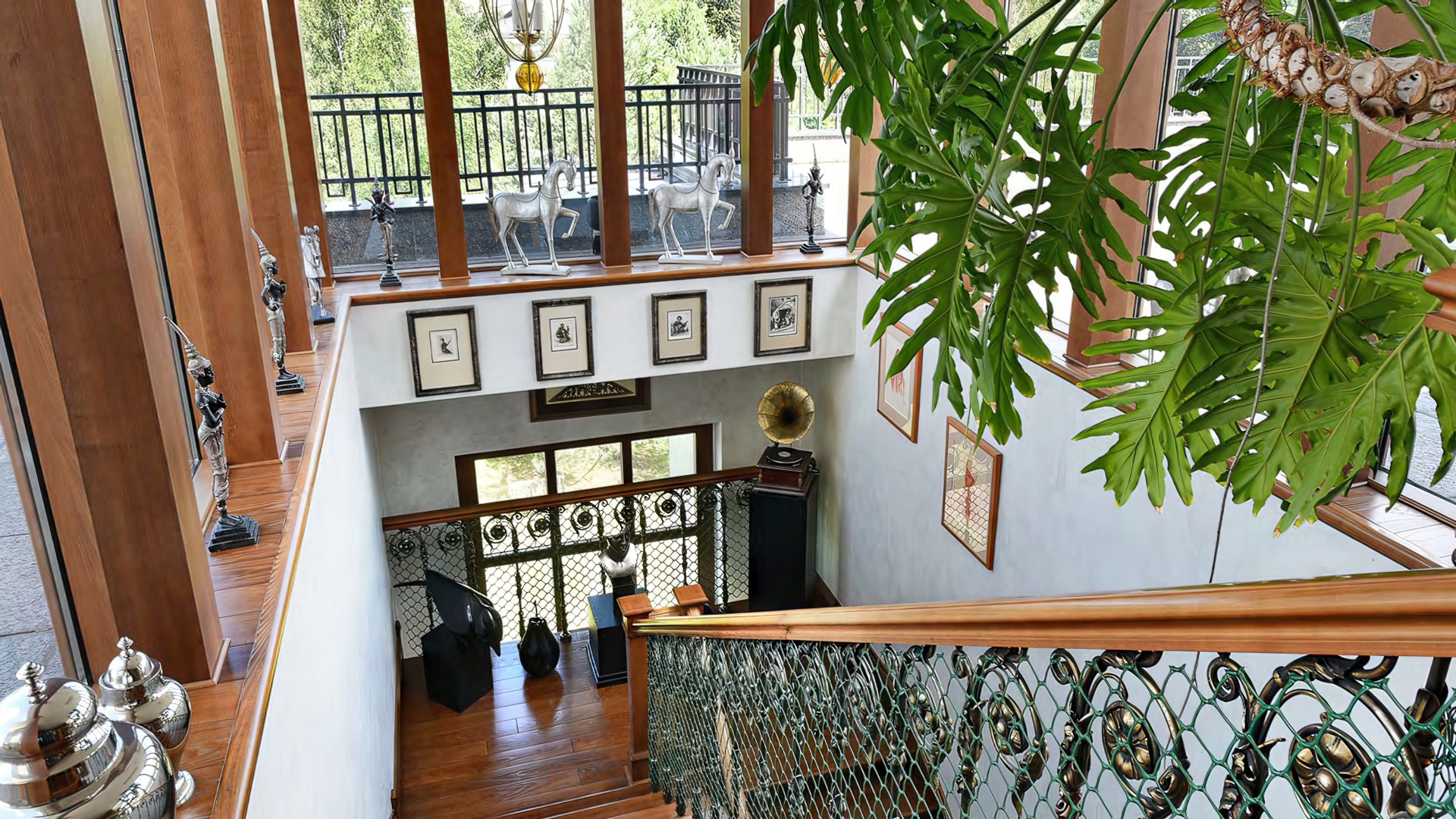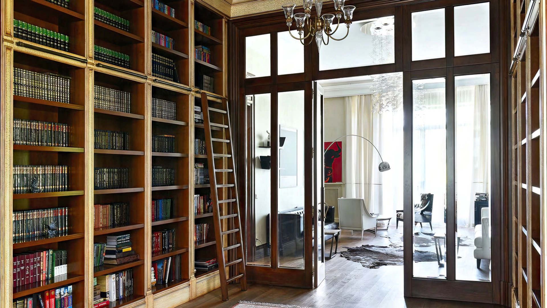 Дизайн интерьеров поддерживает единую концепцию дома через внимательность к деталям. Цветовая палитра в пастельных тонах контрастирует с глубокими оттенками мебели и текстиля. Основным материалом отделки служит натуральное дерево, подчеркивающее устойчивый и экологичный подход к пространству. Высокие потолки украшены декоративными карнизами и массивными люстрами, создающими игру света и теней. Каждый элемент декора тщательно подобран, способствуя целостности оформления и привнося художественный штрих.