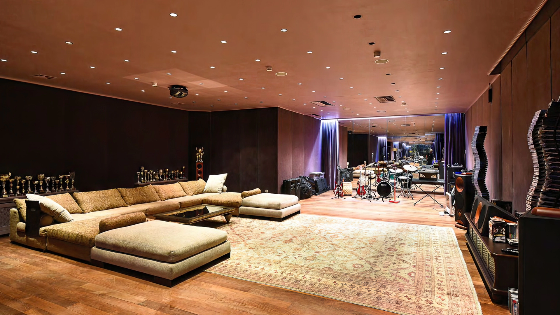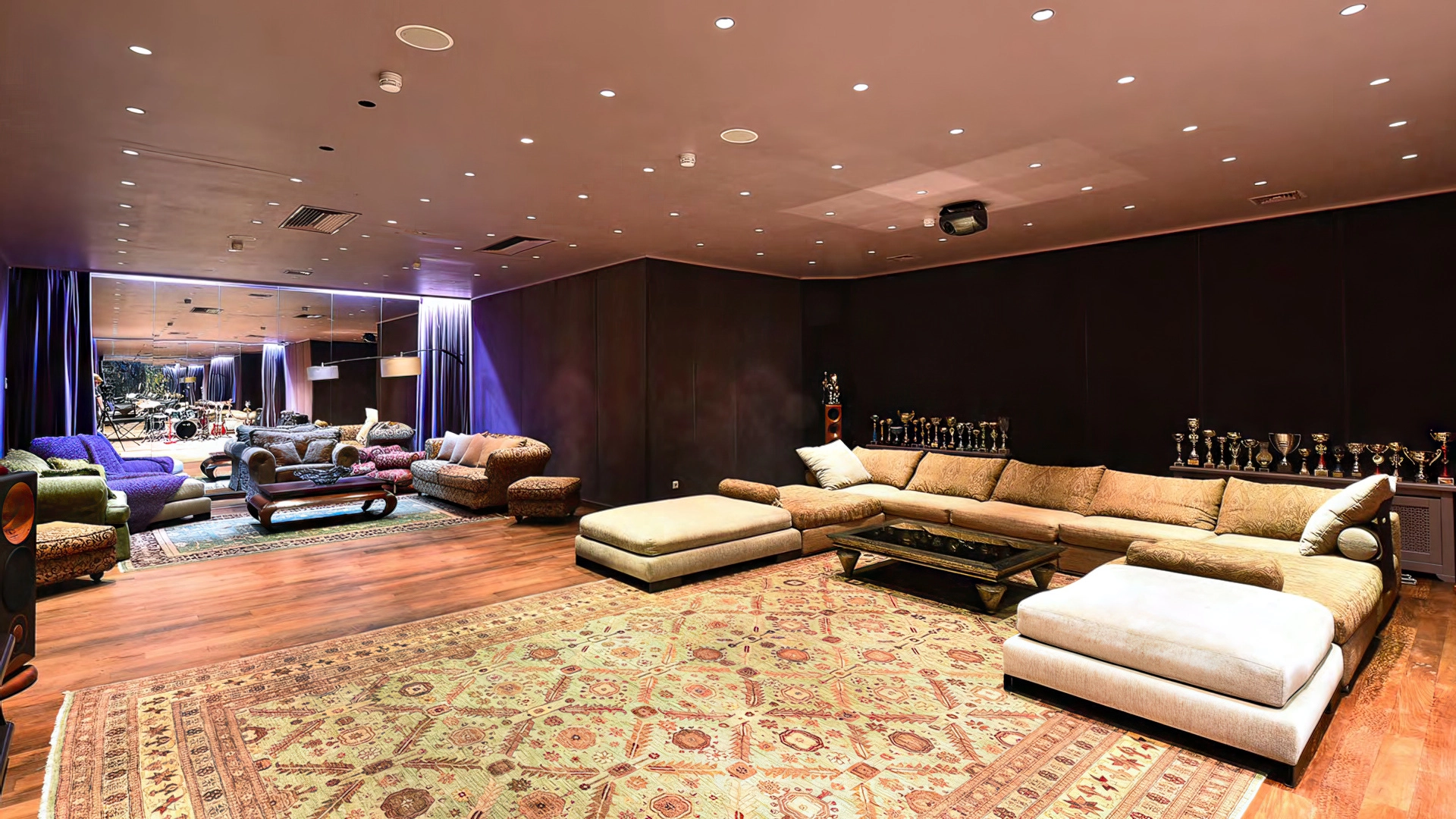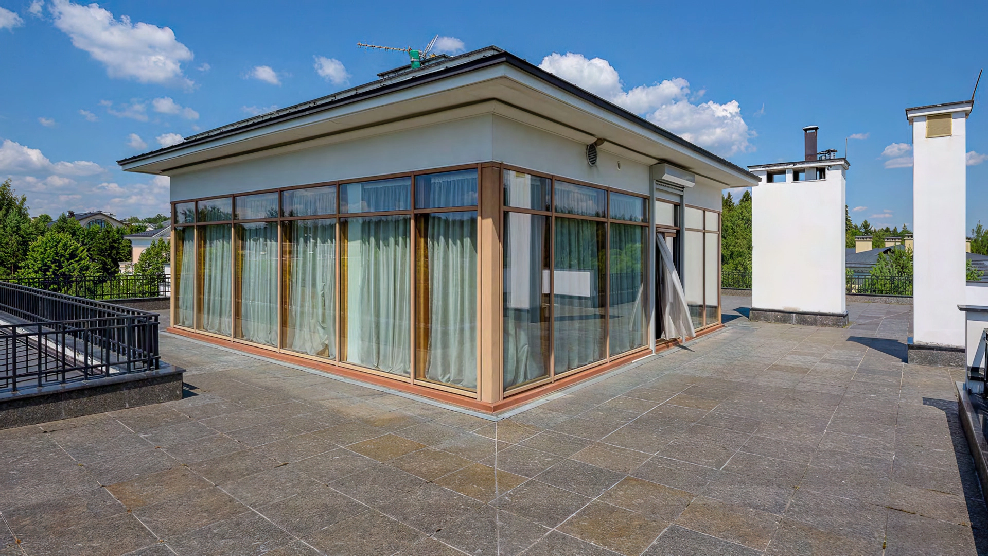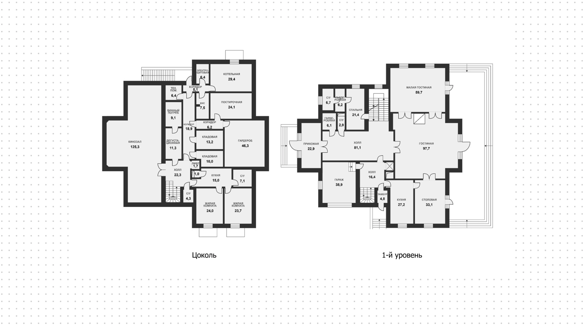 Спланированы 6 спален, гостиная, кухня, столовая, кабинет, винный погреб с дегустационной комнатой, кинозал с репетиционной зоной, игровая, библиотека, зимний сад, 3 балкона и терраса на эксплуатируемой кровле. Дополнительно предусмотрена квартира для персонала с 2-мя спальнями, кухней и санузлом. На территории проложены дорожки и установлено уличное освещение. Ландшафт сочетает газоны, кустарники и многолетние деревья.