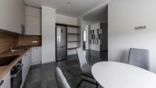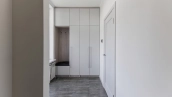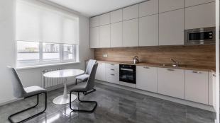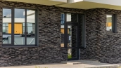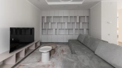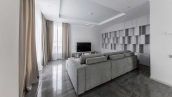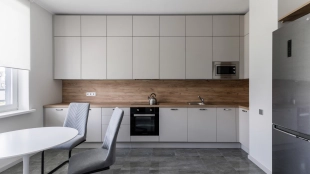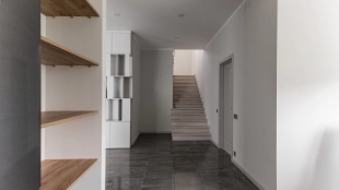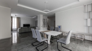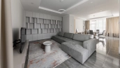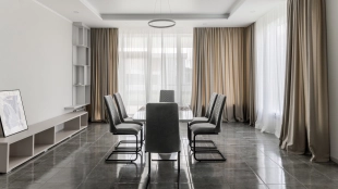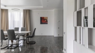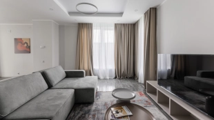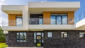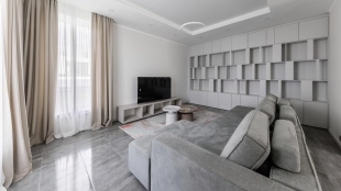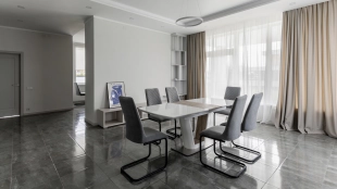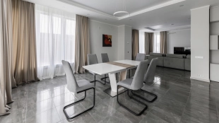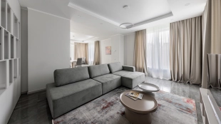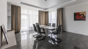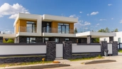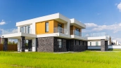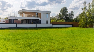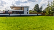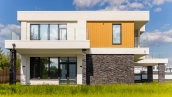 Загородный дом площадью 300 м² построен на полевом участке 12 соток. Фасад здания с большими окнами облицован белой штукатуркой, серой плиткой с текстурой камня и вертикальными оранжевыми планками, декорирован подсветкой. В отделке интерьера преобладают бежевые и серые оттенки, коттедж укомплектован мебелью, бытовой техникой и текстилем. Планировка резиденции включает 4 спальни, гостиную, кухню с зоной для завтраков и столовую с выходом на террасу. К дому пристроен навес на 2 машины. На участке можно выполнить ландшафтный дизайн и обустроить зону барбекю.