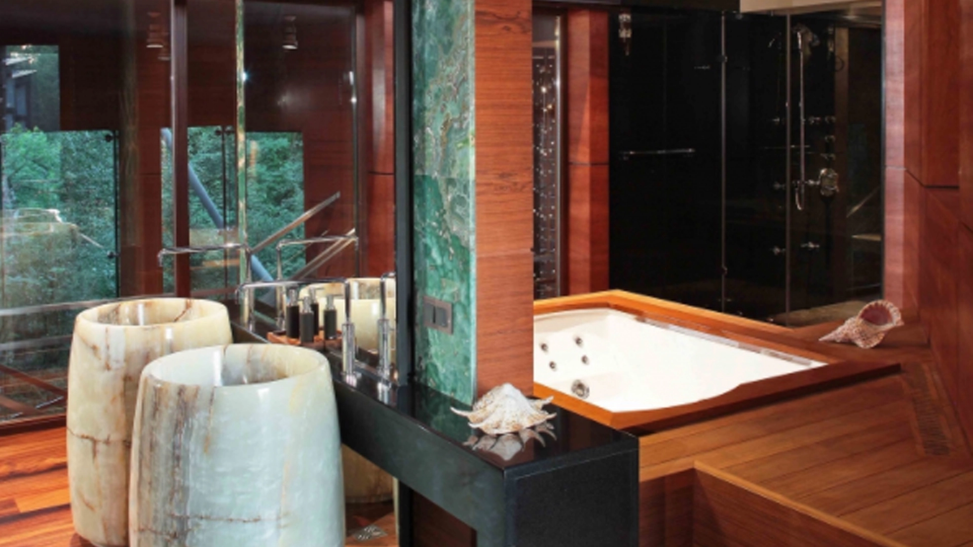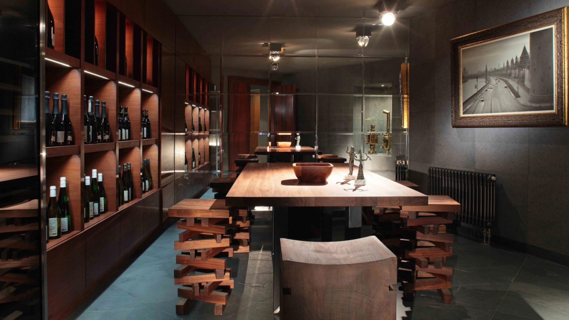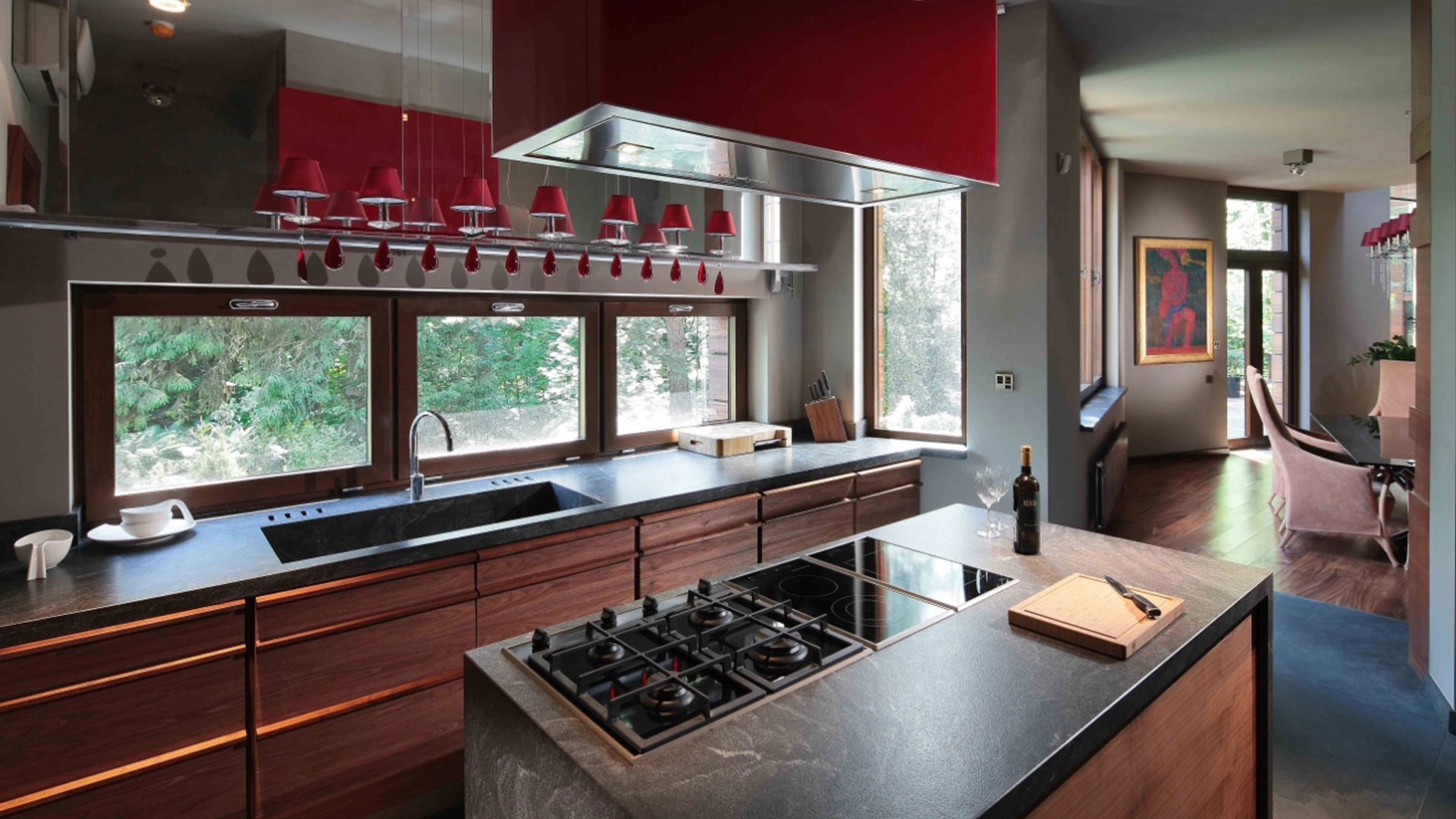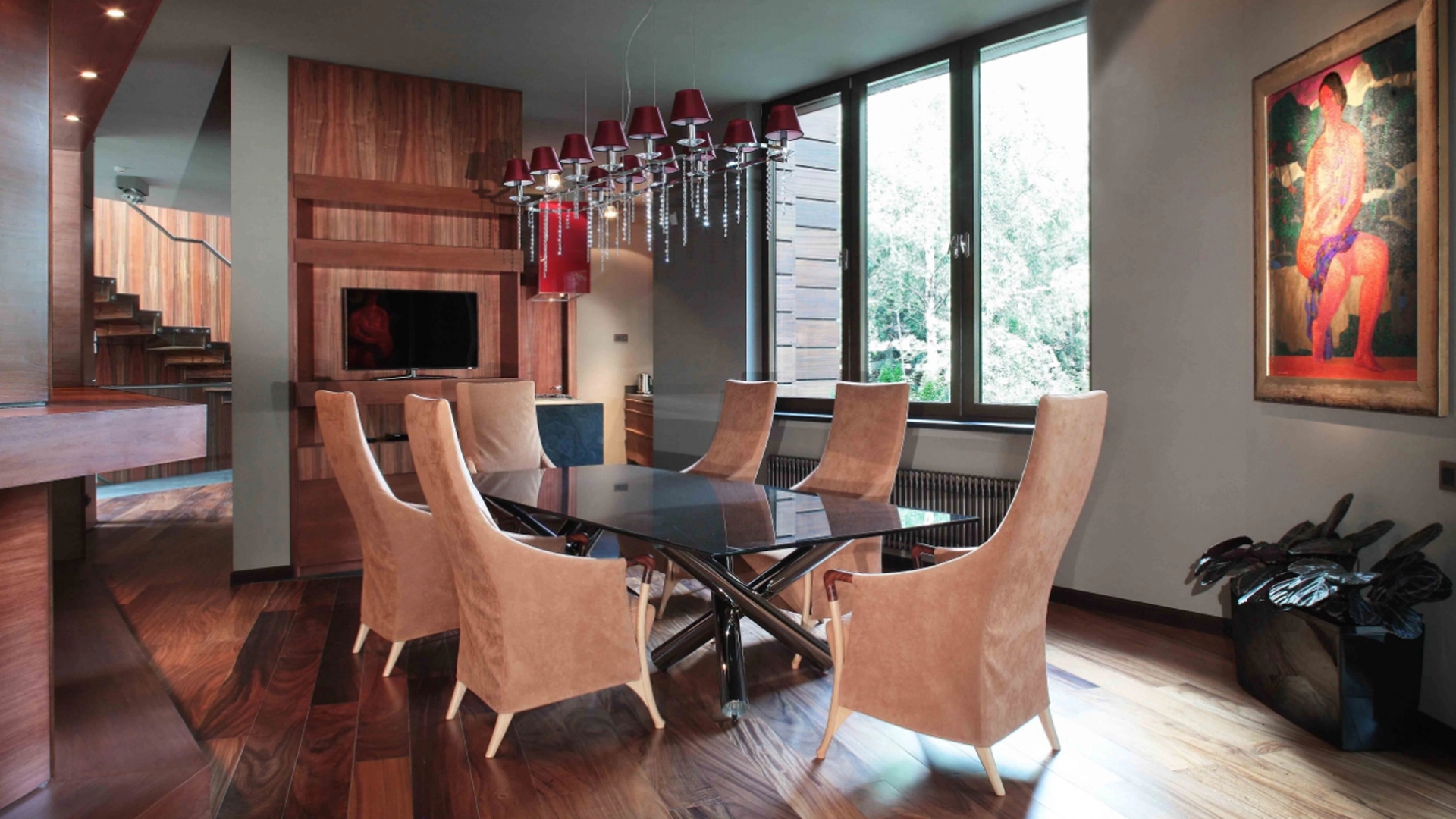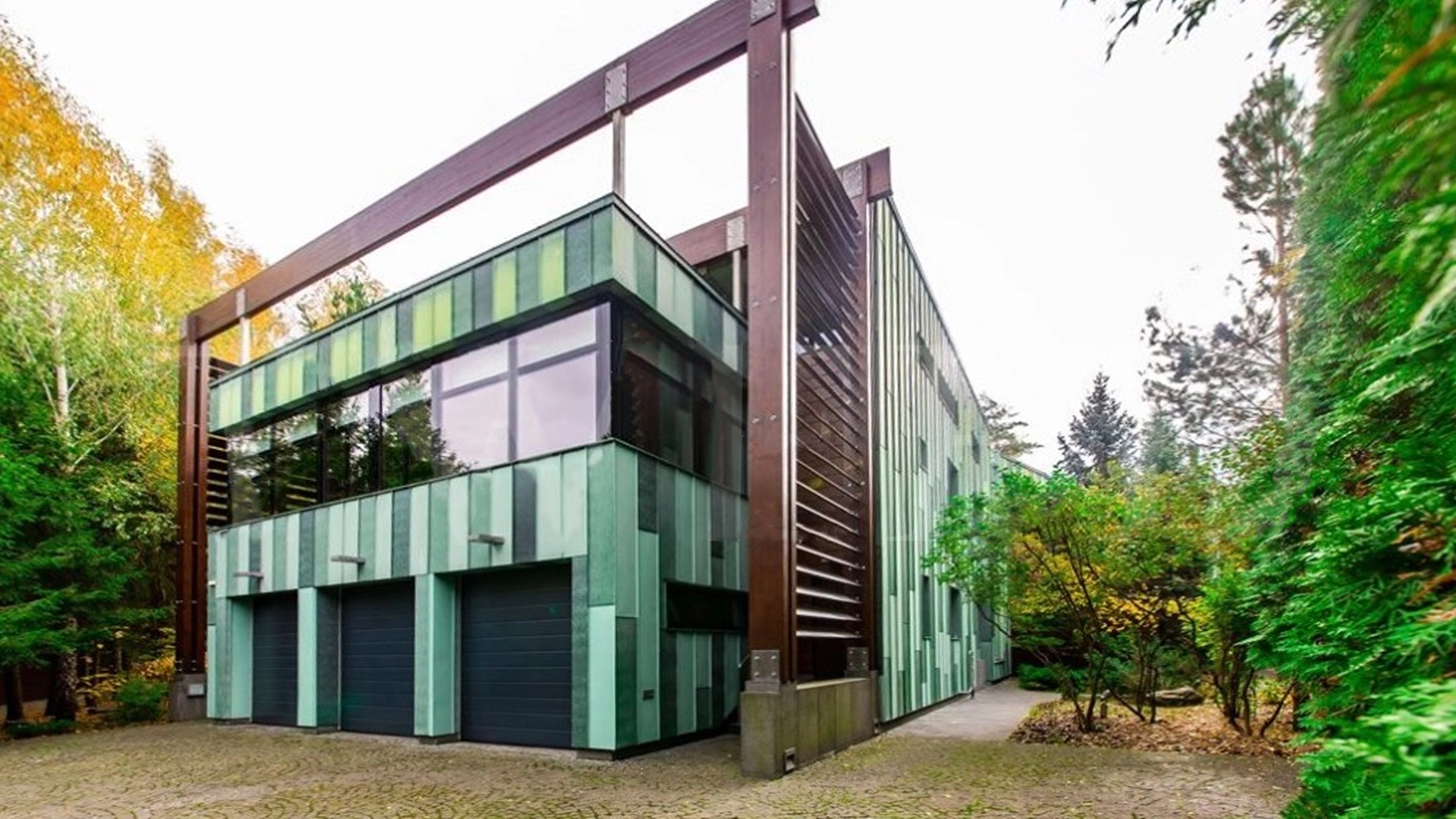 Лесная загородная резиденция в стиле «хай-тек» с интерьером от Ольги Фрейман. Дом площадью 1750 м² с панорамным остеклением и вторым светом расположен на участке 88 соток с лесными деревьями. В цокольный этаж встроен гараж для 3 машин. С первого этажа можно выйти на уютные тенистые террасы по периметру дома. Интерьер резиденции в стиле «минимализм» акцентирует внимание на натуральных материалах — сланце, граните и европейском орехе. Игра глянцевых и матовых фактур, сочетания ярких цветов делают интерьер наполненным. На первом этаже дома установлена кухня Riva. Мебель и освещение подобраны из дизайнерских коллекций — Стол Minotti, стулья Giorgetti, люстра De Majo. Главная изюминка дома — двухсветная спа-зона с бассейном и сауной.
