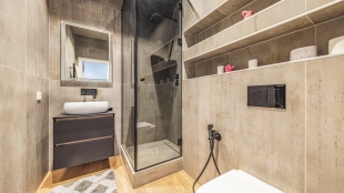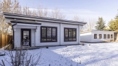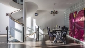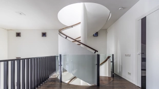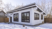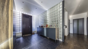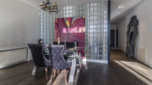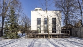 Загородный коттедж площадью 500 м² расположен на полевом участке 22 сотки. Фасад четкой выполнен в строгом минималистичном стиле и облицован белоснежной штукатуркой. Сочетание больших и маленьких окон, стеклоблоков и второго света визуально расширяет пространство и делает его воздушным. Современные интерьеры выдержаны в светлых тонах, дополнены комфортной мебелью, изысканным декором, бытовой техникой и сантехникой.