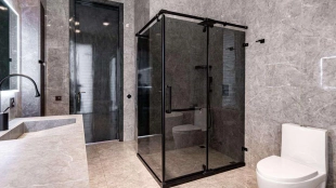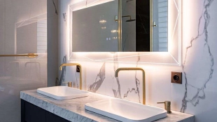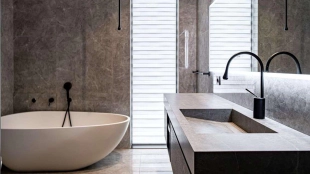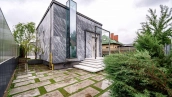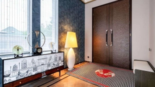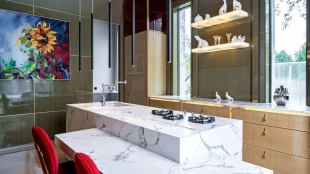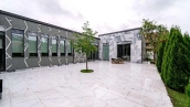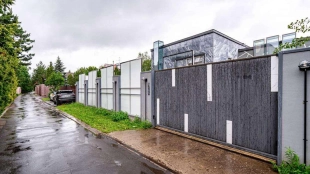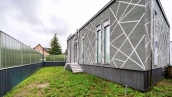 Загородный коттедж площадью 403 м² расположен на полевом участке 8,5 соток. Фасад, выполненный в стиле хай-тек, облицован благородным серым мрамором и декоративными панелями с геометрическим рисунком, а также дополнен узким безрамным остеклением, подчеркивающим четкие линии и продуманные пропорции здания.