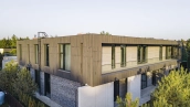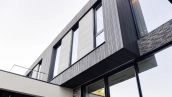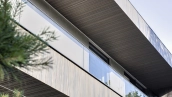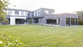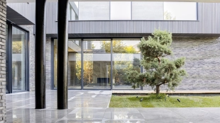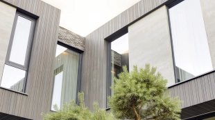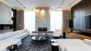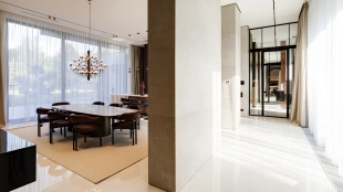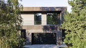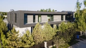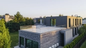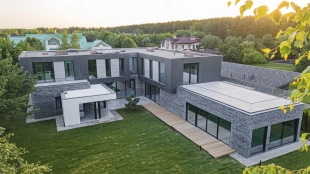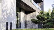 Новая загородная резиденция площадью 1265 м² расположена на участке 26 соток в живописном лесном окружении. Современный фасад сформирован вытянутыми прямоугольными блоками, образуя приватный двор. Дом облицован крупноформатным керамогранитом Laminam контрастных оттенков и термированным планкеном. Панорамное остекление стирает границы между природным окружением и интерьерами, наполненными естественным светом.