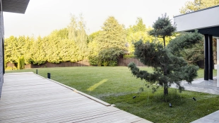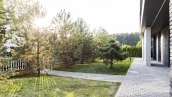 Планировка в удобным зонированием включает просторную гостиную с камином, кухню-столовую с функциональным островом, кабинет, 4 спальни с вместительными гардеробными, блок для персонала и SPA-зону с бассейном и сауной. Для размещения автомобилей предусмотрен встроенный двухместный гараж. На террасах можно обустроить уютные зоны для отдыха на свежем воздухе и барбекю. Участок правильной формы благоустроен — здесь засеян аккуратный газон, растут деревья, высажены туи, вымощены дорожки и установлено уличное освещение.