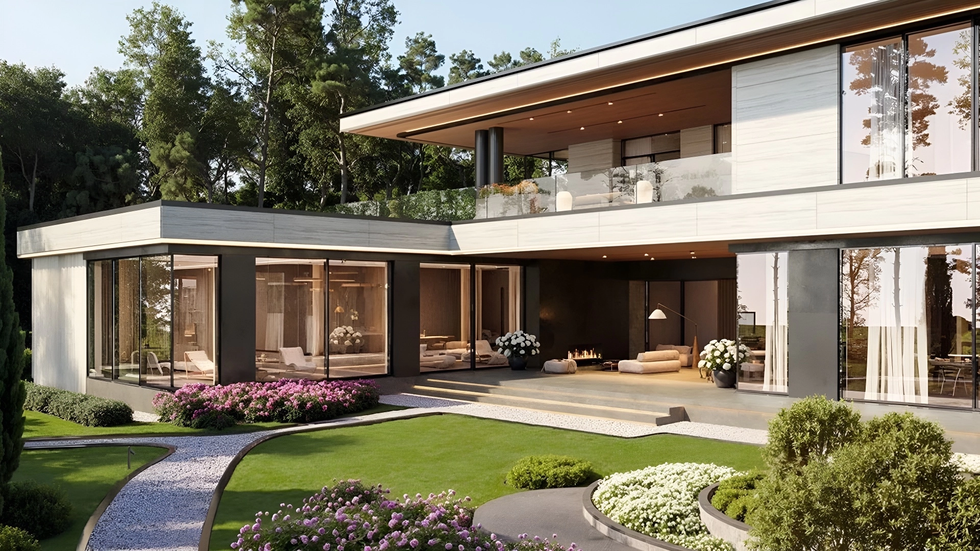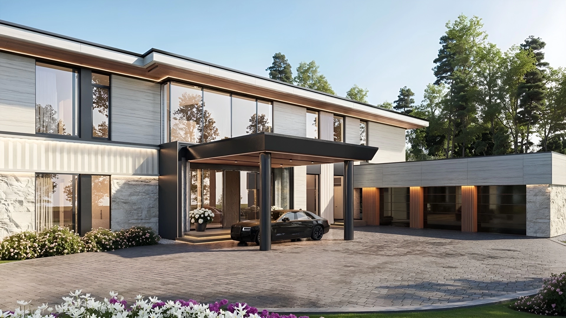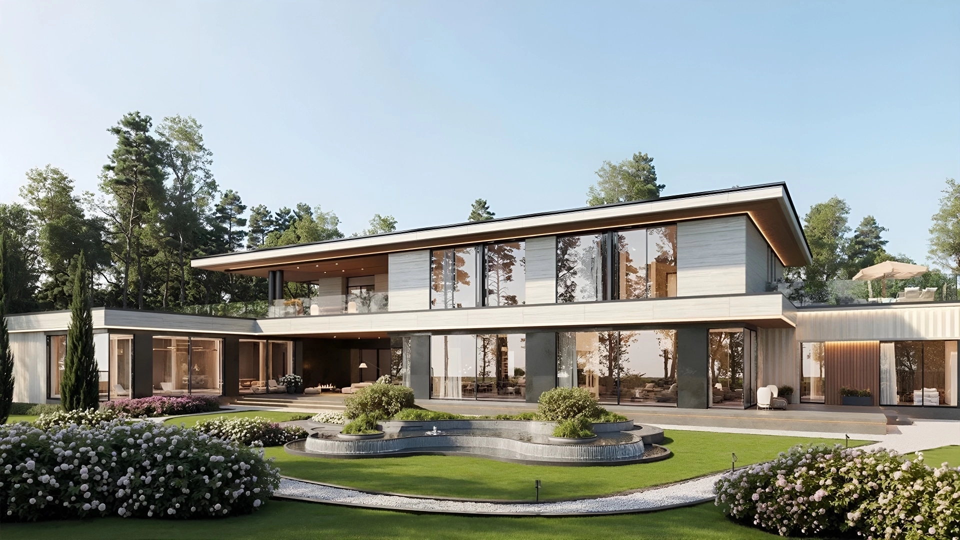 Современная резиденция площадью 2200 м² расположена на участке 50 соток неподалёку от озера. Контраст светлой отделки фасада и тёмных архитектурных деталей формирует элегантный и запоминающийся облик. Подсветка подчёркивает композицию, придавая зданию глубину и выразительность в вечернее время. Входная группа с колоннами задаёт торжественный ритм, а большие окна наполняют интерьер светом и визуально объединяют дом с природным окружением. Внутреннее пространство оформлено в едином авторском стиле, сочетающем комфорт, функциональность и лаконичную эстетику. Планировка включает 6 спален с гардеробными и санузлами, кабинет, спортзал и просторную SPA-зону с бассейном, сауной и хаммамом. Также предусмотрены гараж и блок для персонала. На участке реализован продуманный ландшафт — высажены деревья и цветущие кустарники, разбиты цветники, проложены дорожки. Композицию дополняет декоративный пруд и уютные зоны отдыха для тёплых встреч с близкими.