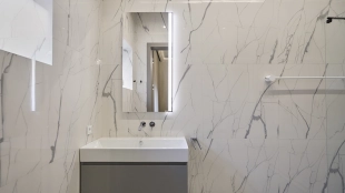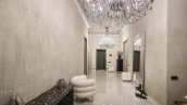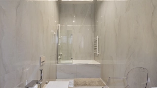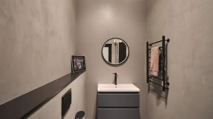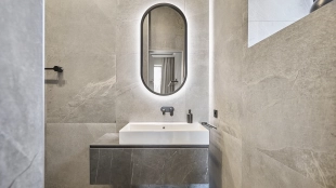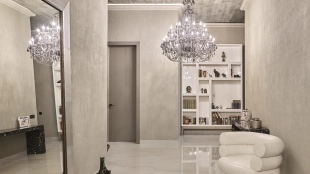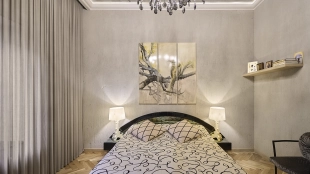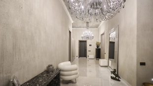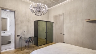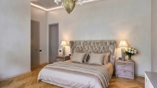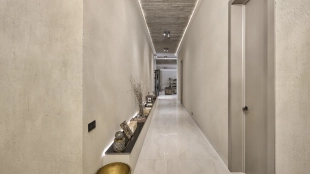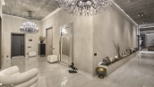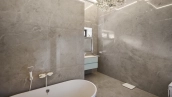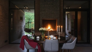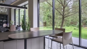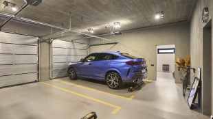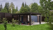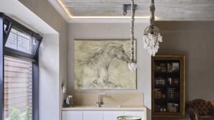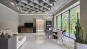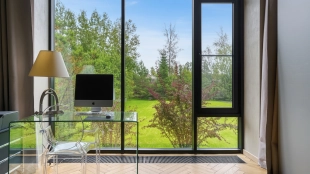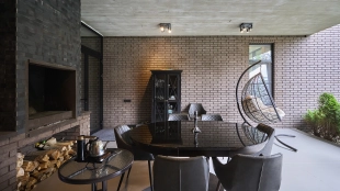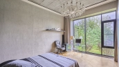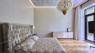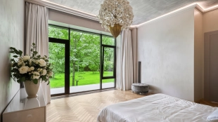 Панорамные окна с алюминиевым профилем стирают грань между природным окружением и внутренним пространством, наполняя его солнечными лучами. Интерьеры выдержаны в светлых тонах, а также дополнены изящными светильниками и элементами с фактурой бетона, отсылающими к стилю лофт. Дом полностью укомплектован комфортной мебелью и встроенной бытовой техникой.