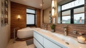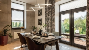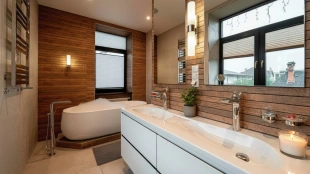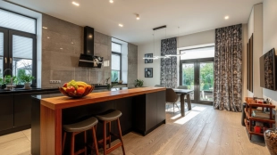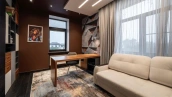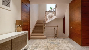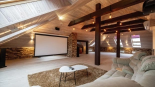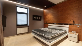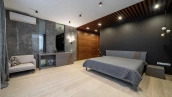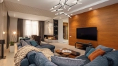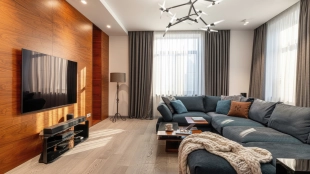 Интерьеры оформлены в современном ключе с акцентом на природные материалы и мягкую цветовую гамму. Тёплое дерево гармонирует с оттенками серого и бежевого, создавая атмосферу спокойствия и комфорта. Пространство продумано до мелочей — мебель и декор объединены общей стилистикой, а многоуровневое освещение от Centersvet формирует уютный световой сценарий. Дом оснащён системой «умный дом», приточно-вытяжной вентиляцией и кондиционированием.