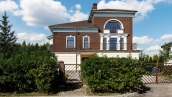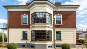Коттедж площадью 700 м² расположен на участке 16 соток. Архитектура выдержана в неоклассическом стиле: нижний ярус облицован бежевым камнем, верхний — терракотовым кирпичом, что создаёт гармоничное сочетание оттенков и фактур. Колонны, пилястры и крупные оконные проёмы с белыми наличниками придают фасаду лёгкую выразительность, а эркер с панорамным остеклением наполняет дом светом и открывает виды на сад.
