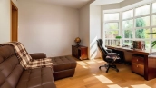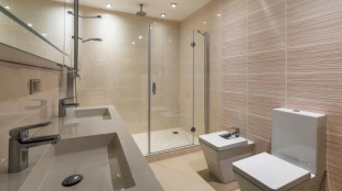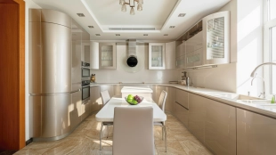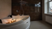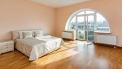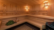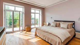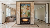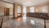 Интерьеры оформлены в светлой нейтральной палитре с акцентом на природные материалы. Камень и дерево формируют спокойное и цельное пространство. Центральным элементом гостиной выступает камин из мраморного камня с витражной композицией над ним, создающий ощущение уюта и тепла. Планировкой предусмотрены шесть спален, гостиная, кухня-столовая, SPA-комплекс с хаммамом и сауной, а также отдельный блок для персонала.