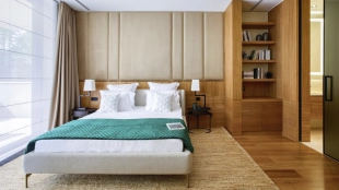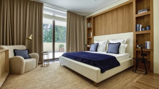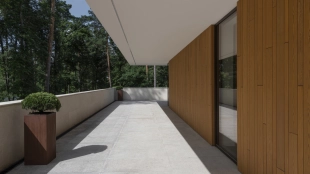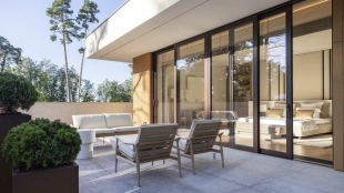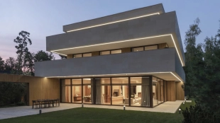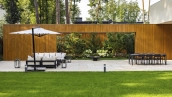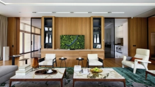 Загородная резиденция площадью 1495 м² расположена на участке 15 соток в окружении вековых сосен. Архитектурный облик, разработанный португальским бюро Spaceworkers, впечатляет чистотой линий и гармоничным сочетанием фактур камня и дерева. Панорамное остекление стирает границы между живописным пейзажем и внутренним пространством, залитым солнечным светом.