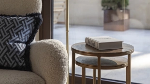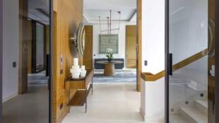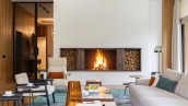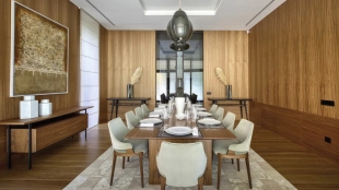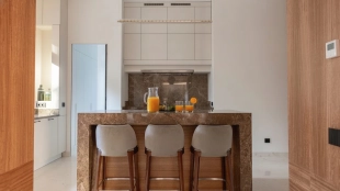 Войдя в особняк, вы оказываетесь в элегантном холле с акцентными настенными панелями из эвкалипта и итальянскими светильниками Flos. Сердцем резиденции стала просторная гостиная с камином работы скульптора Александра Чичкина и индийским ковром ручной работы. На первом этаже также разместили кухню с мраморным островом Emperador Dark и техникой Bertazzoni, столовую и лаконичный кабинет.