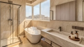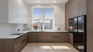 Загородный коттедж площадью 190 м² расположен на полевом участке 6 соток. Современный фасад облицован белоснежной штукатуркой, благородным ригельным кирпичом и высококачественными тёмно-серыми панелями, напоминающими планкер. Большие окна наполняют внутренние пространства солнечным светом и теплом, создавая приятную атмосферу. Лаконичный интерьер гармонично сочетает кремовые оттенки с фактурами камня и дерева.
