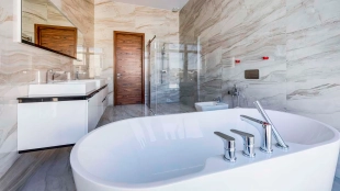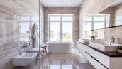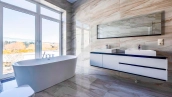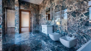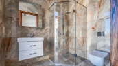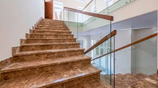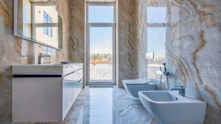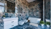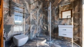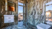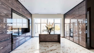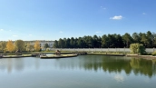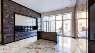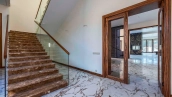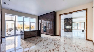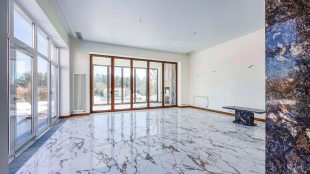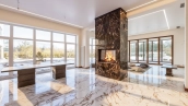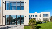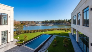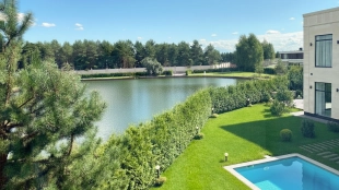 Загородный дом в современном стиле площадью 1150 м² построен на участке 16 соток на берегу озера. Светло-бежевый фасад украсили рустовкой и подсветкой, установлено панорамное остекление. Интерьер выполнен в светлых оттенках с использованием в оформлении натуральных материалов. В коттедже спланировали 7 спален, кухню, гостиную с камином, столовую, SPA-зону с хамамом, сауной, джакузи и выходом к открытому бассейну с подогревом. Предусмотрены квартира для персонала и 2 гаража на 2 машины каждый. На участке выполнен ландшафтный дизайн, высажены деревья, выложены дорожки и оборудовано уличное освещение.