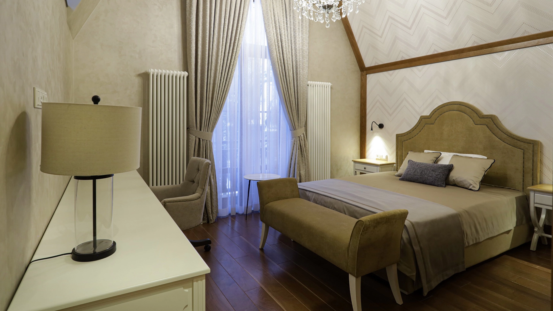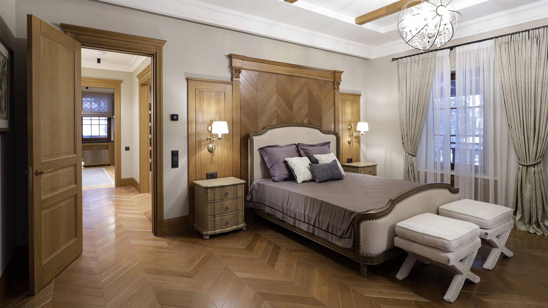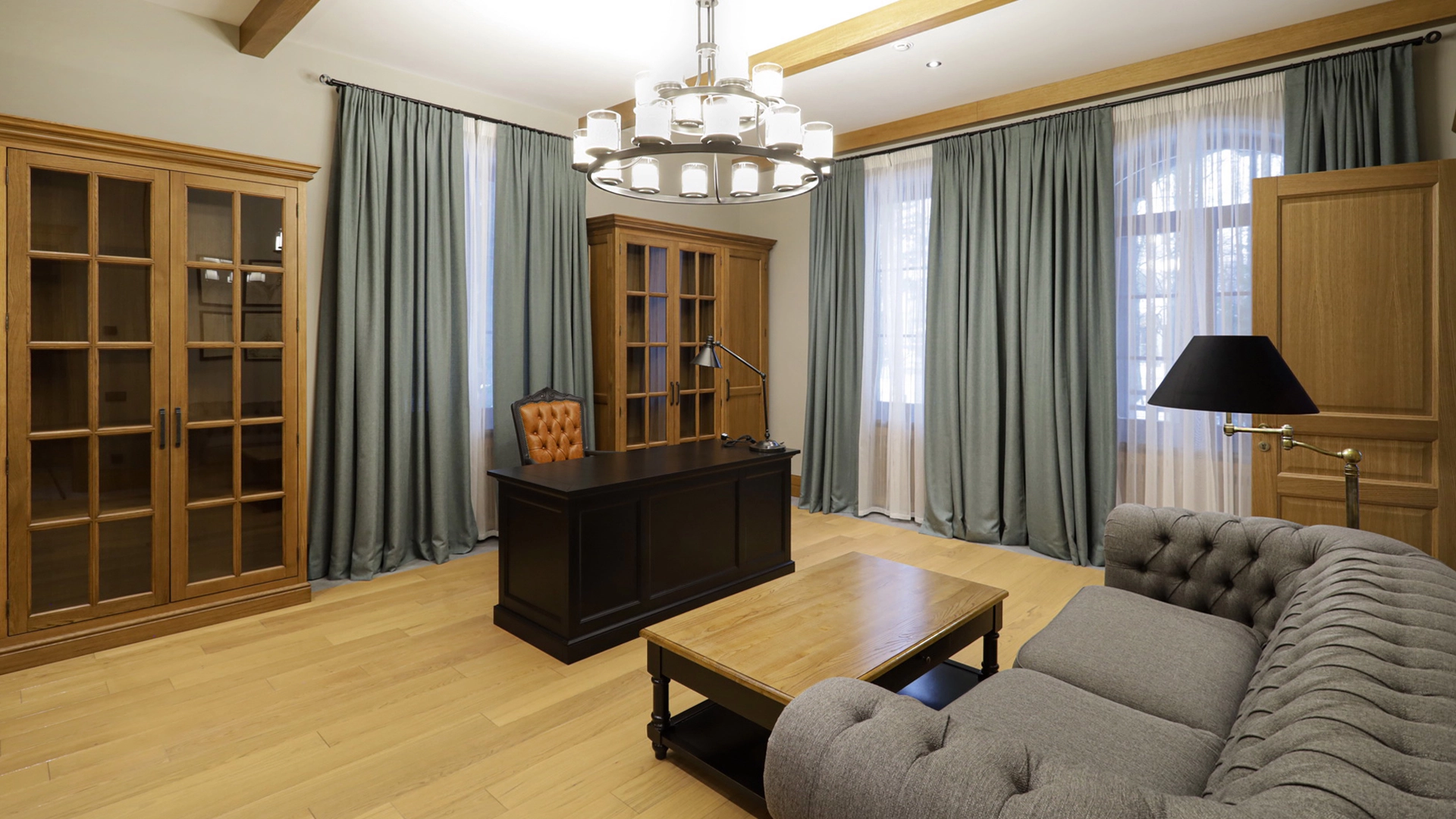Трехэтажный дом во французском стиле «СанЖерма» с пятью спальнями, каминной, библиотекой и большой террасой. Дом готов к ремонту. Общая площадь помещений — 658 м². На придомовом участке 30 соток строит гараж на 2 машины с квартирой для персонала на втором этаже. Площадь гаража — 109 м².