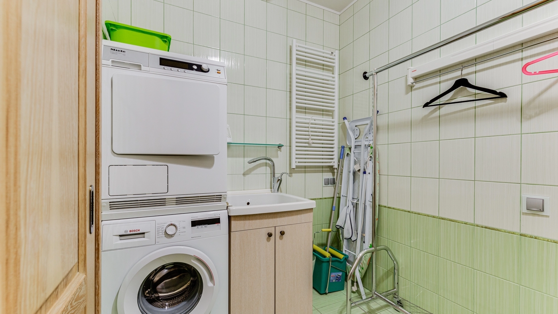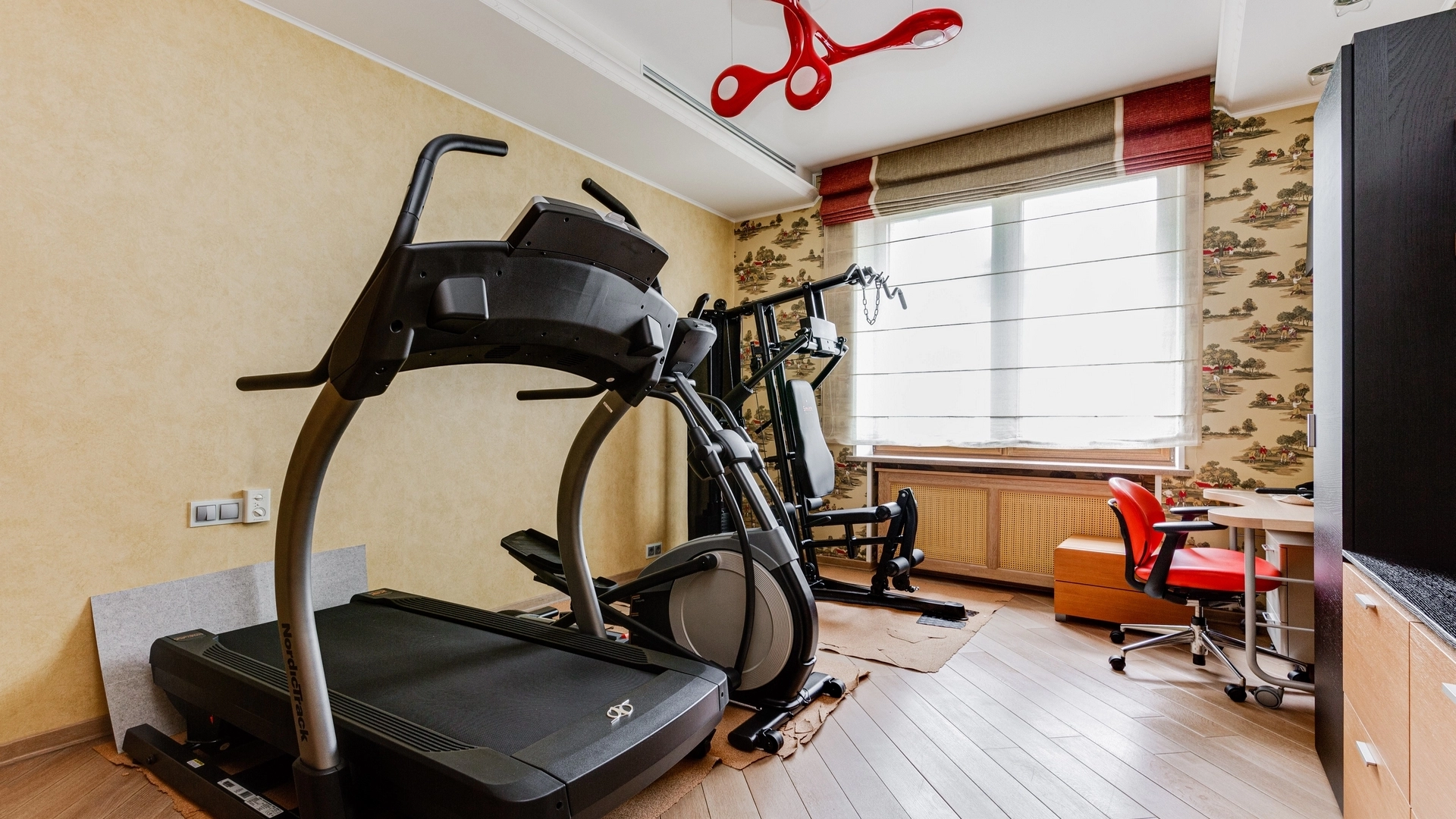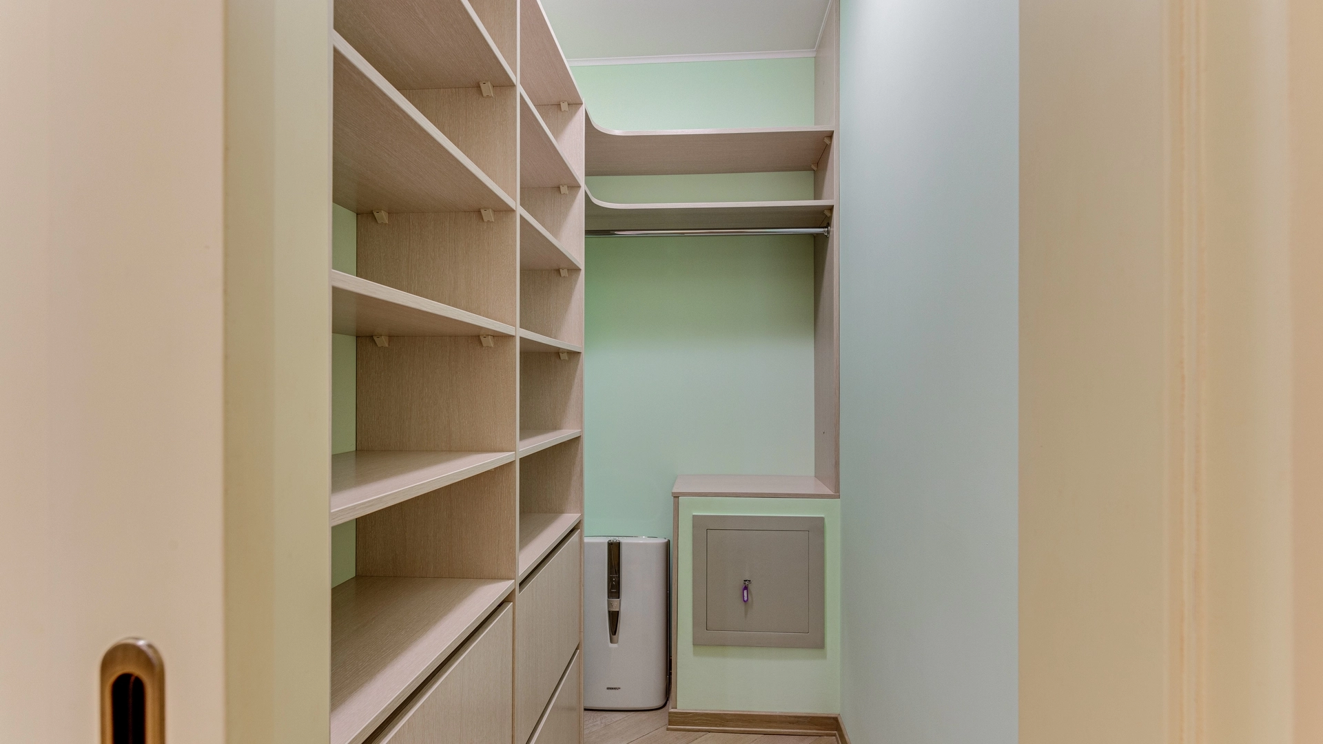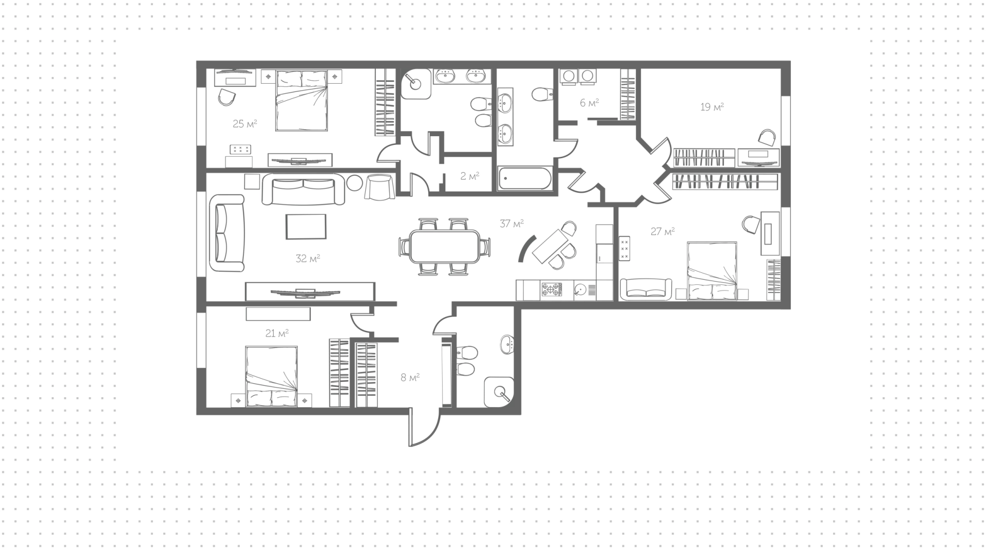 В центральной зоне квартиры — гостиная с кухней и столовой. По периметру расположены 4 спальни. Мастер-спальня с гардеробной и ванной комнатой. Отдельный блок с детской спальней, тренажёрным залом, ванной комнатой, постирочной и холлом. Ближе ко входу — гостевая спальня, санузел и гардеробная. За квартирой закреплено машиноместо в подземном паркинге.