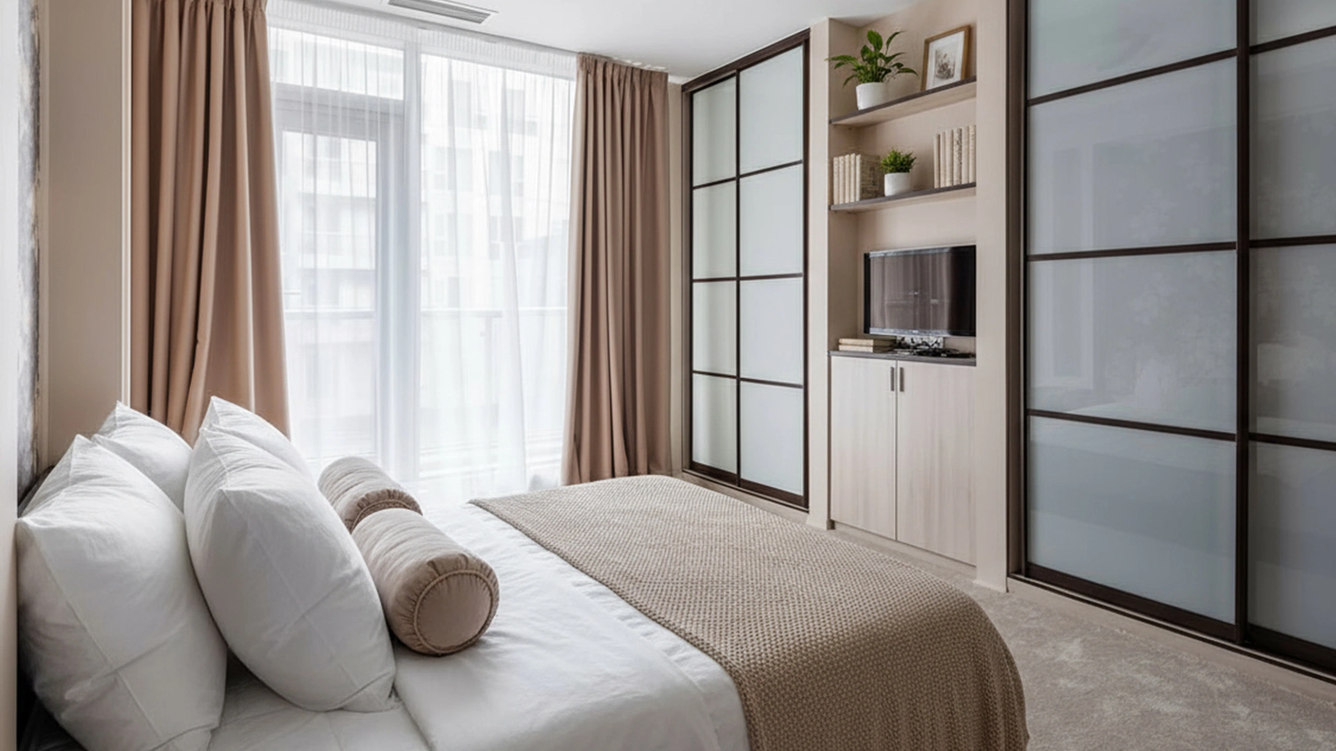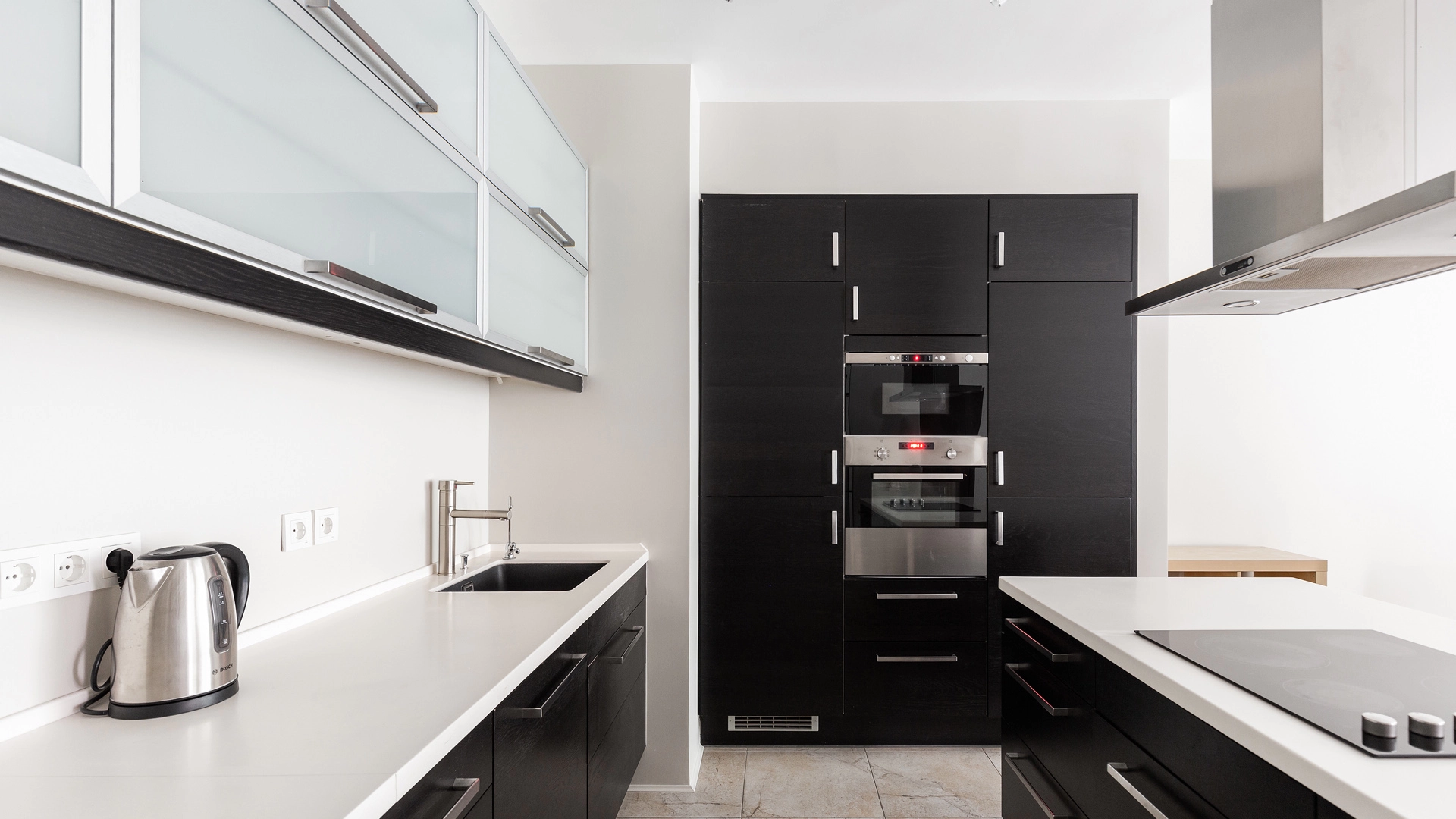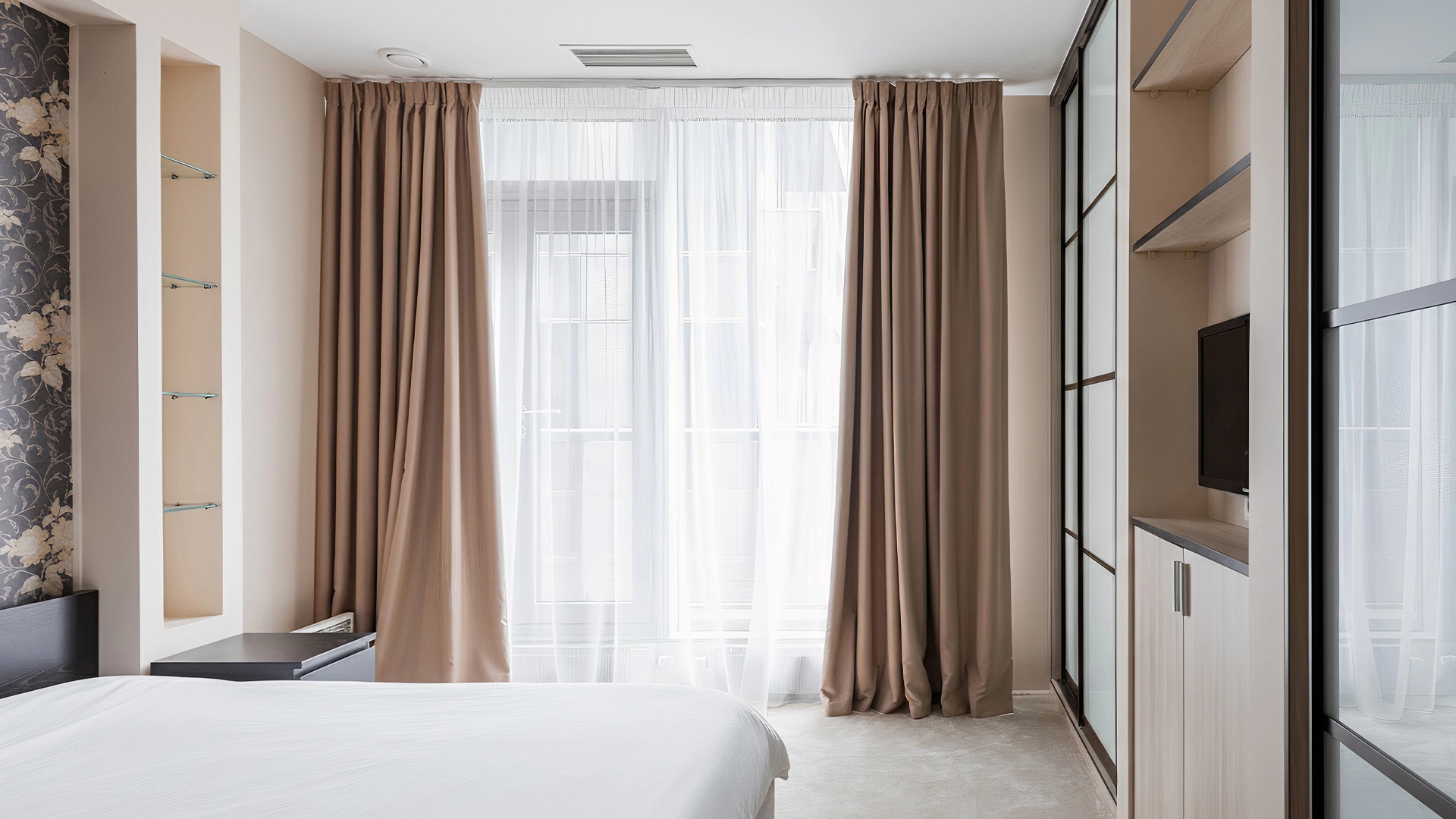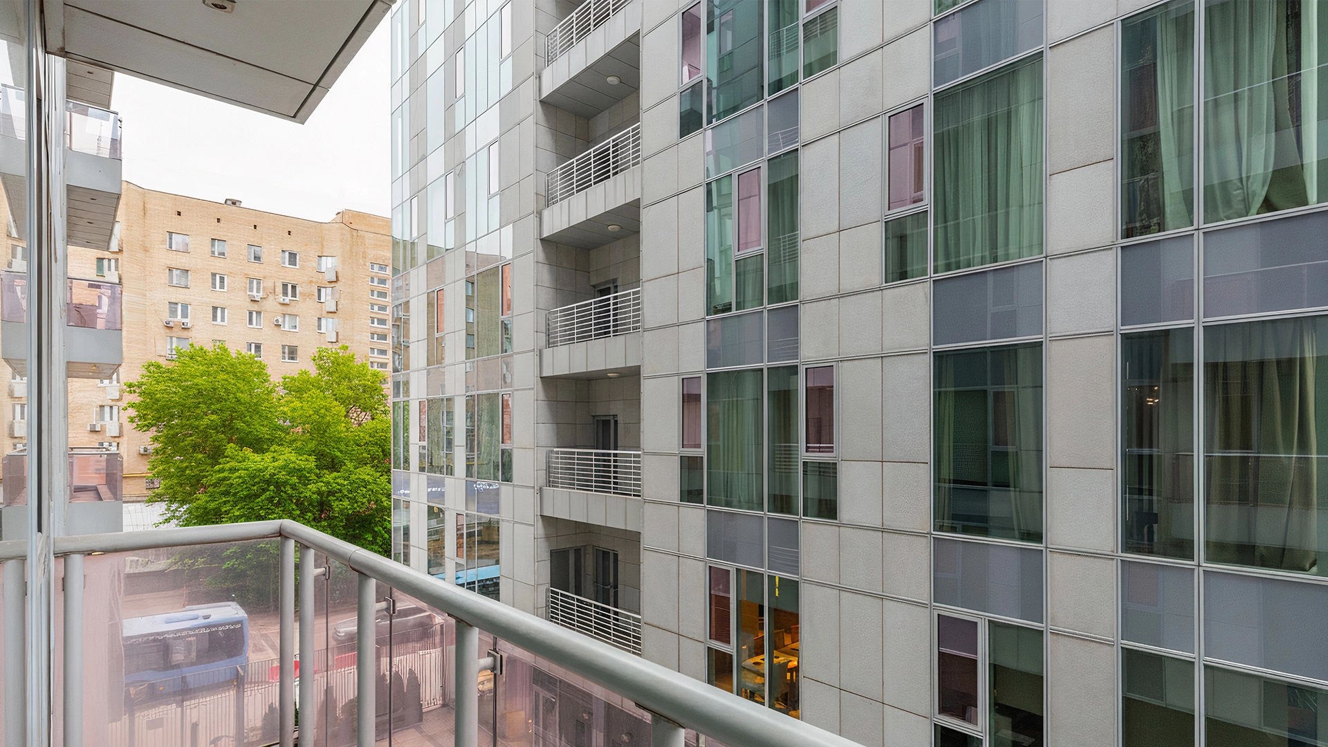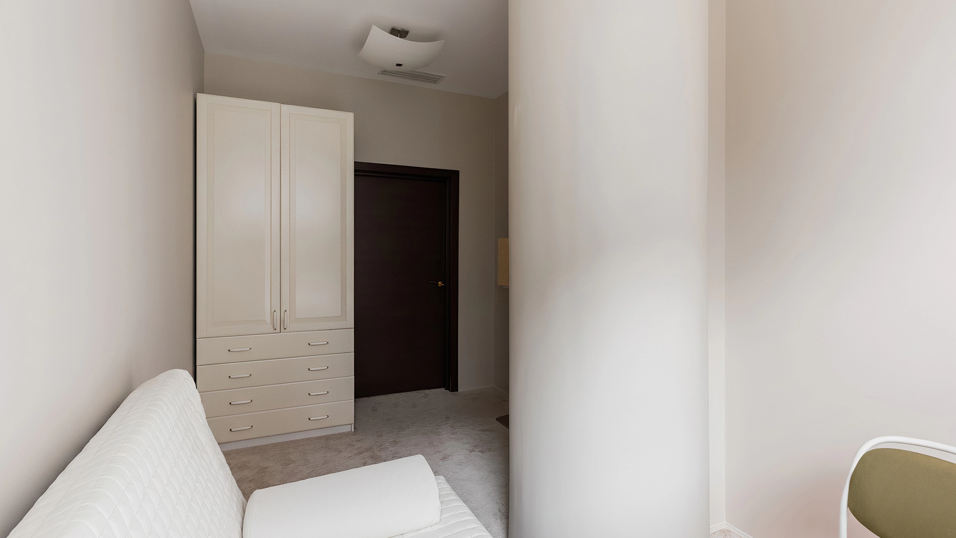 Просторная гостиная предоставлена мягкой мебелью и объединена с кухней, оснащённой бытовой техникой и столом-островом. У панорамного окна расположено кресло-качалка для отдыха. В квартире спланировали 2 уютные спальни, в одной из которых размещена двуспальная кровать и оборудованы встроенные шкафы. Дополнительно устроена гардеробная, два санузла и постирочная со стиральной и сушильной машинами. Из окон открываются виды на внутреннюю территорию комплекса.