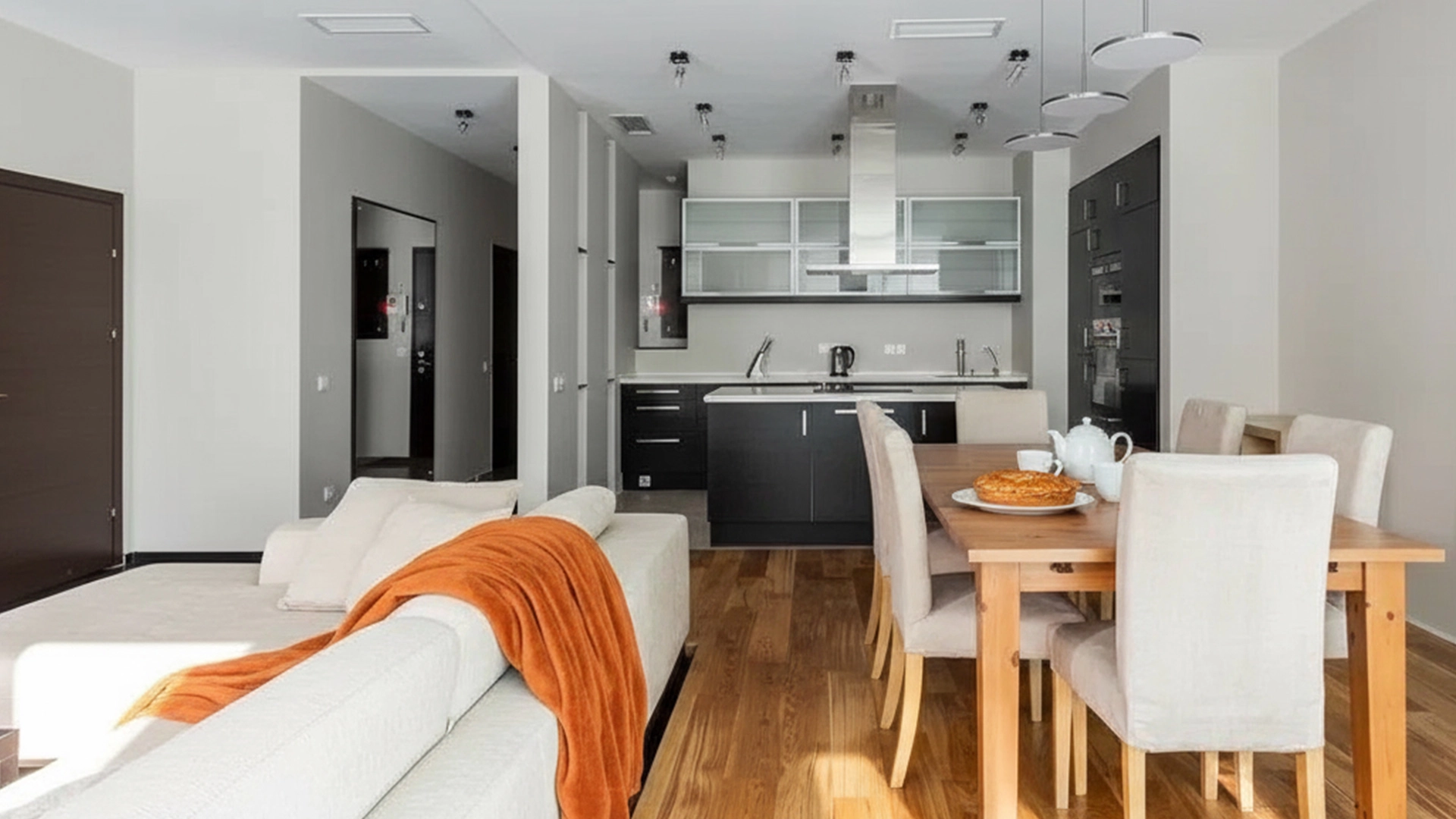 Светлая квартира с 2-мя спальнями общей площадью 112 м² расположена на 3 этаже комплекса премиум-класса в Тверском районе. В квартире выполнен дизайнерский ремонт, полы выложены инженерной доской благородного цвета. Интерьер оформлен в благородном молочном тоне и декорирован лаконичными картинами.