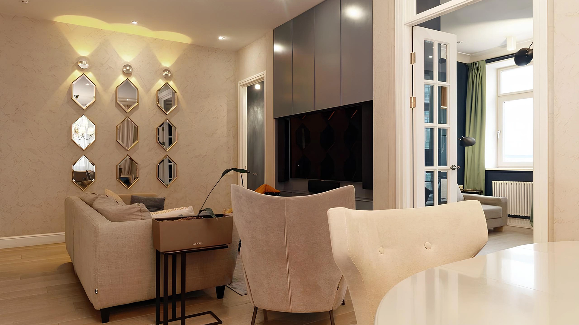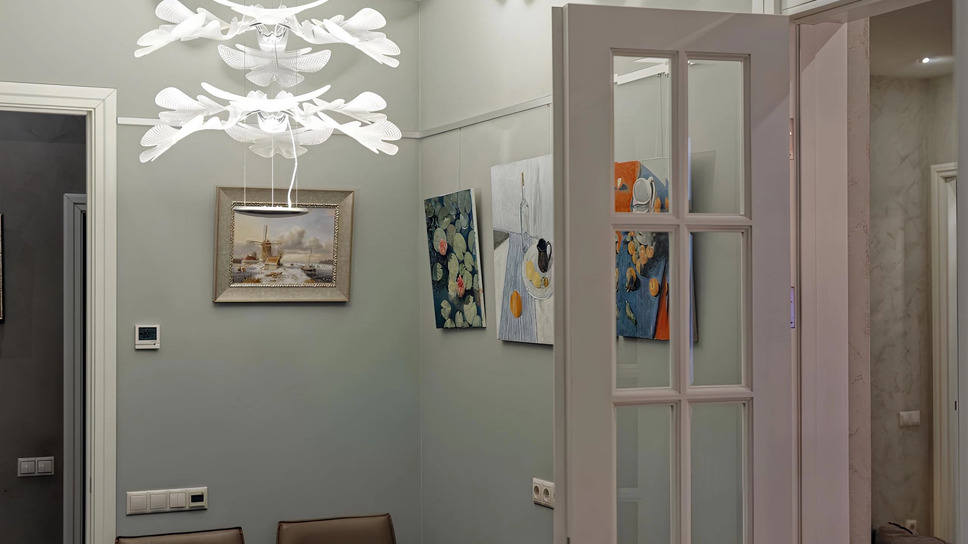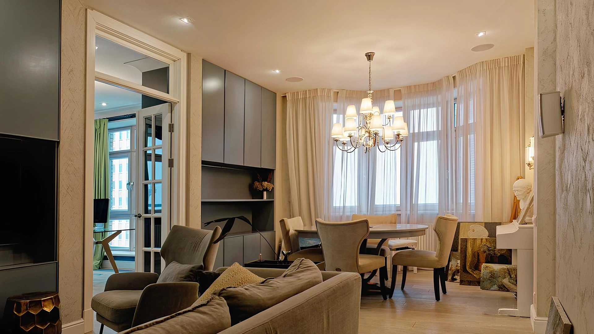 Просторная квартира площадью 142 м² в комплексе «Алые Паруса» на набережной Москвы-реки. Квартира расположена на 23-м этаже. Выполнен дизайнерский ремонт в стиле «современной классики». В отделке использованы премиальные материалы, интерьер дополняют картины и различные предметы декора. Большие окна и потолки высотой 3,1 метра наполняют пространство светом. Окна ориентированы на 3 стороны света, открываются виды на город и в благоустроенный двор.