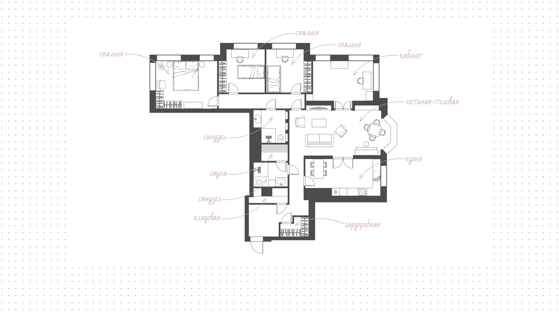 Функциональная планировка включает гостиную-столовую, кухню с обеденной зоной, кабинет, спальный блок с 3-мя спальнями и ванной комнатой, гостевой санузел с электрической сауной, гардеробную, кладовую, холл. Квартира полностью меблирована и оборудована бытовой техникой Miele и Bosch, установлена сантехника Villeroy&Boch. В стоимость включено машиноместо в подземном паркинге.