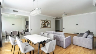 Просторная квартира площадью 212 м² в комплексе «Остров Фантазий» на западе Москвы. Выполнен новый современный ремонт с использованием премиальных материалов. Интерьер оформлен в лаконичных светлых тонах. Большие окна и потолки высотой 3 метра наполняют пространство светом. Окна ориентированы на 3 стороны света, открываются виды на озеро и благоустроенную территорию двора.