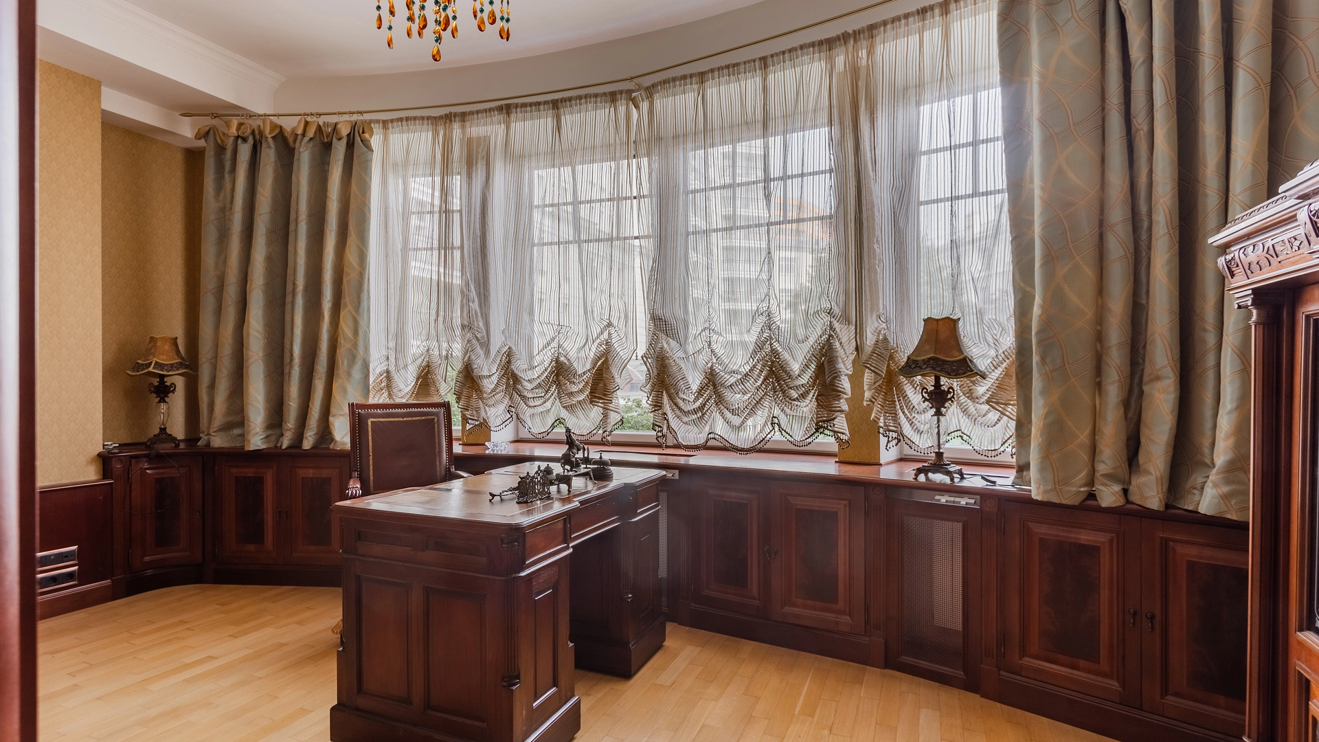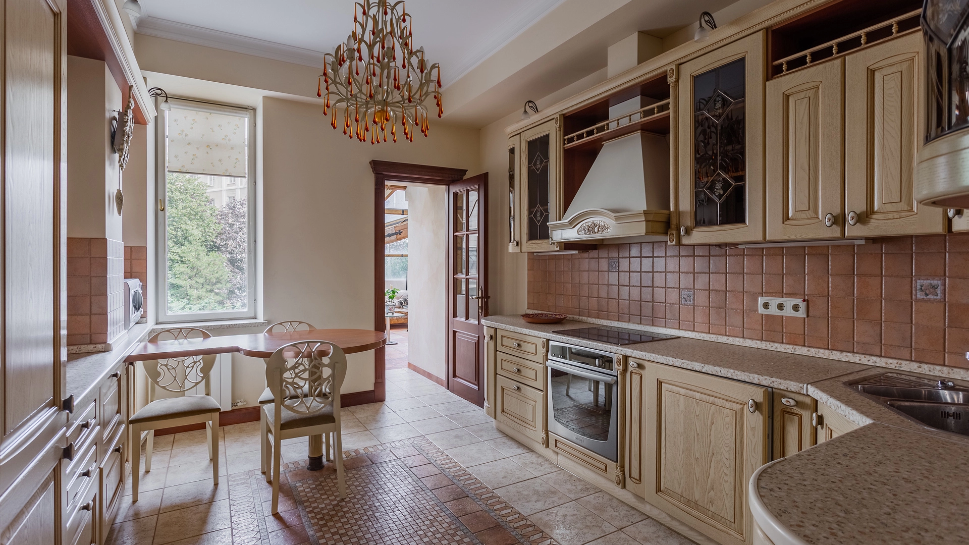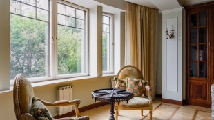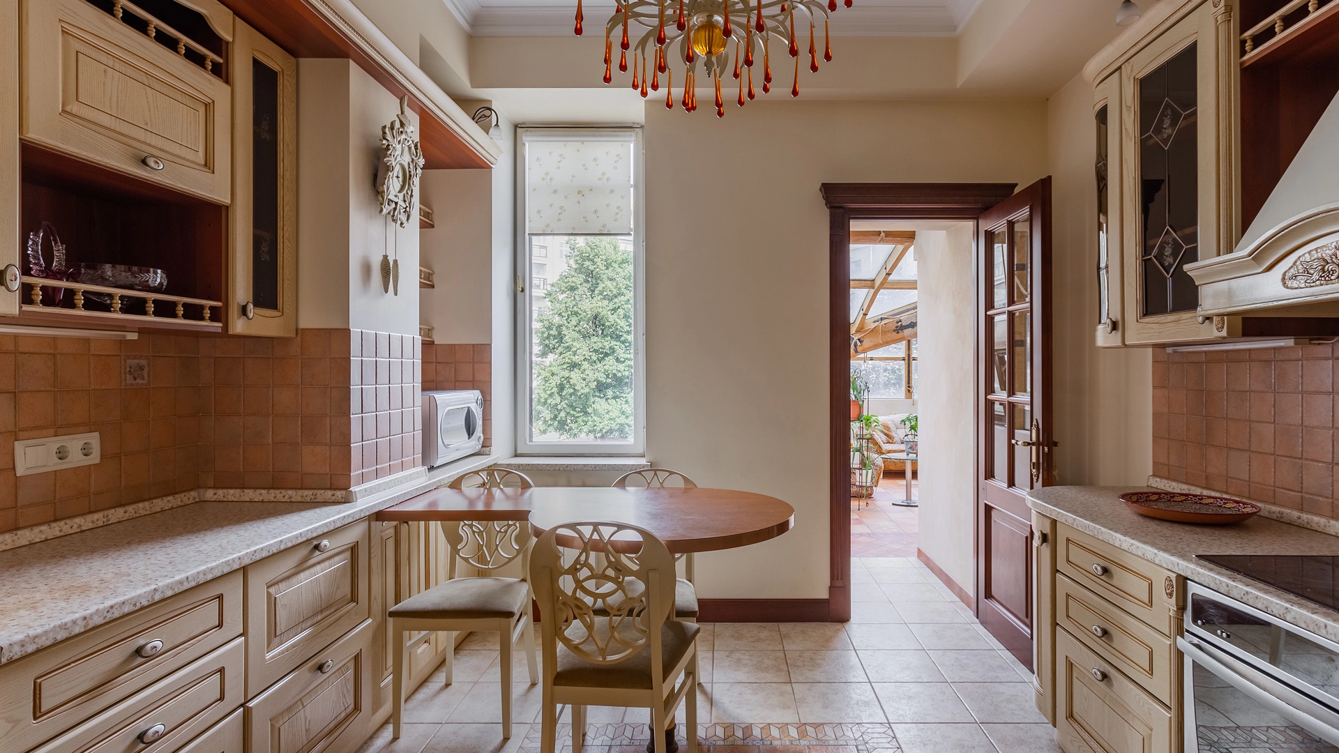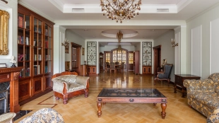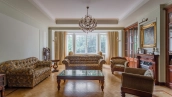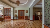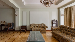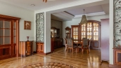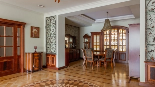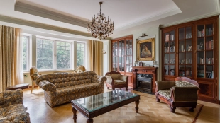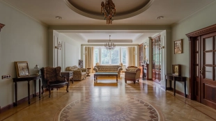 Квартира площадью 241 м² с зимним садом в комплексе «Венский дом» на 2 этаже. Выполнен ремонт в классическом стиле, в отделке использовано натуральное дерево и камень. На полу выложен светлый паркет с плетёным узором. Стены в спокойных тонах украшены картинами и светильниками в виде подсвечников. Квартира полностью меблирована, почти вся мебель из тёмного дерева. В гостиной с витражными дверьми спланирована зона отдыха у камина, столовая зона с круглым столом на 6 персон. Оборудована кухня цвета слоновой кости с бытовой техникой. На застеклённой террасе обустроен зимний сад с мягкими диванами в леопардовой обивке.