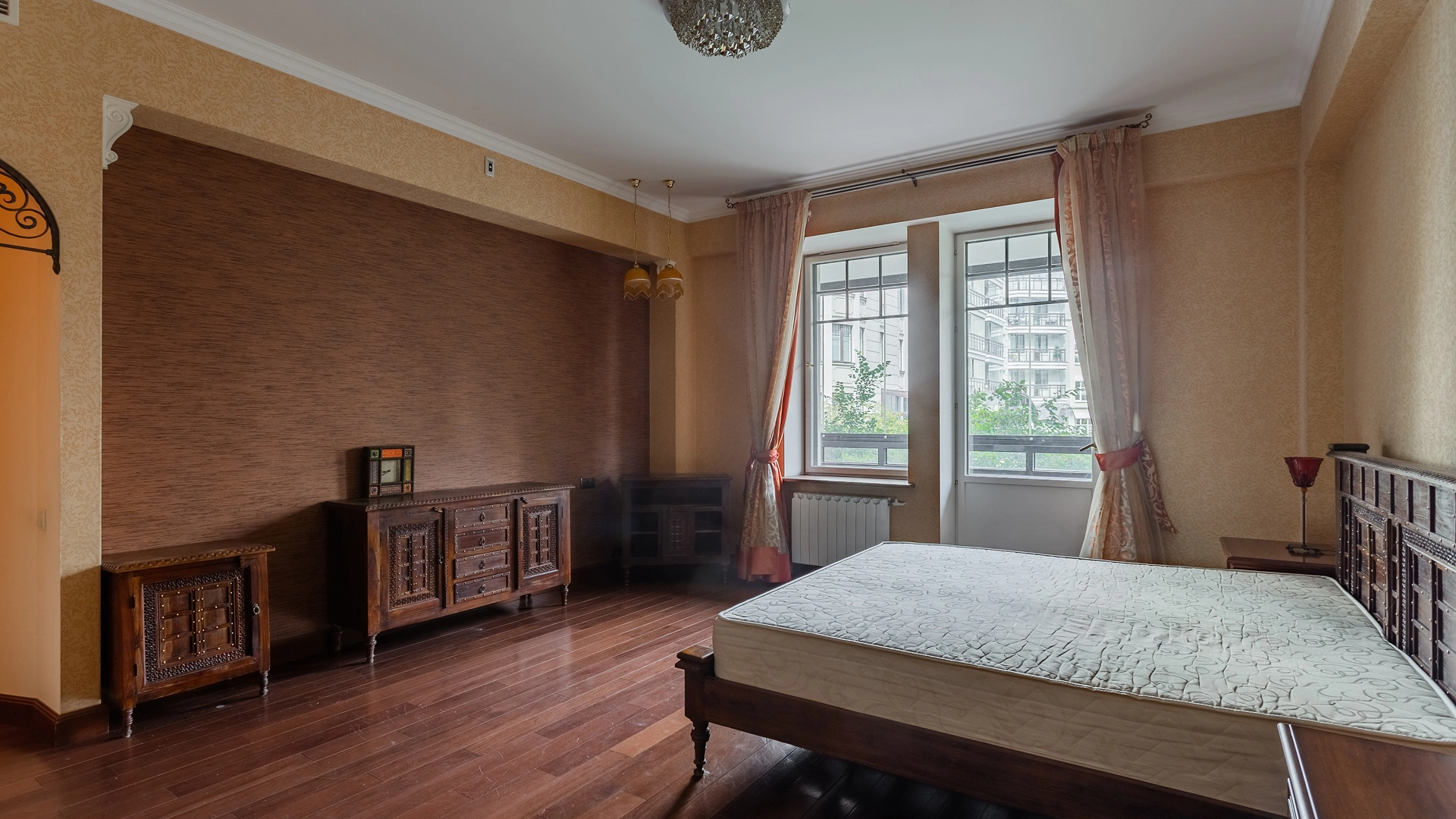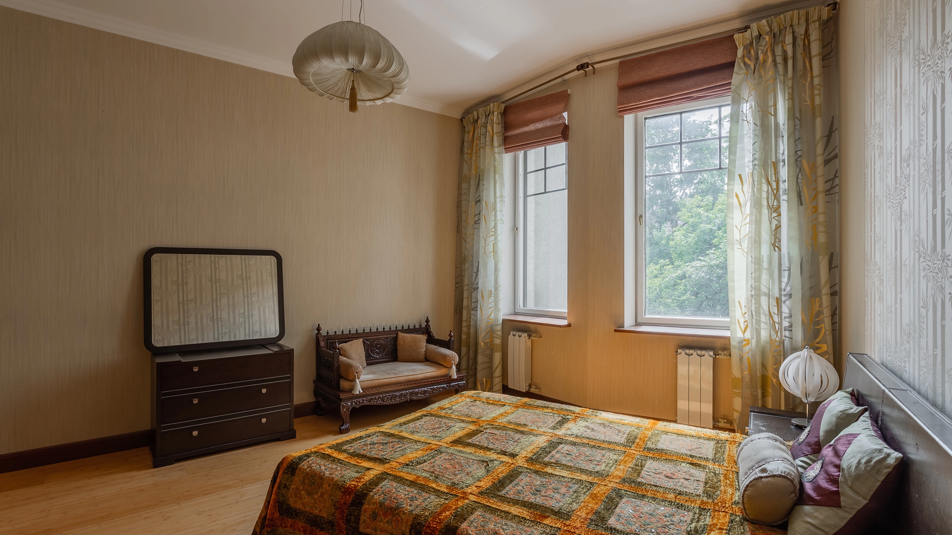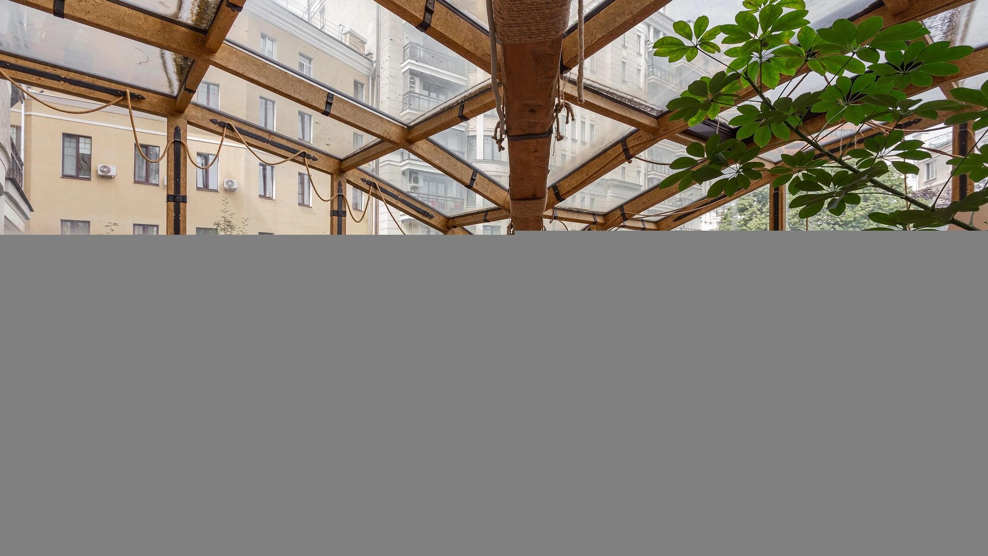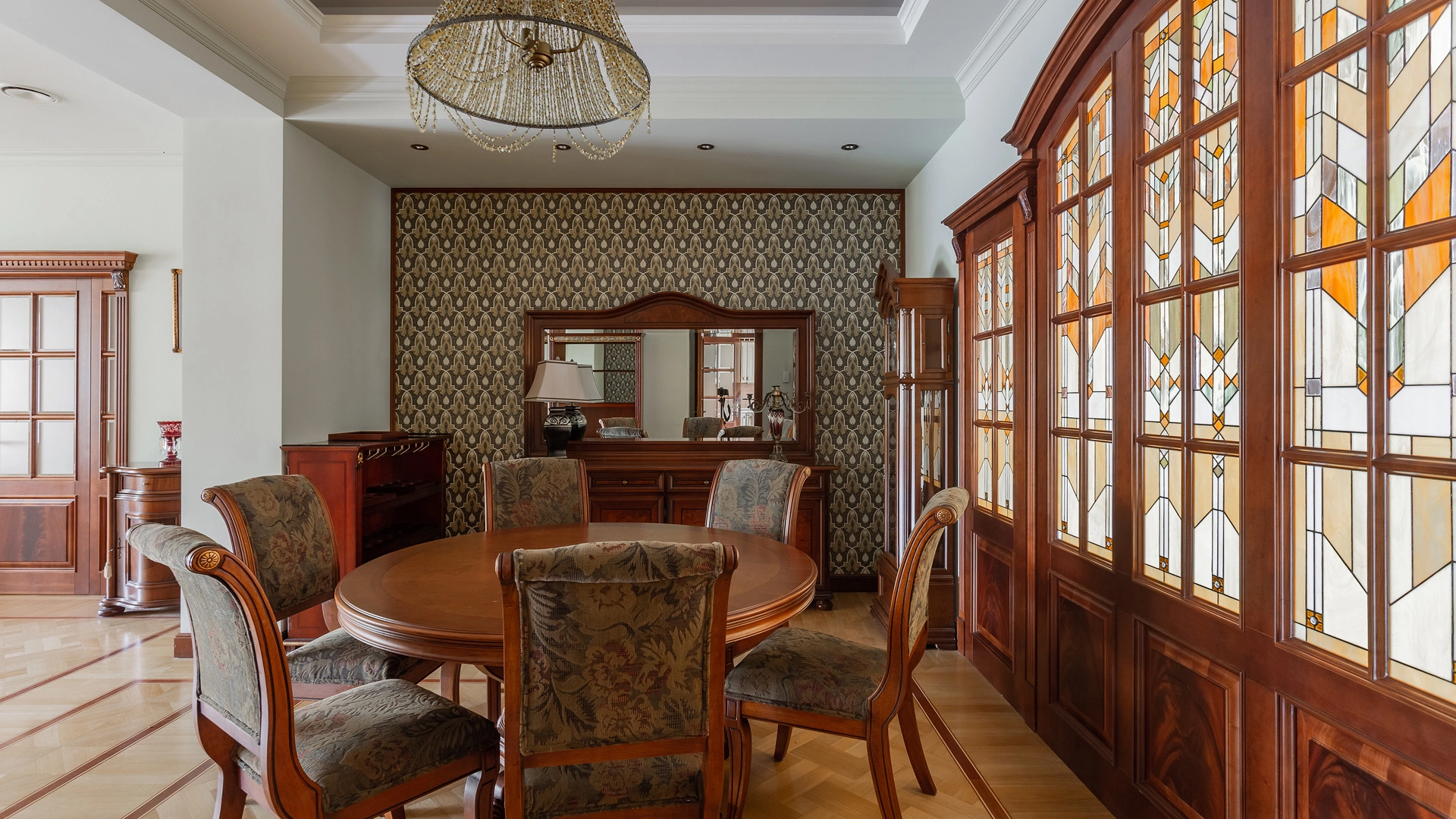 Квартира площадью 241 м² с зимним садом в комплексе «Венский дом» на 2 этаже. Выполнен ремонт в классическом стиле, в отделке использовано натуральное дерево и камень. На полу выложен светлый паркет с плетёным узором. Стены в спокойных тонах украшены картинами и светильниками в виде подсвечников. Квартира полностью меблирована, почти вся мебель из тёмного дерева. В гостиной с витражными дверьми спланирована зона отдыха у камина, столовая зона с круглым столом на 6 персон. Оборудована кухня цвета слоновой кости с бытовой техникой. На застеклённой террасе обустроен зимний сад с мягкими диванами в леопардовой обивке.